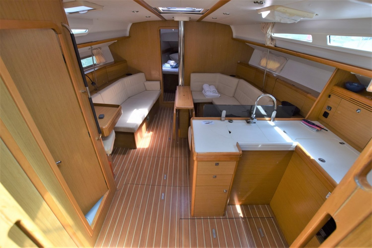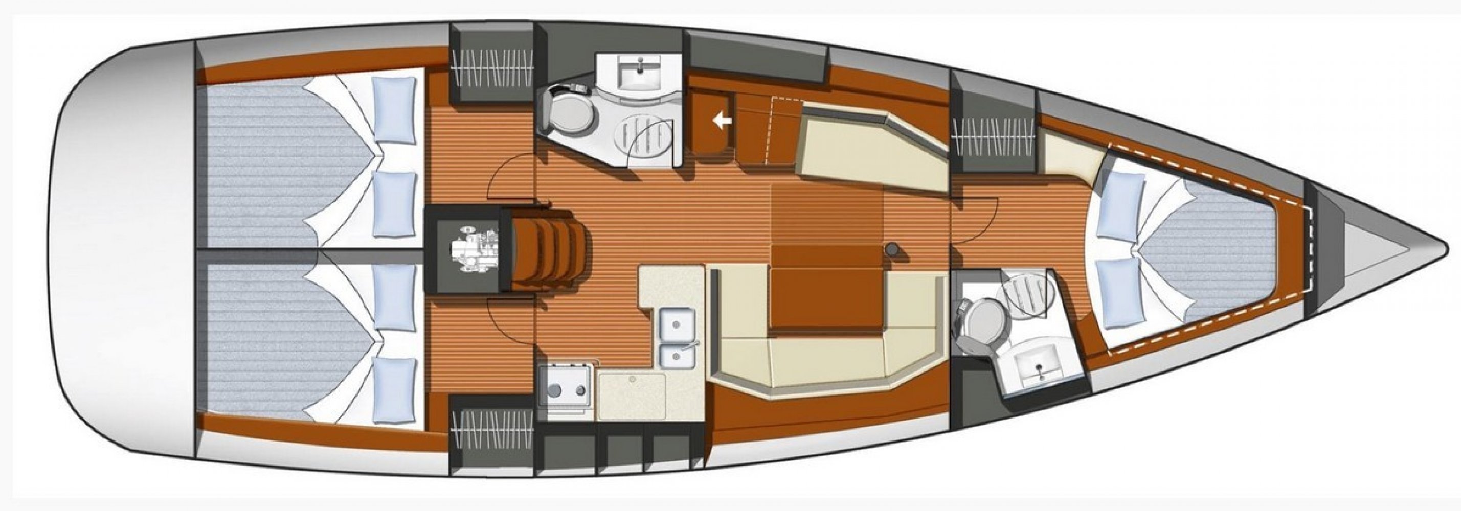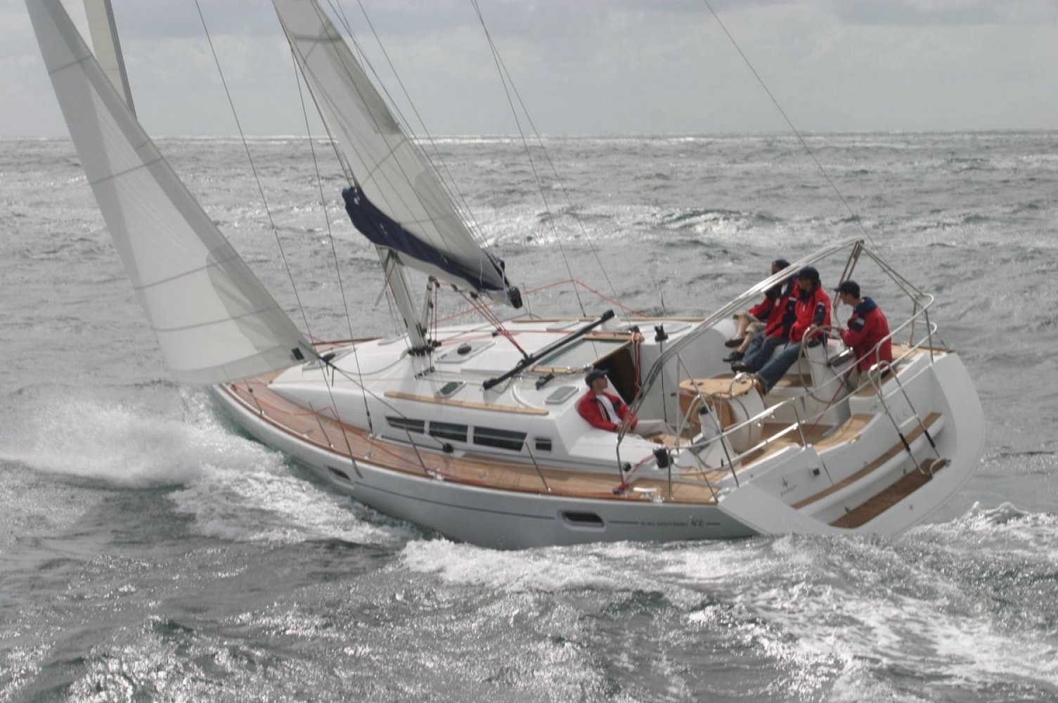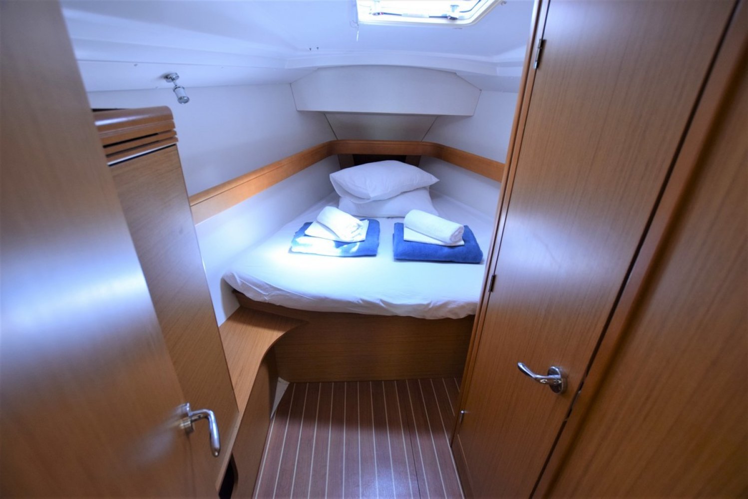 Equipment Furling genoa Lazy Jacks Lazy bag Bimini Sprayhood Cockpit table Teak in cockpit Bow thruster Autopilot Tri data (depth, speed, wind) Life raft Battery charger Radio/CD player Double berth compelement to saloon Electric windlass Anchoring kit Mooring kit Stern cockpit shower Shore power Heating
