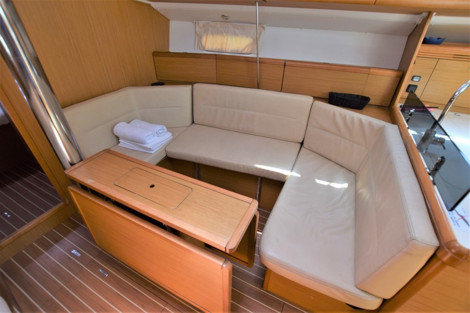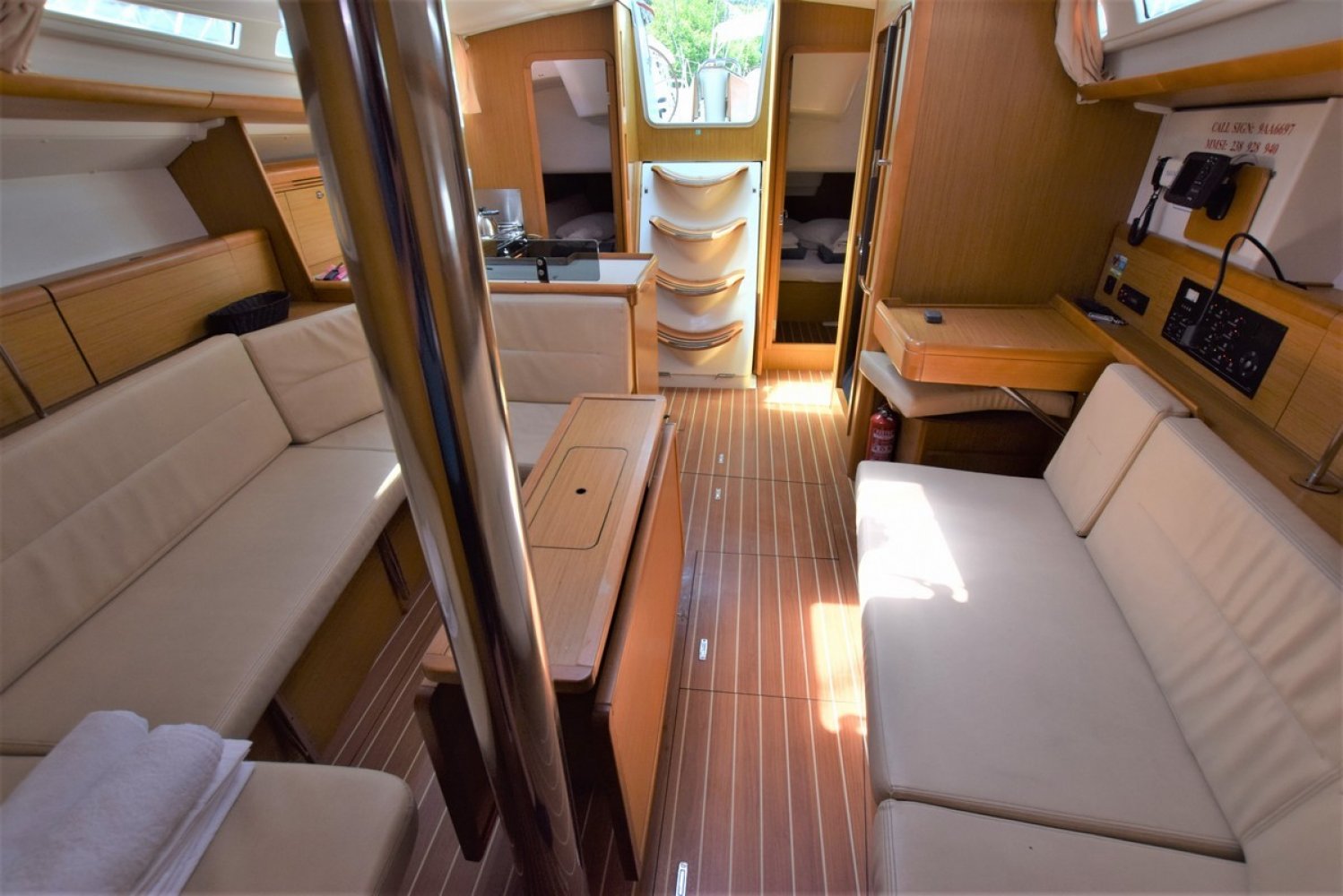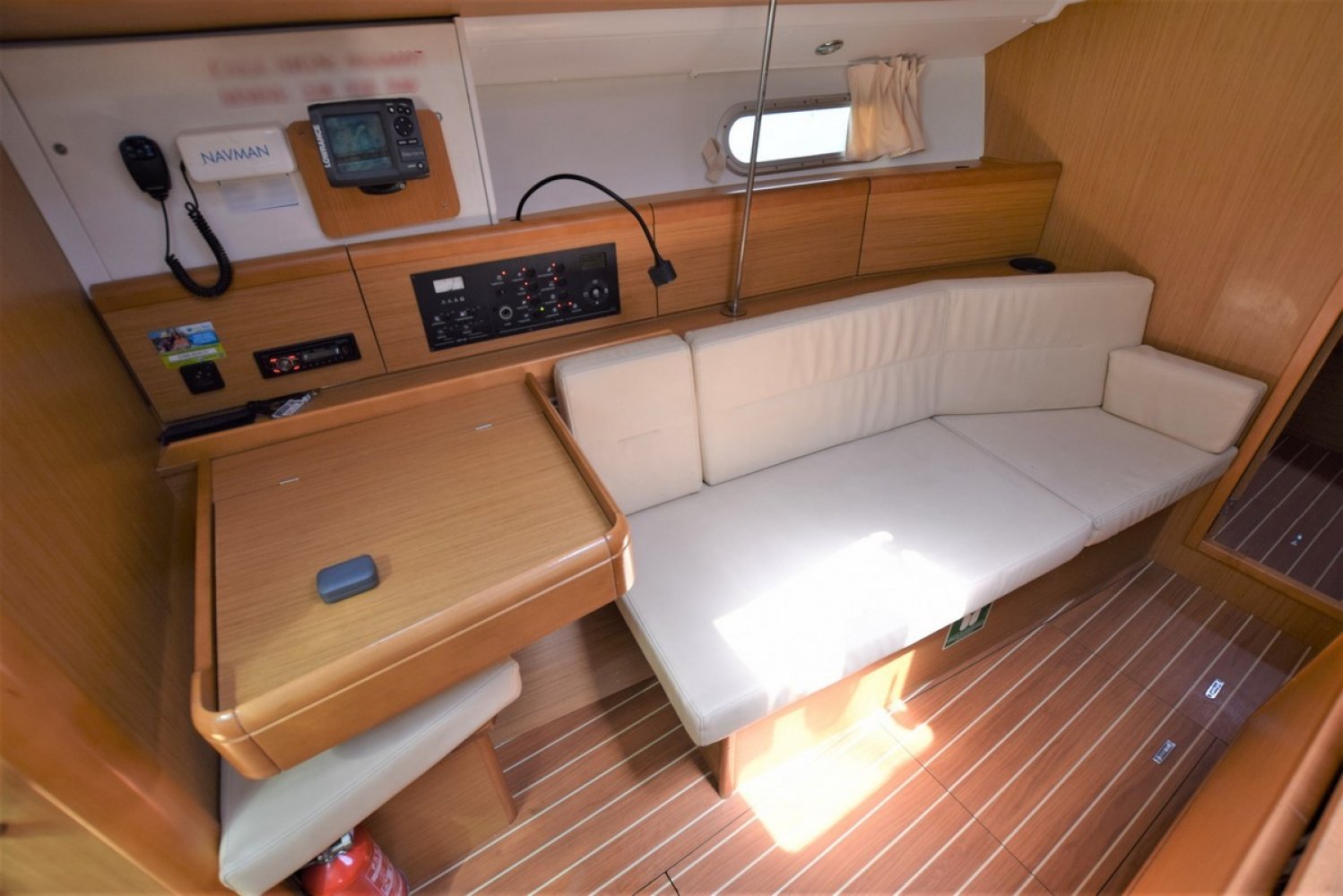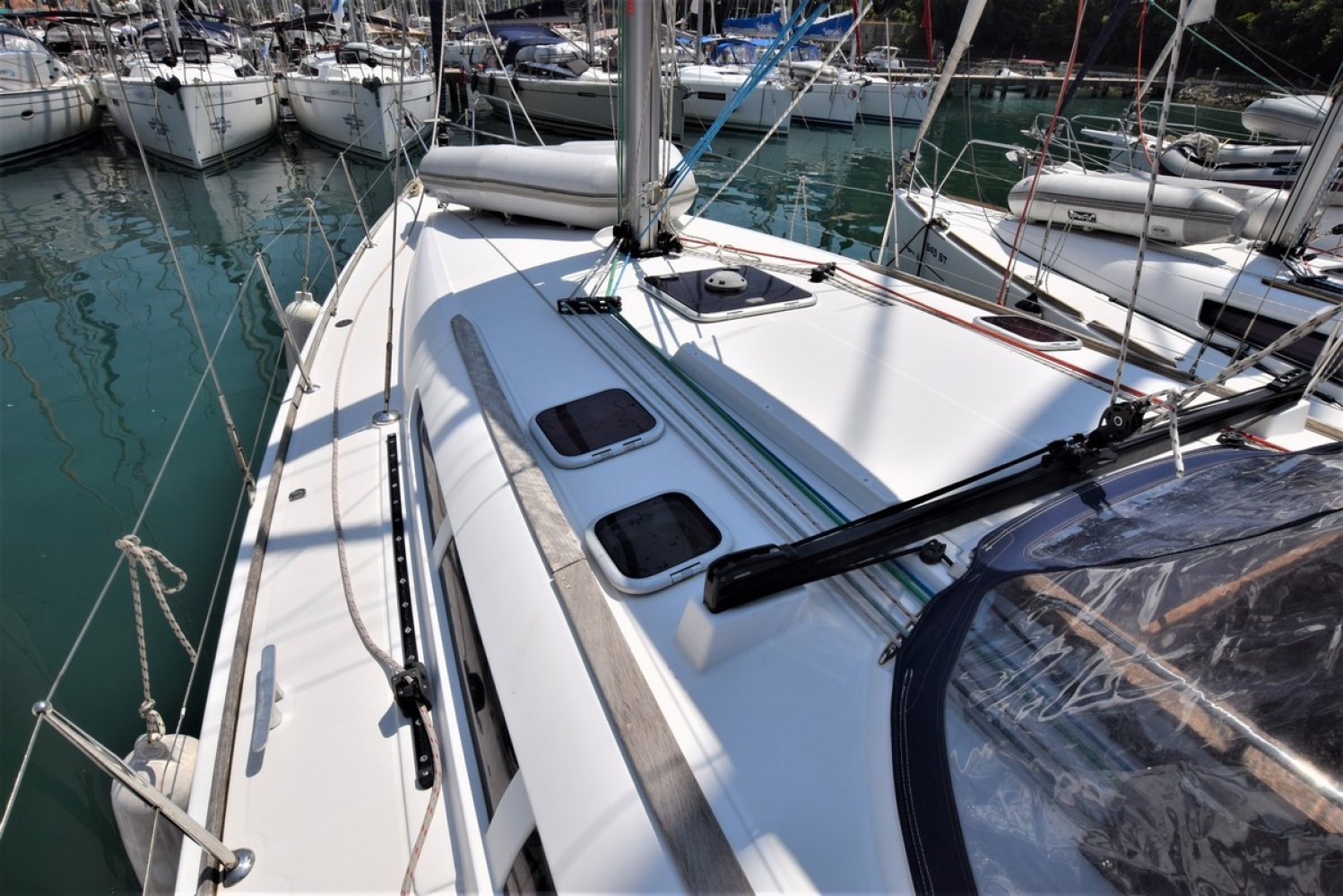 Equipment Furling genoa Lazy Jacks Lazy bag Bimini Sprayhood Cockpit table Teak in cockpit Bow thruster Autopilot Tri data (depth, speed, wind) Life raft Battery charger Radio/CD player Double berth compelement to saloon Electric windlass Anchoring kit Mooring kit Stern cockpit shower Shore power Heating