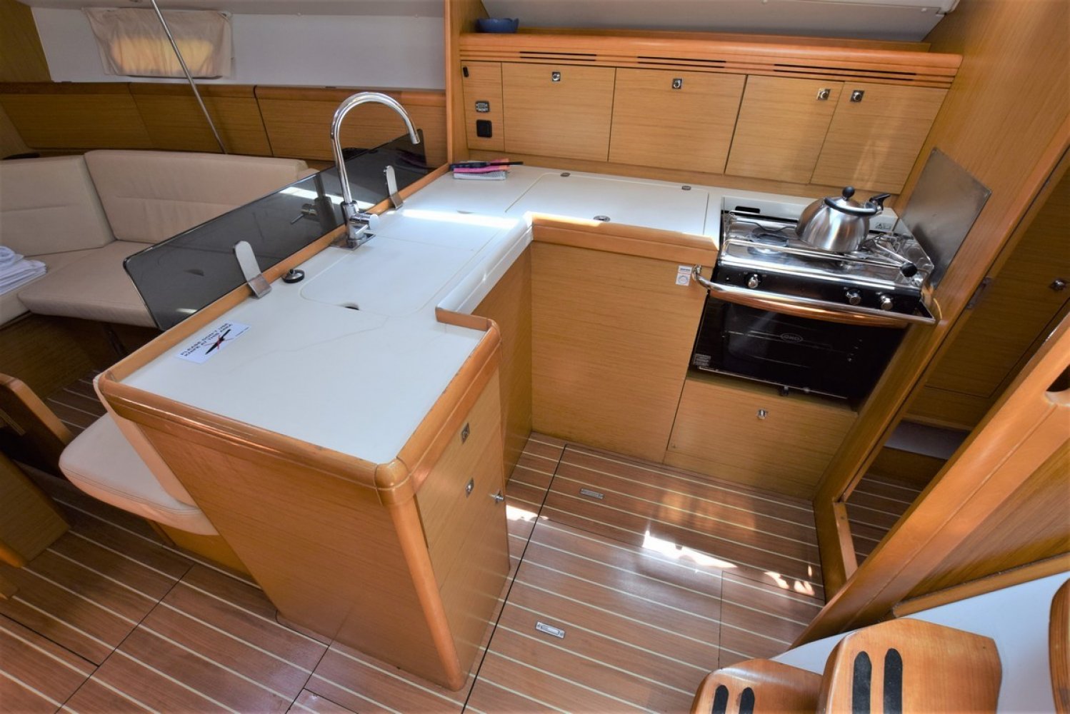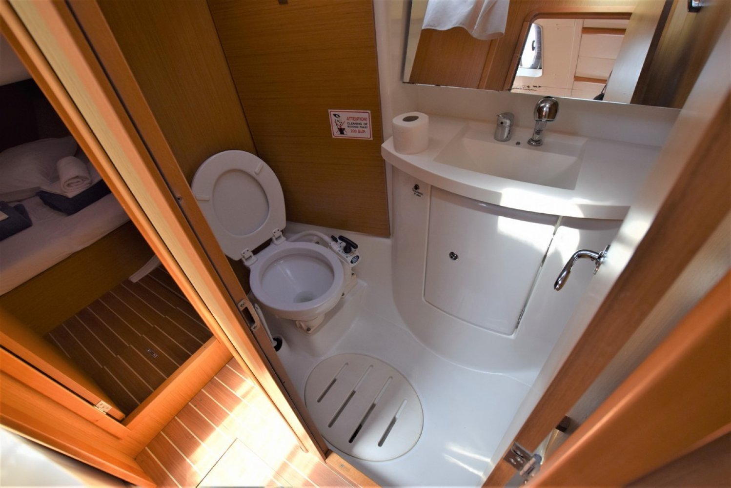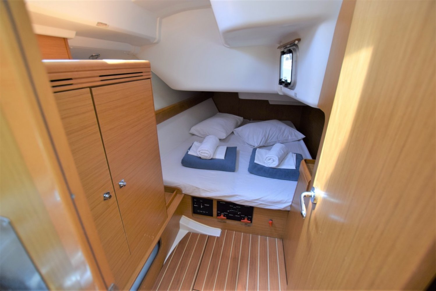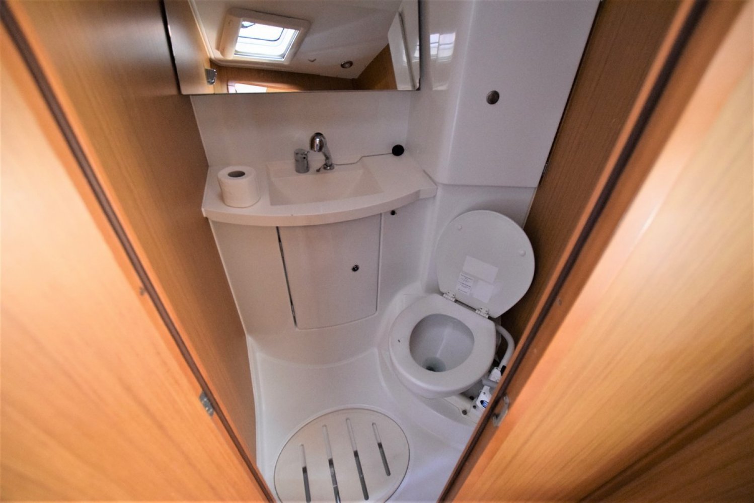 Equipment Furling genoa Lazy Jacks Lazy bag Bimini Sprayhood Cockpit table Teak in cockpit Bow thruster Autopilot Tri data (depth, speed, wind) Life raft Battery charger Radio/CD player Double berth compelement to saloon Electric windlass Anchoring kit Mooring kit Stern cockpit shower Shore power Heating
