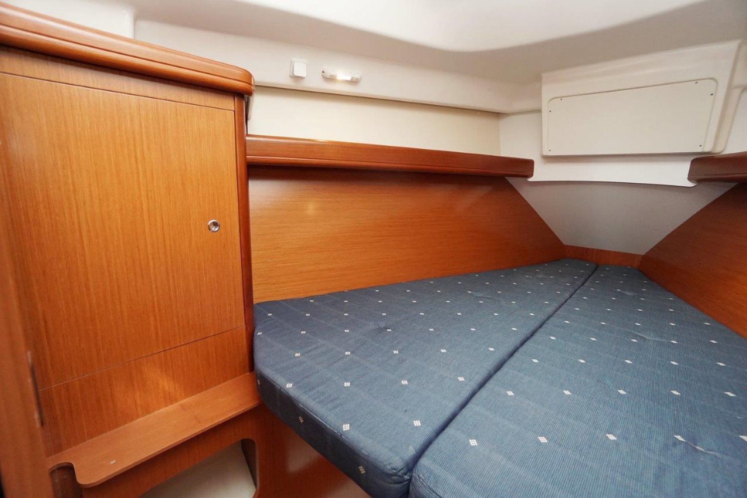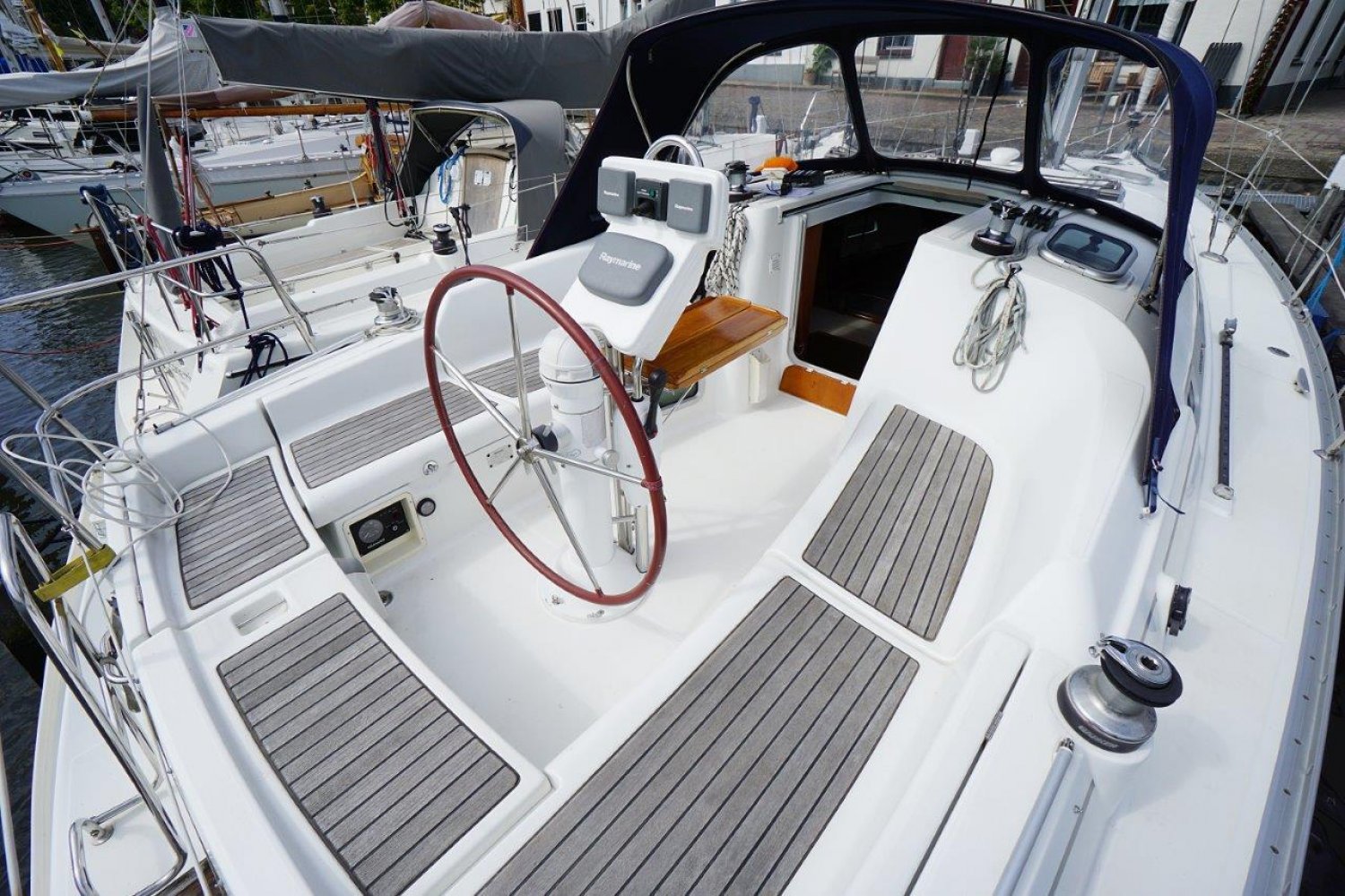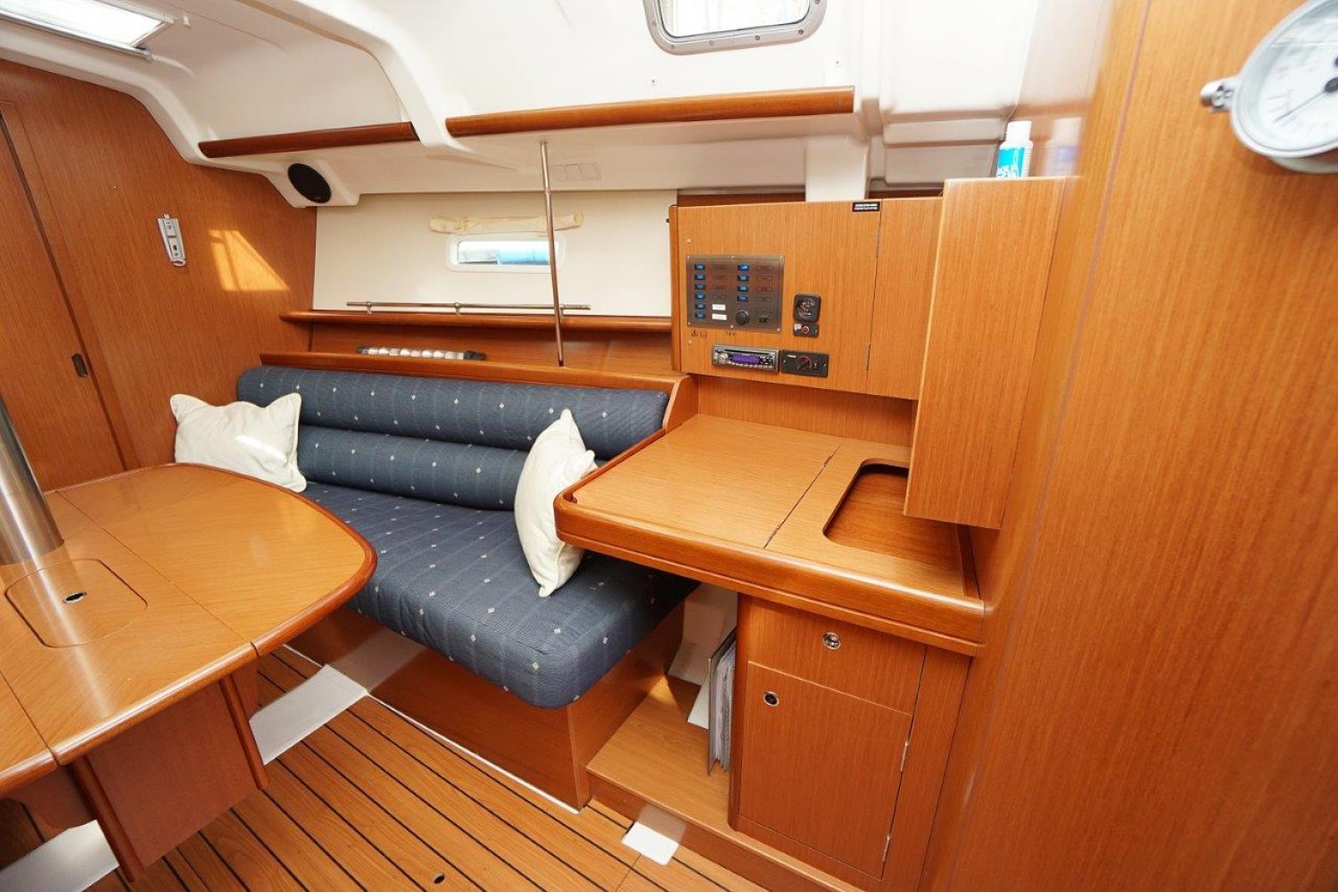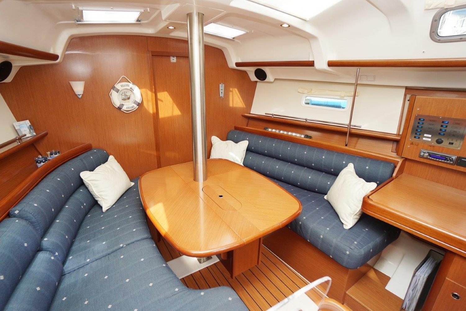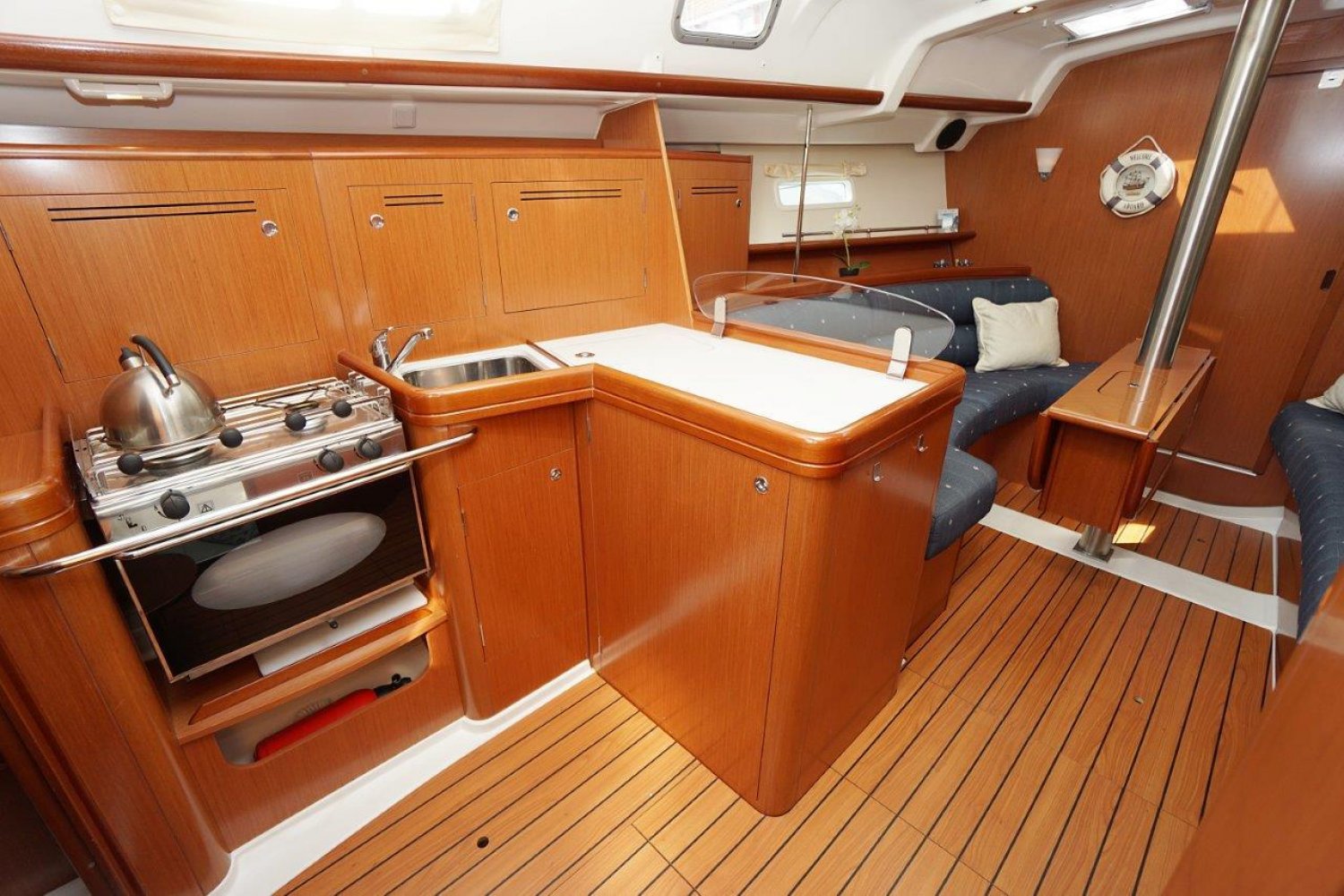 Eenmaal aan boord valt direct op dat de gangboorden breed zijn en een prettige doorgang bieden, vanuit de ruime kuip heeft u een mooi overzicht. Het stuurwiel is 90 graden te roteren en de kuipbank klapt omhoog, zo is er een eenvoudige doorgang naar het zwemplatform. Binnen treft u een licht, en ruim interieur aan. Met veel stahoogte! Er zijn twee ruime hutten, komplete kombuis en een grote natte cel. Een echt comfortabel schip!