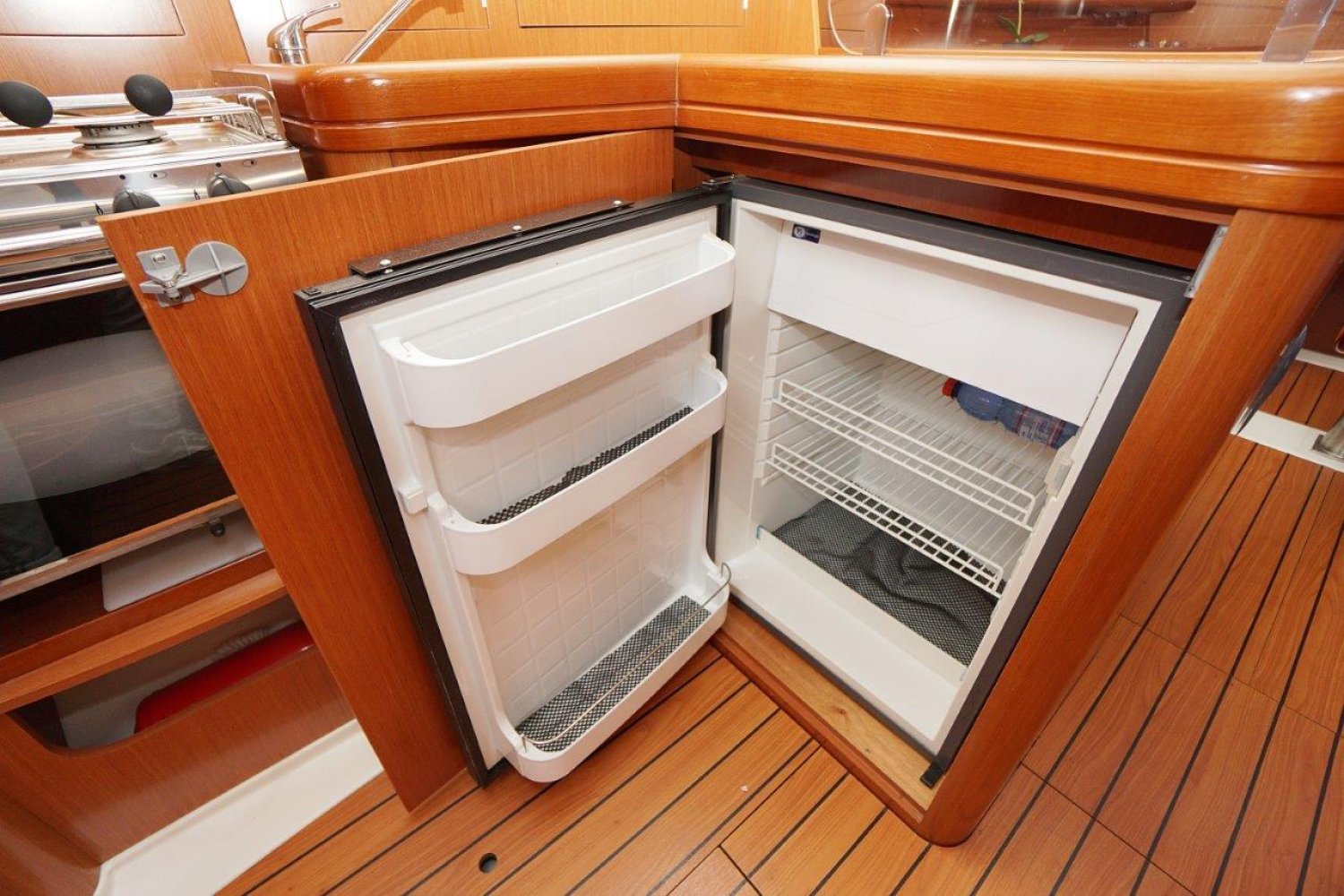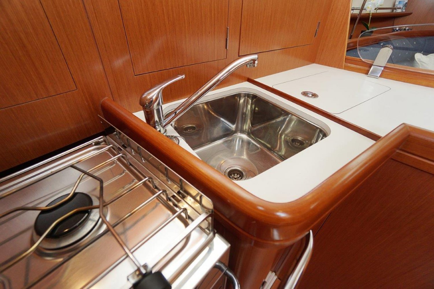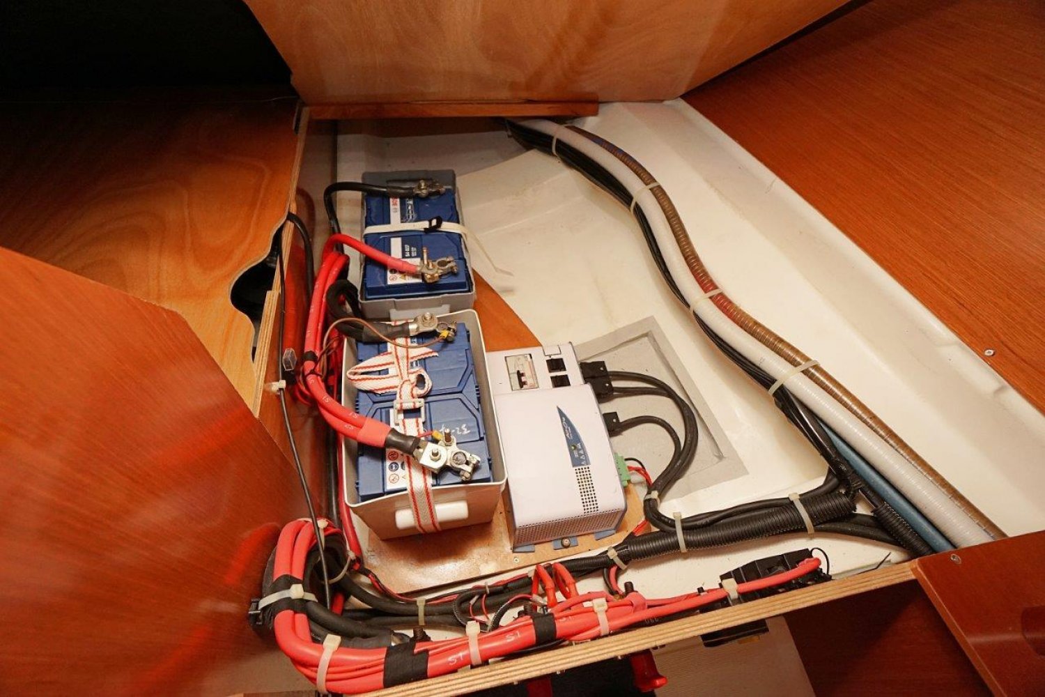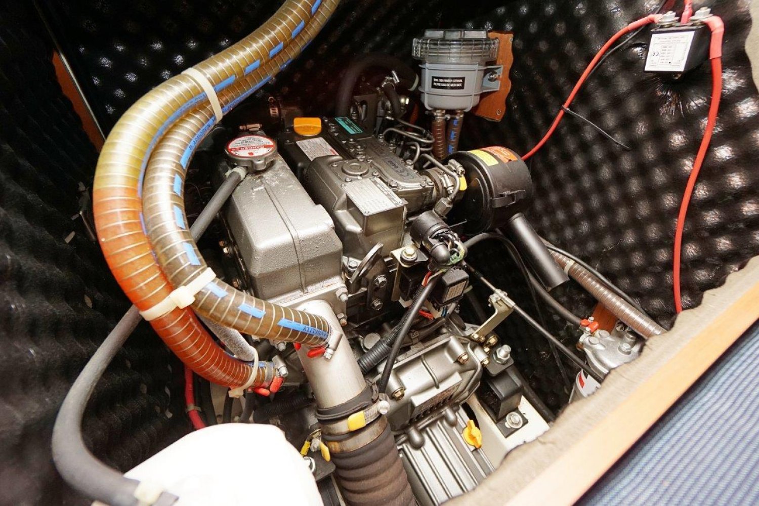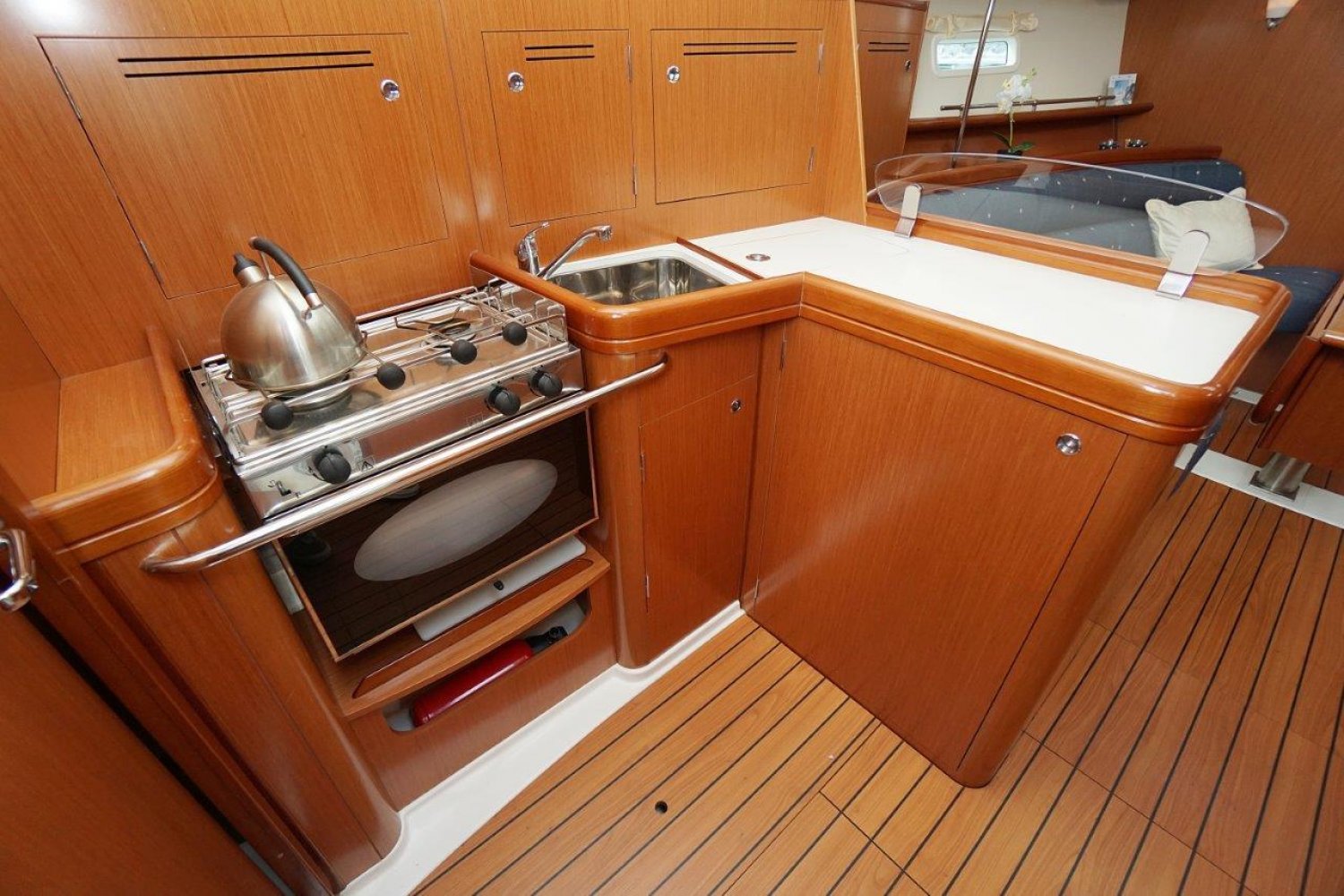 Eenmaal aan boord valt direct op dat de gangboorden breed zijn en een prettige doorgang bieden, vanuit de ruime kuip heeft u een mooi overzicht. Het stuurwiel is 90 graden te roteren en de kuipbank klapt omhoog, zo is er een eenvoudige doorgang naar het zwemplatform. Binnen treft u een licht, en ruim interieur aan. Met veel stahoogte! Er zijn twee ruime hutten, komplete kombuis en een grote natte cel. Een echt comfortabel schip!