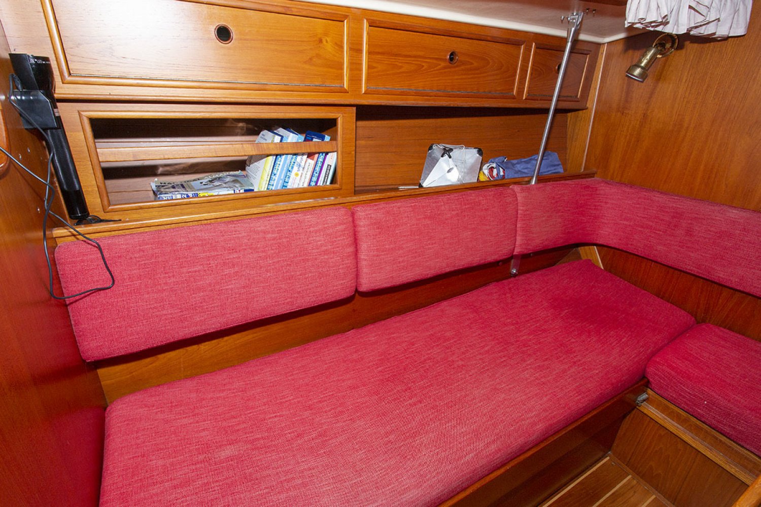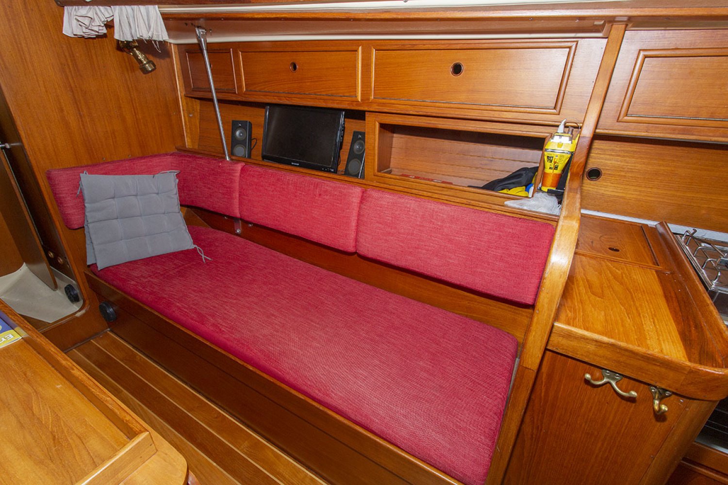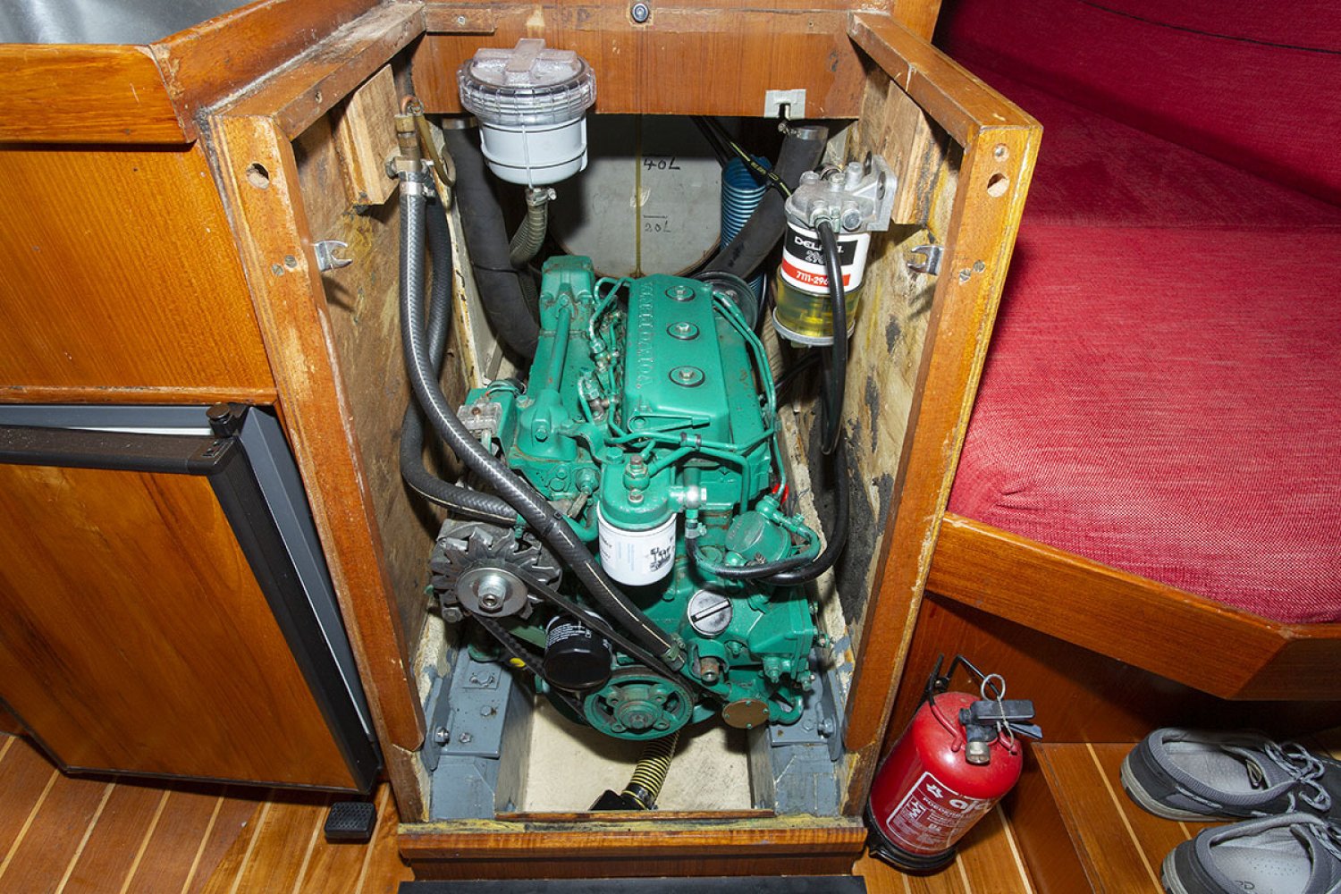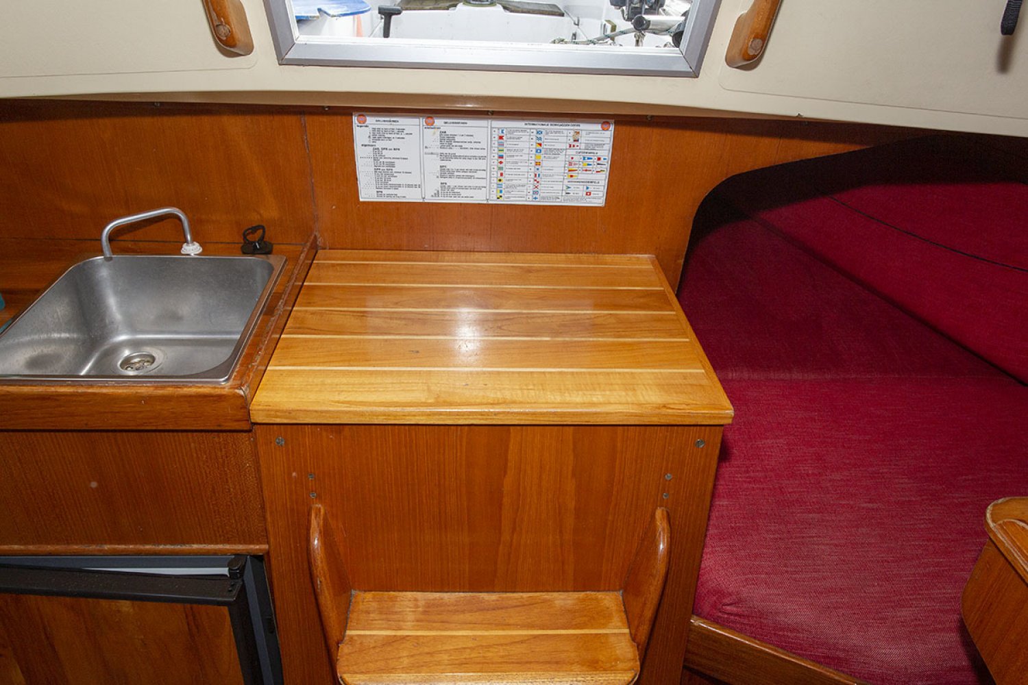 Het interieur oogt knus met het gelakte hout en de rode stoffering. Midscheeps is een zithoek waar u na een tocht lekker kunt nagenieten.  Aan stuurboord is een L-vormige kombuis met 2-pits kooktoestel, spoelbak, oven en koelkast. Er is voldoende bergruimte voor proviand. Aan bakboord treft u de navigatiehoek met de benodigde navigatie-apparatuur. Voor is een hut met dubbel bed, en er is nog een loodskooi achter.  Verder nog een natte cel met toilet, wastafel en bergruimte. De 28 pk Volvo Penta motor is in 2011 gereviseerd, evenals de keerkoppeling.