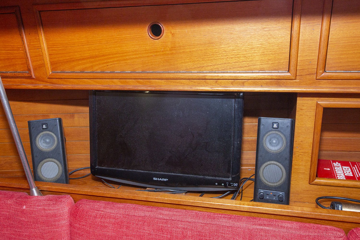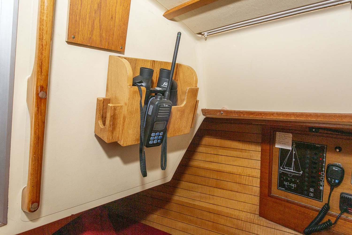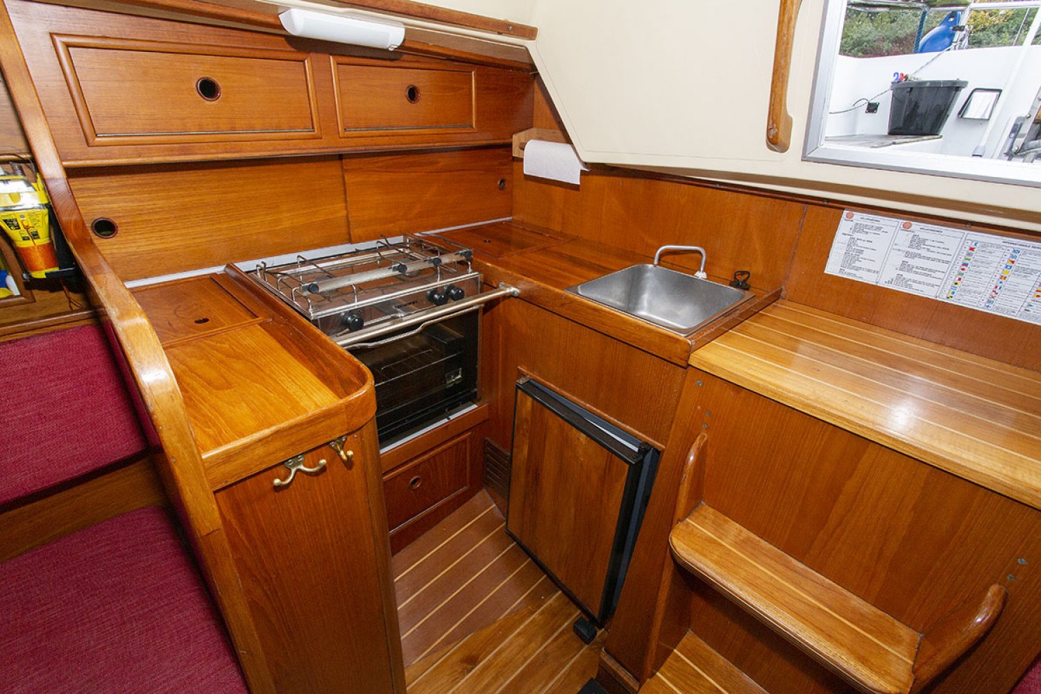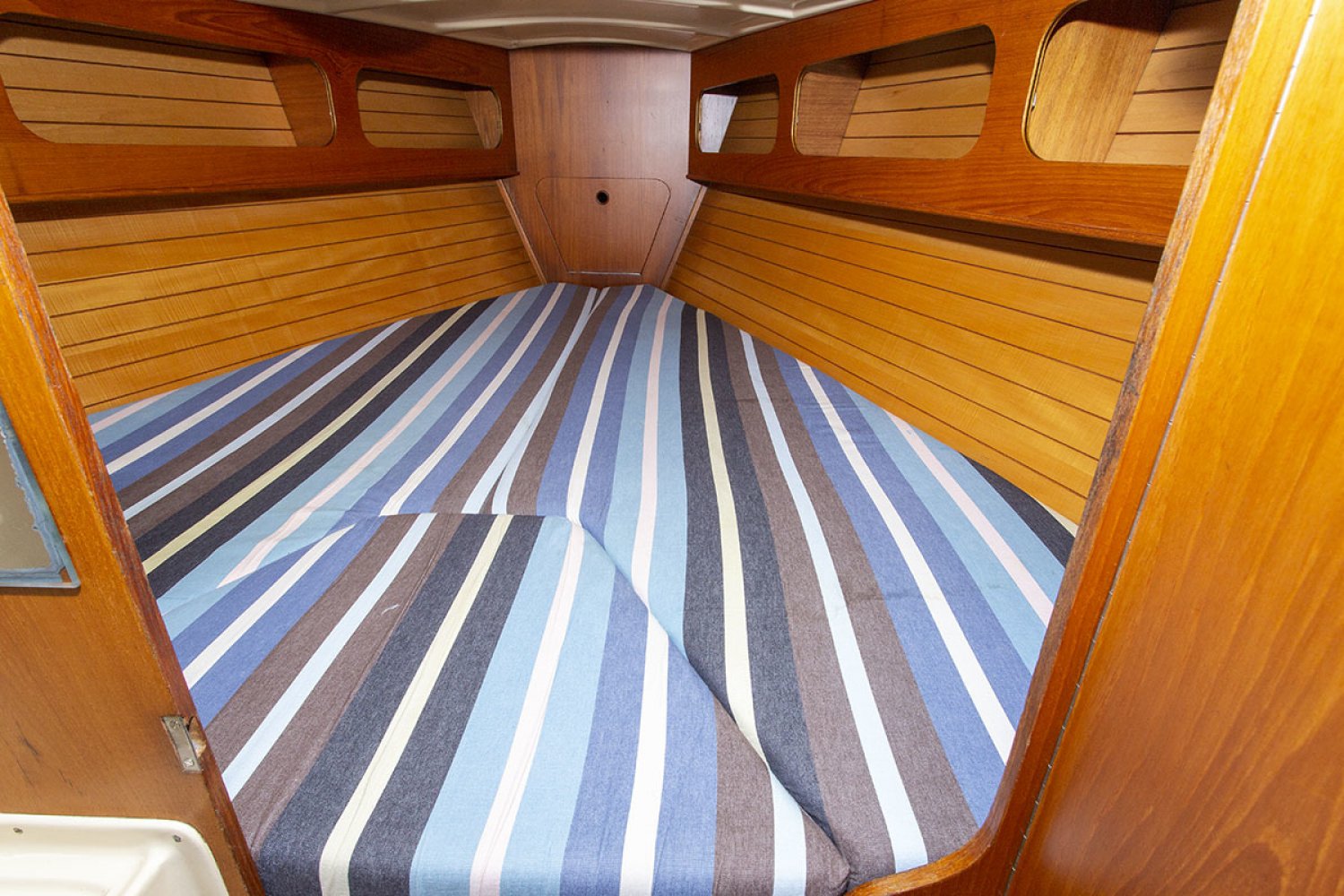 Het interieur oogt knus met het gelakte hout en de rode stoffering. Midscheeps is een zithoek waar u na een tocht lekker kunt nagenieten.  Aan stuurboord is een L-vormige kombuis met 2-pits kooktoestel, spoelbak, oven en koelkast. Er is voldoende bergruimte voor proviand. Aan bakboord treft u de navigatiehoek met de benodigde navigatie-apparatuur. Voor is een hut met dubbel bed, en er is nog een loodskooi achter.  Verder nog een natte cel met toilet, wastafel en bergruimte. De 28 pk Volvo Penta motor is in 2011 gereviseerd, evenals de keerkoppeling.
