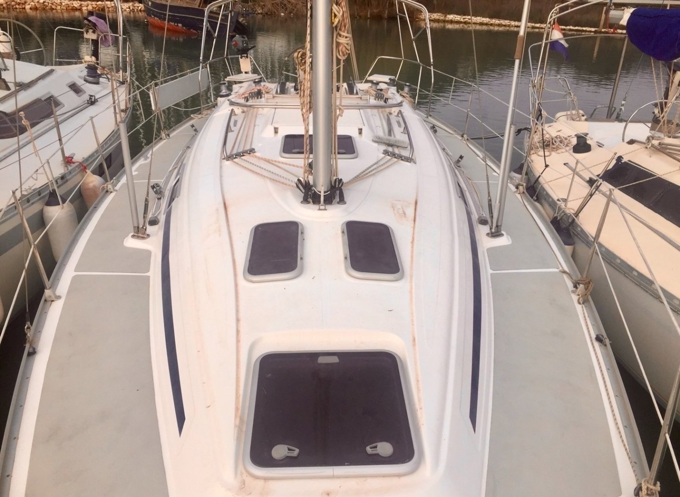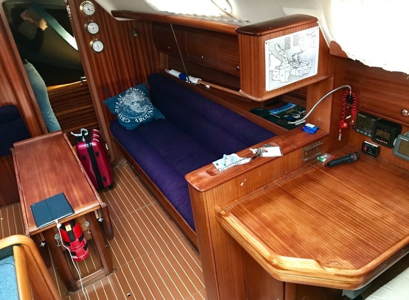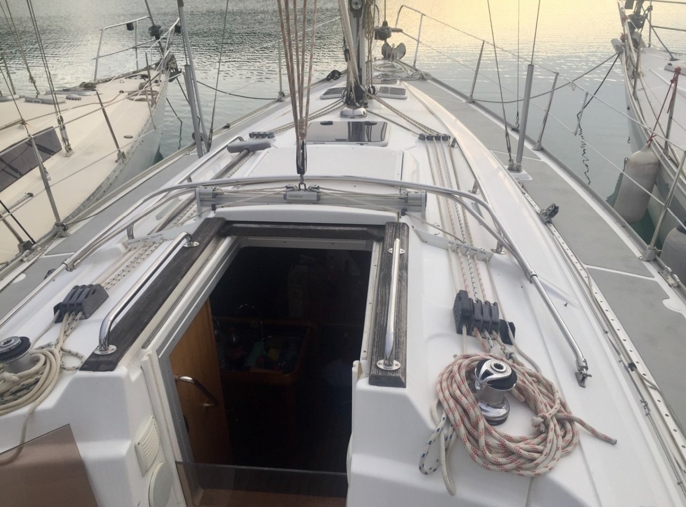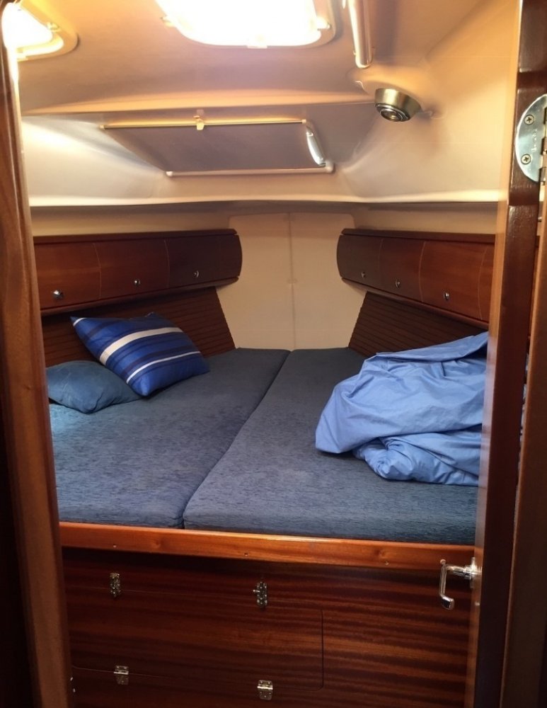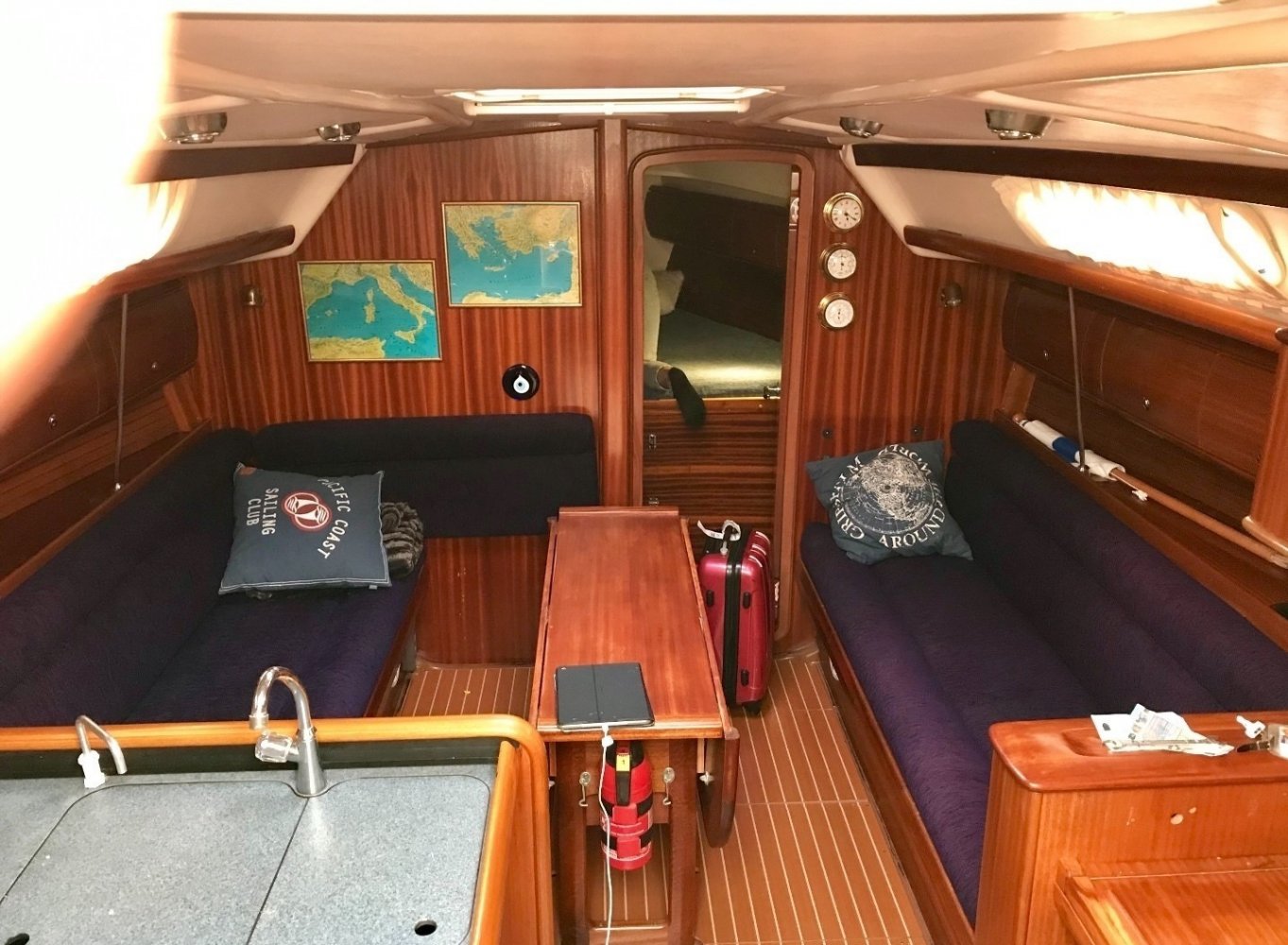 Furling main sail Furling genoa Gennaker Deeper 1,9m keel Bow thruster Plotter Autopilot Log Speed Depth VHF Electric anchor windlass + 70m chain + additional anchor Bimini Sprayhood Solar panel Inverter Dinghy Cockpit table + cushions Heating Webasto (2019) Cooker Oven Fridge New 260 Ah house batteries 2019 New 80 Ah start battery 2019 New 100 Ah bow thruster battery 2019 Bottom done spring 2018