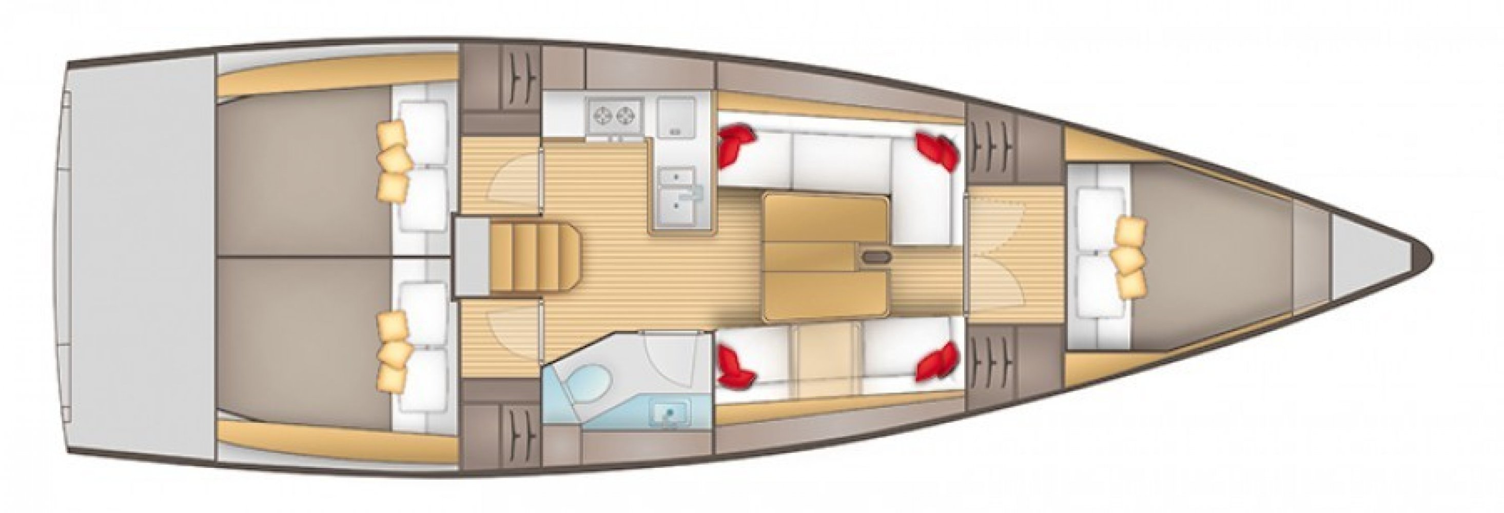 INTERIOR Layout 3 cabins, 1 head at saloon (also 2 cabin version available - ask!)