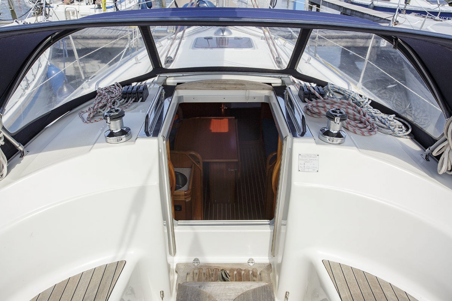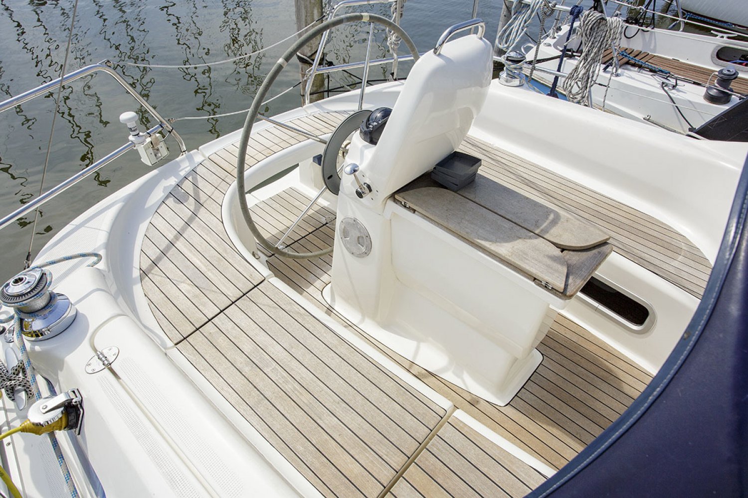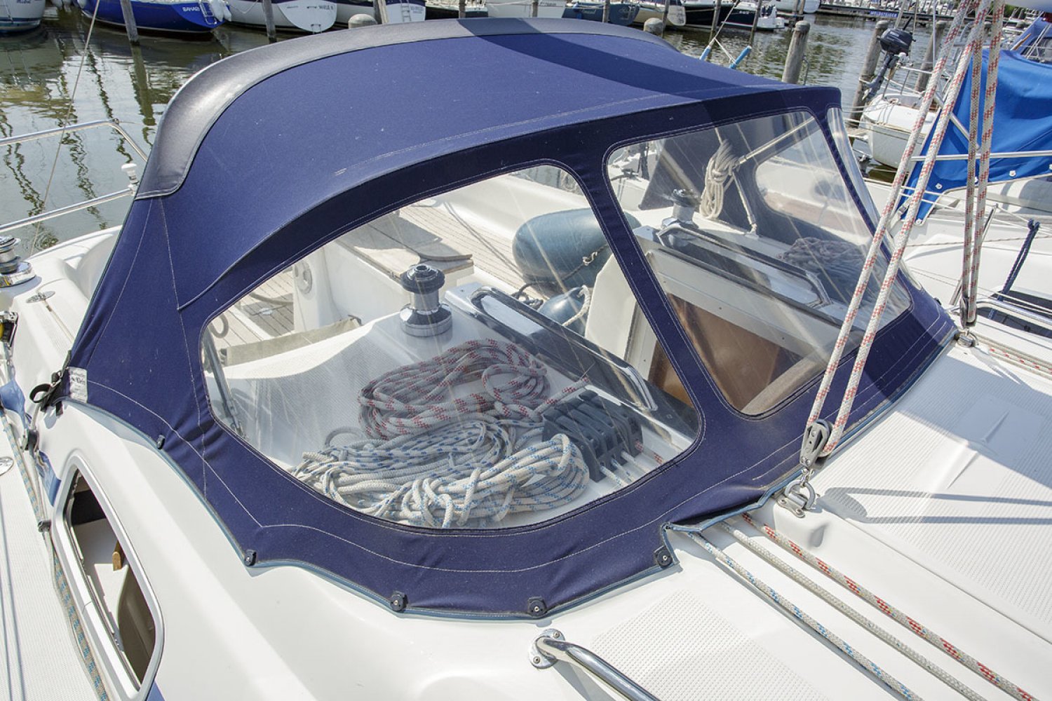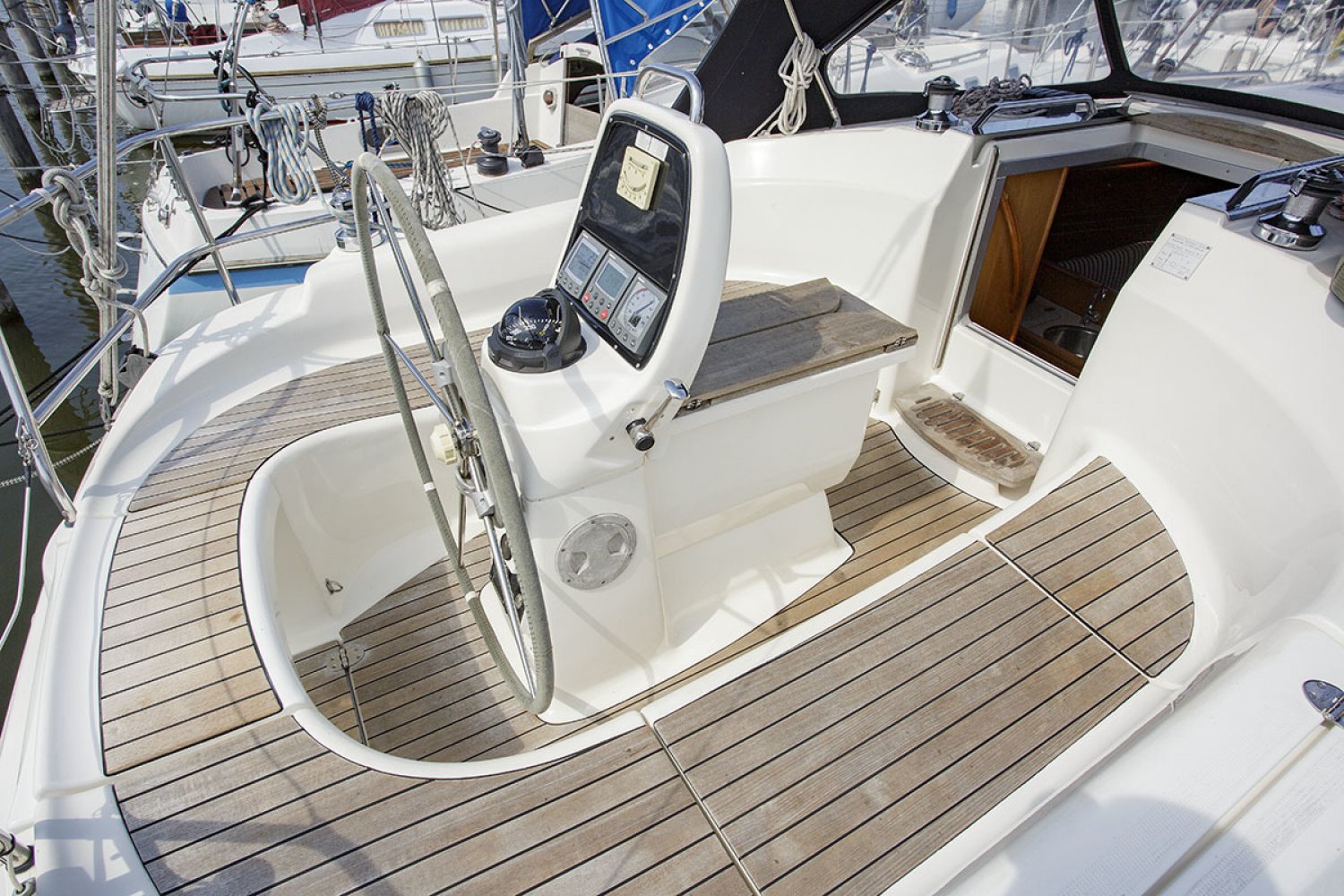 Deze Bavaria 30 cruiser is de Benjamin in de vloot van de populaire Duitse Bavaria werf. Toch is ook deze boot zeer volledig uitgerust met alle apparatuur die een verblijf aan boord zo aangenaam maakt. De boot is met haar lengte van 30 voet ongelofelijk ruim en heeft zeer goede vaareigenschappen zowel op de motor als onder zeil. De kuip is praktisch en ruim, in het midden van de kuip is de stuurstand met navigatie apparatuur. Aan stuurboord treft u een diepe bakskist met daarin voldoende ruimte voor het opbergen van grote zaken. Vanaf de stuurstand hebt u goed overzicht over het jacht en controle over het kompas en de navigatie instrumenten. Het zwemplatform is gemakkelijk bereikbaar via de demontabele achterbank.