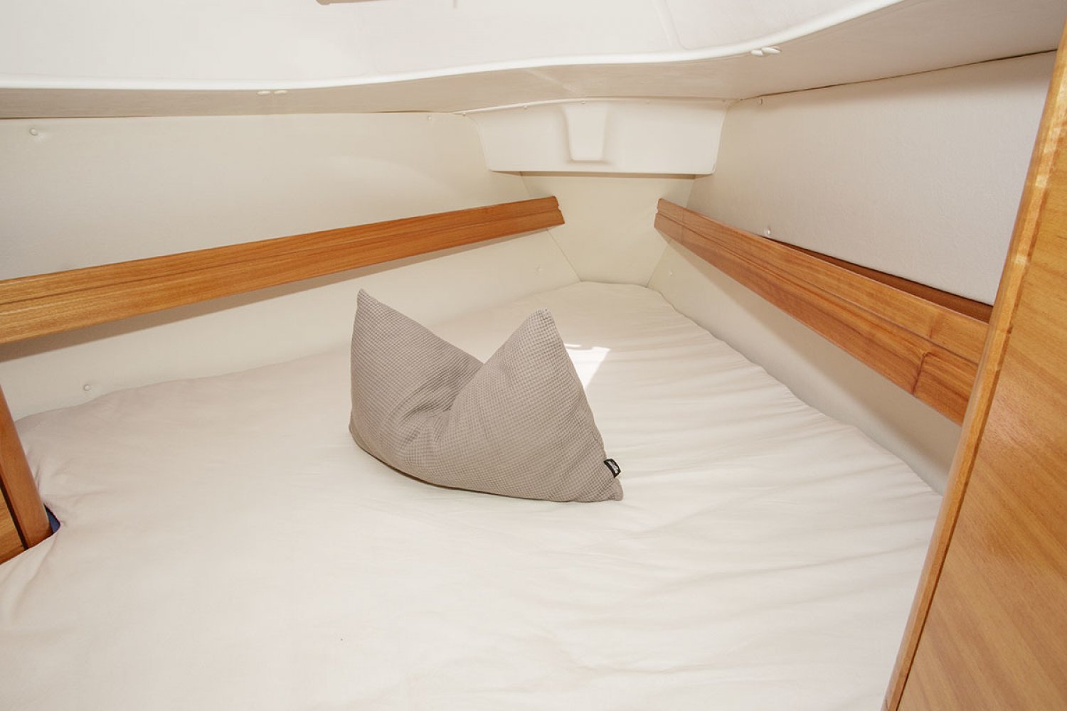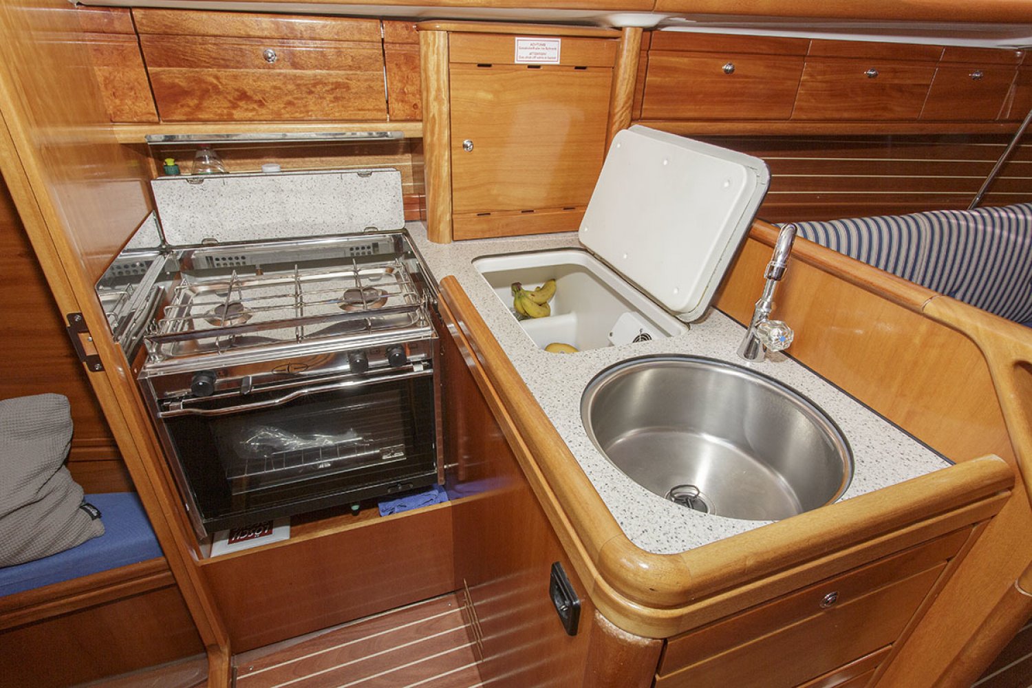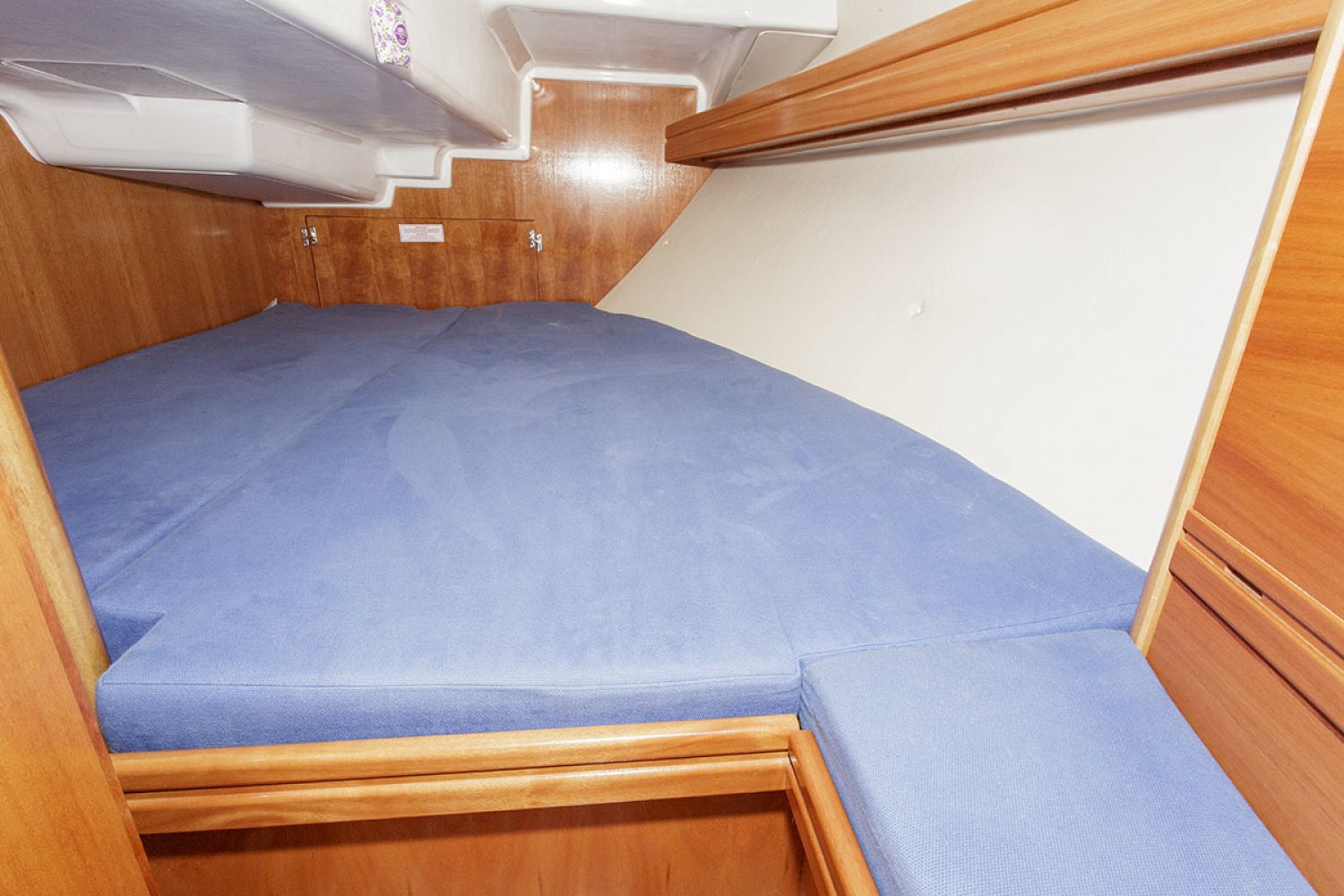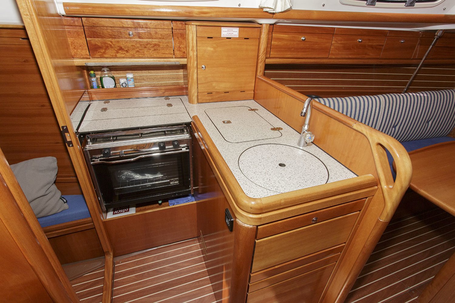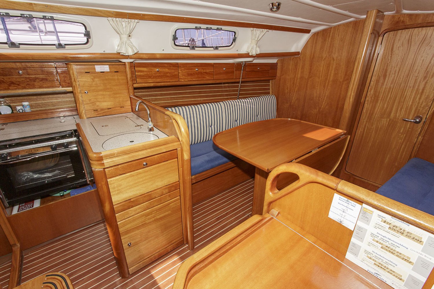 De salon heeft een gezellige nautische uitstraling met prima kussens. De indeling is praktisch van opzet met heel veel kastruimte en een uitstekende afwerking van het hout. Er zijn 4 vaste slaapplaatsen in de twee dubbele hutten, terwijl in de salon nog eens twee sofa’s als slaapplaats kunnen dienen. Aan stuurboord is de natte cel geplaatst met toilet en wastafel. De achterhut is voorzien van een groot bed en voldoende bergruimte. De bedden in de voorste hut werden door een tummermand verlengd tot 220 cm en verdeelde de bergruimte onder het bed. ”De keuken in L-vorm is heerlijk ruim, modern van opzet en van alle gemakken voorzien; zoals spoelbak, kookstel, oven en koelkast. Aan stuurboord is de kaartentafel geplaatst met marifoon en controlepaneel. De motorruimte is zeer goed toegankelijk middels de omhoog scharnierende kajuittrap. Deze zeer fraaie Bavaria 30 Cruiser uit 2006, verkeert in goede staat en is geheel vaarklaar.