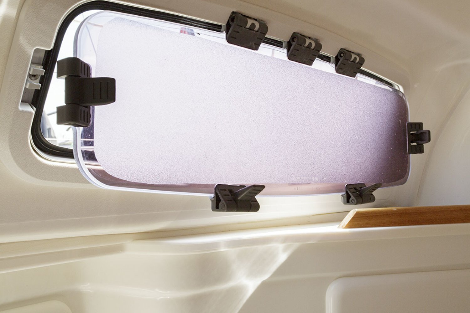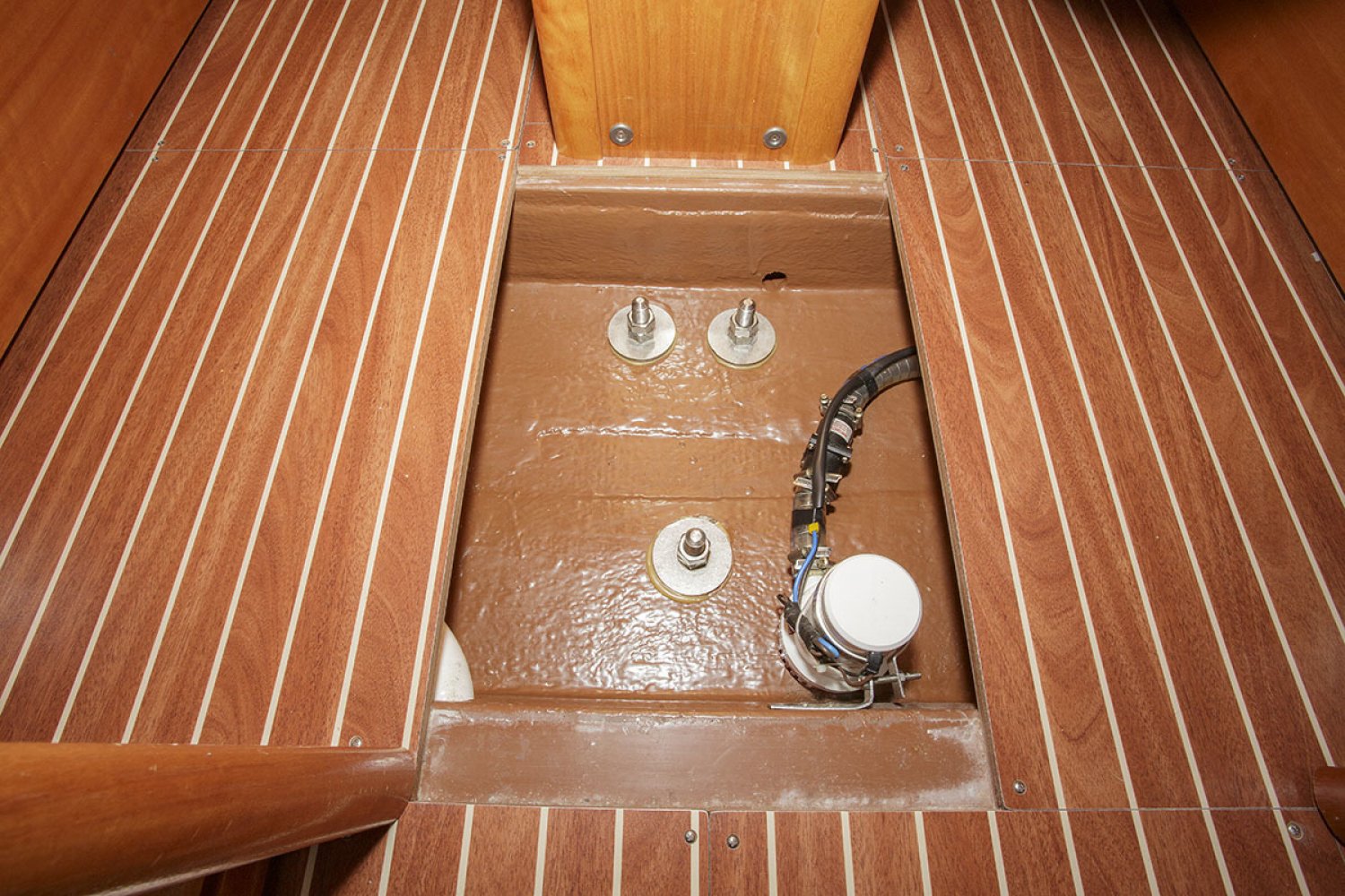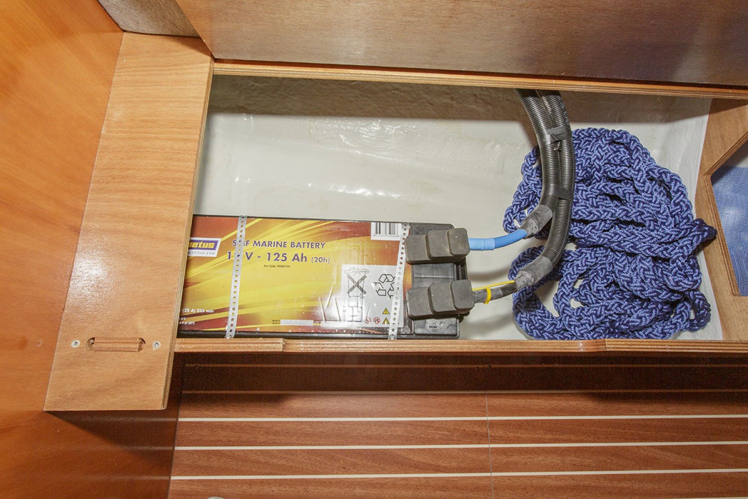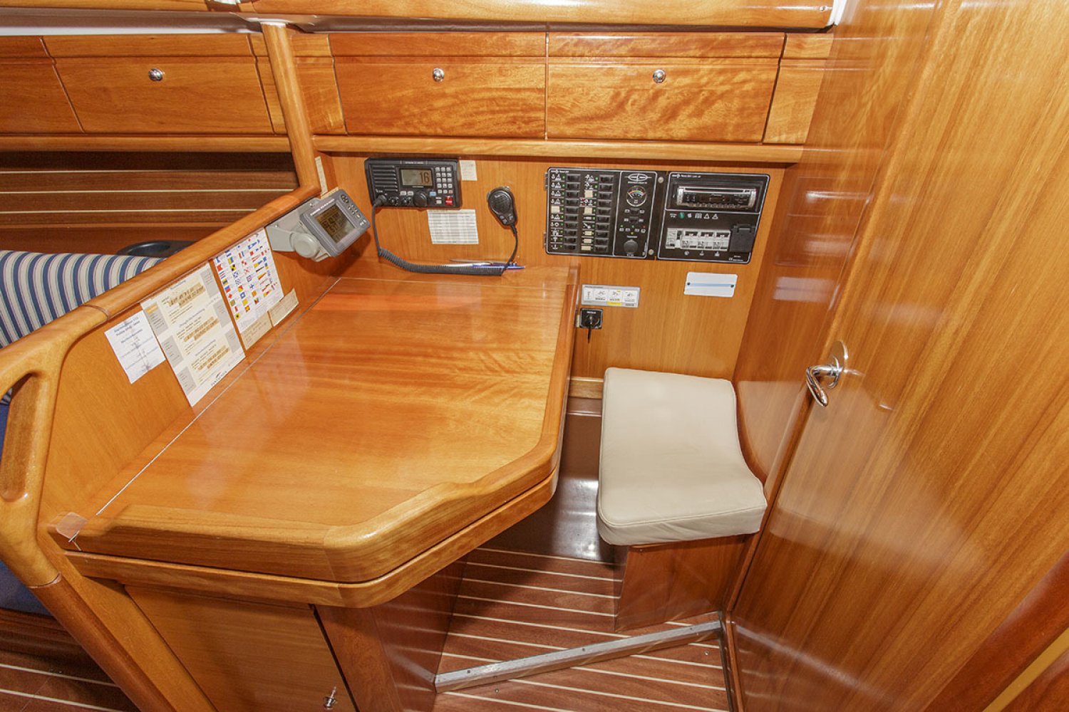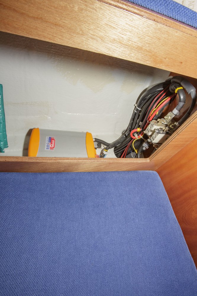 De salon heeft een gezellige nautische uitstraling met prima kussens. De indeling is praktisch van opzet met heel veel kastruimte en een uitstekende afwerking van het hout. Er zijn 4 vaste slaapplaatsen in de twee dubbele hutten, terwijl in de salon nog eens twee sofa’s als slaapplaats kunnen dienen. Aan stuurboord is de natte cel geplaatst met toilet en wastafel. De achterhut is voorzien van een groot bed en voldoende bergruimte. De bedden in de voorste hut werden door een tummermand verlengd tot 220 cm en verdeelde de bergruimte onder het bed. ”De keuken in L-vorm is heerlijk ruim, modern van opzet en van alle gemakken voorzien; zoals spoelbak, kookstel, oven en koelkast. Aan stuurboord is de kaartentafel geplaatst met marifoon en controlepaneel. De motorruimte is zeer goed toegankelijk middels de omhoog scharnierende kajuittrap. Deze zeer fraaie Bavaria 30 Cruiser uit 2006, verkeert in goede staat en is geheel vaarklaar.