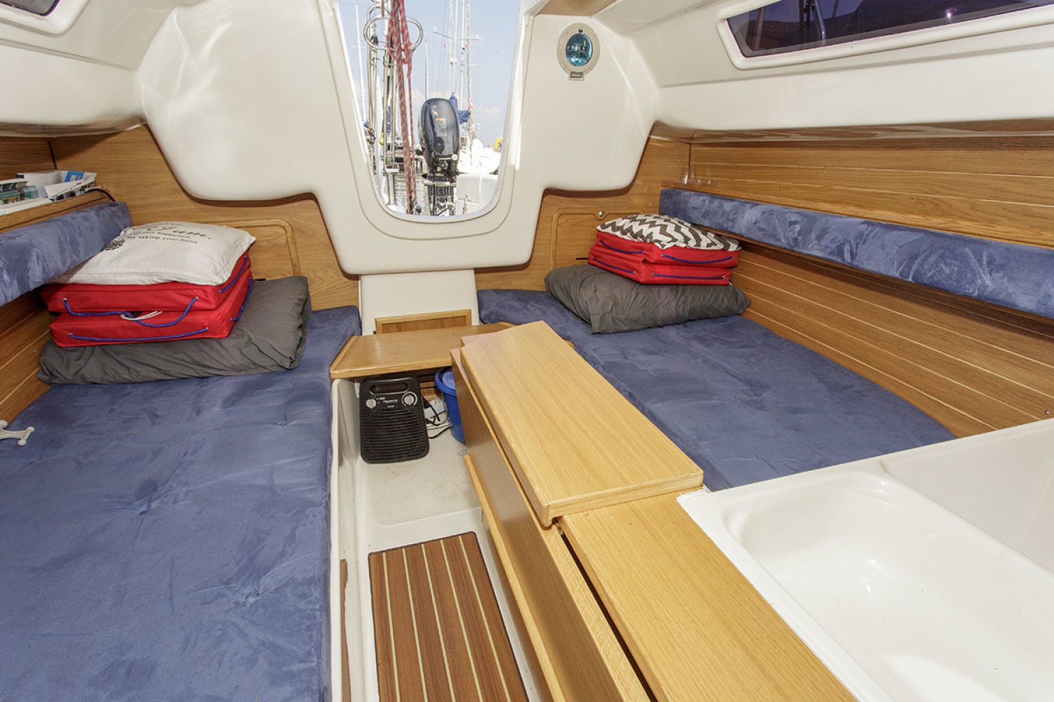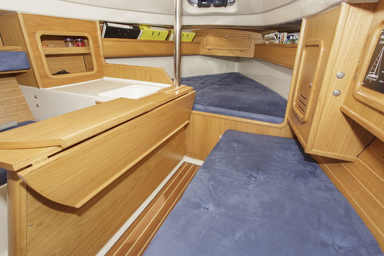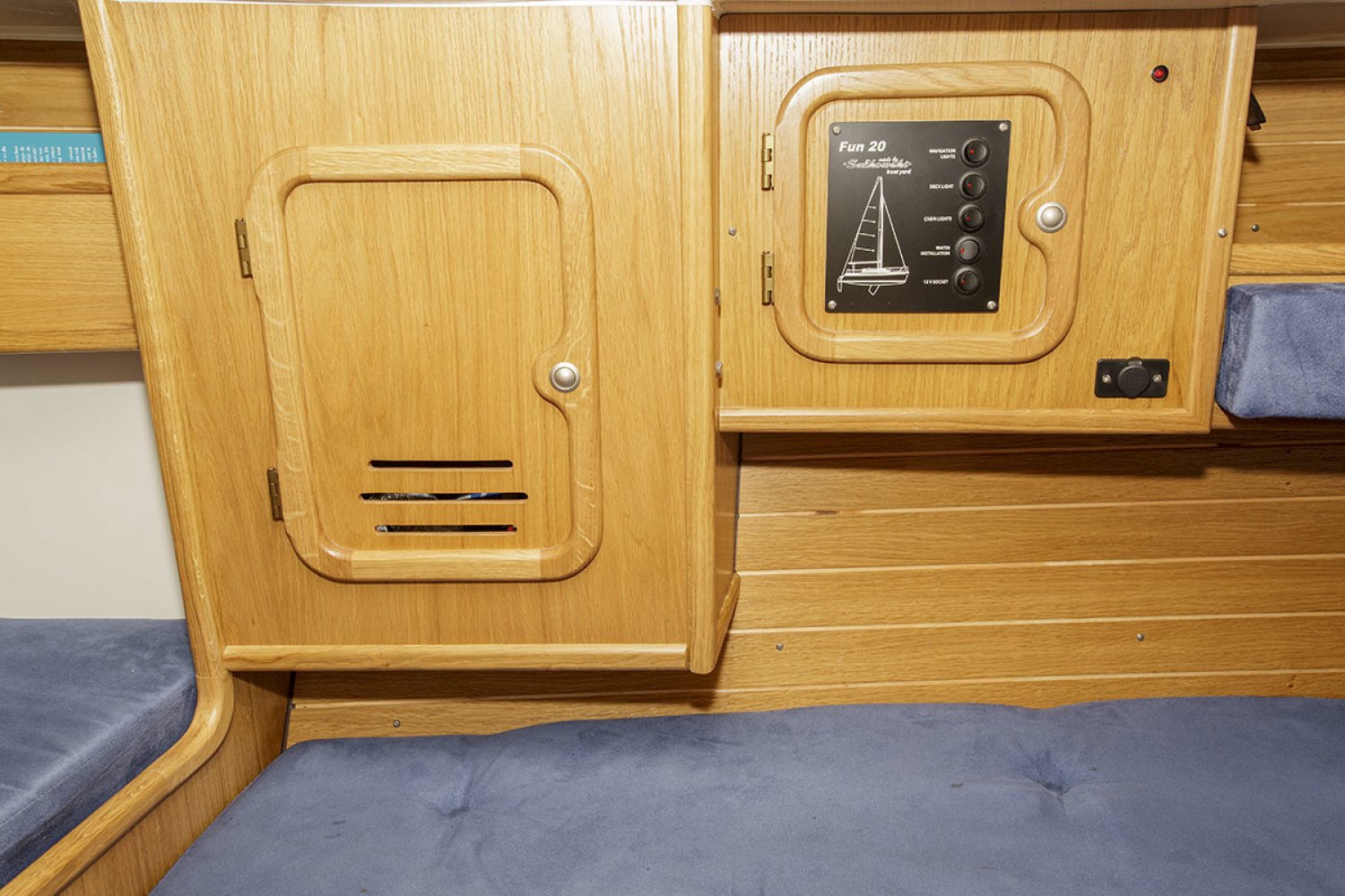 Binnen is de boot praktisch ingedeeld met 4 slaapplaatsen, deze Fan 20 heeft een combinatie van blauwe bekleding en hout. De mast is inklapbaar, wat maakt dat de boot makkelijk op een trailer vervoert kan worden naar een ander vaargebied.