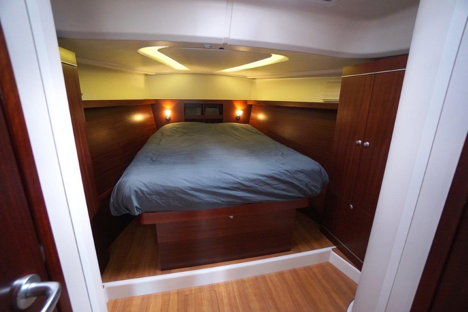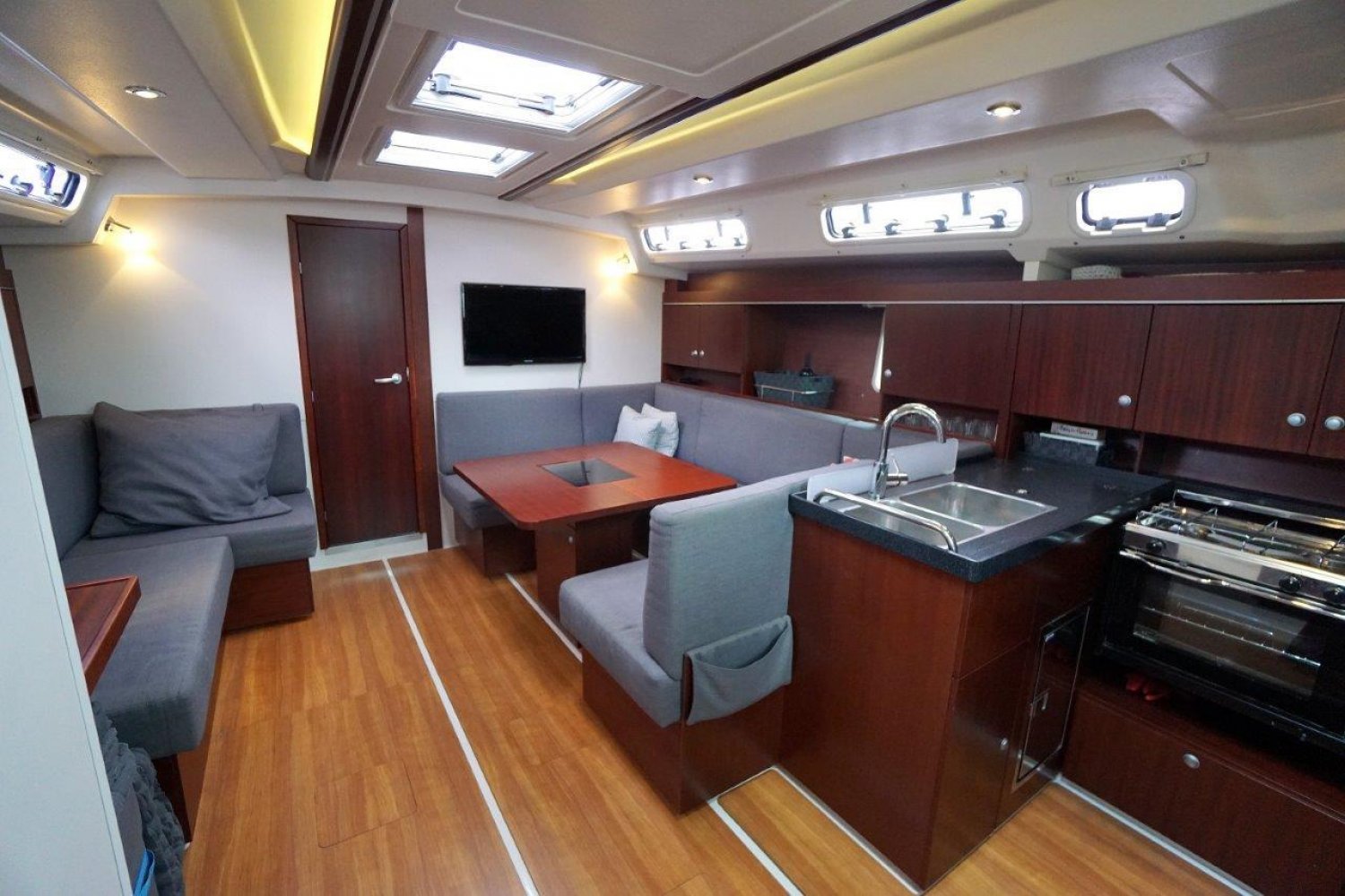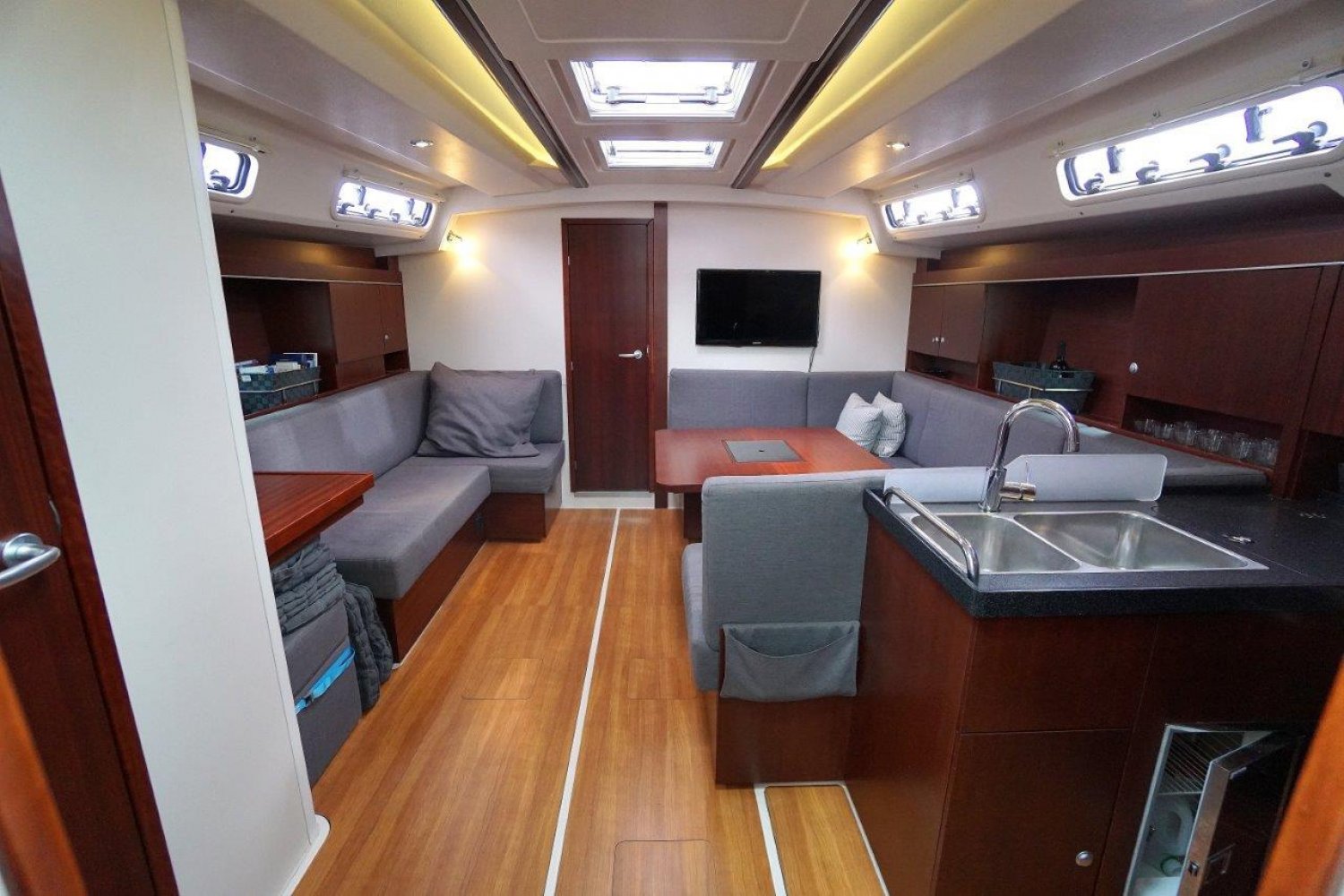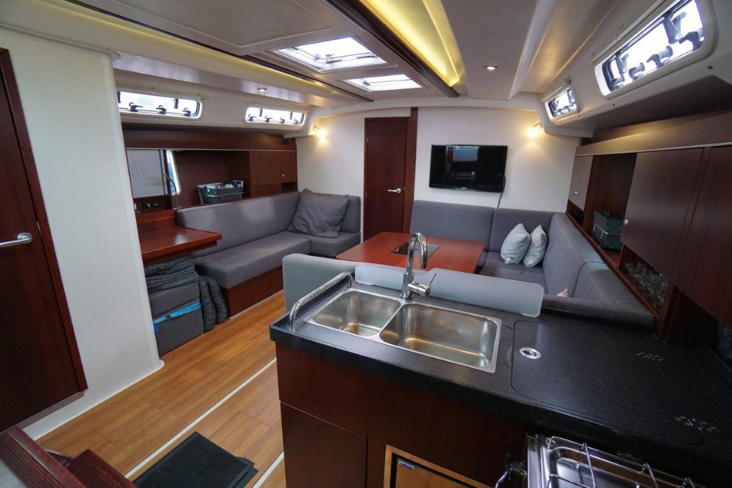 Binnen in het schip treft u een modern en strak nautisch interieur aan waarbij ruimte en comfort ongetwijfeld de basis ingrediënten tijdens het ontwerpen zijn geweest. Bij binnenkomst in de salon  is aan stuurboord een ruim kombuis met uiteraard alles wat u mag verwachten op een dergelijk schip. Hier is tevens de toegang tot de stuurboord achterhut te vinden welke zich in het achterschip bevindt. Deze hut is voorzien van een tweepersoonsbed en de nodige bergruimte. Aan bakboord in het achterschip is een tweede, identieke hut te vinden.
