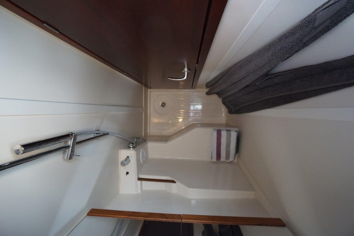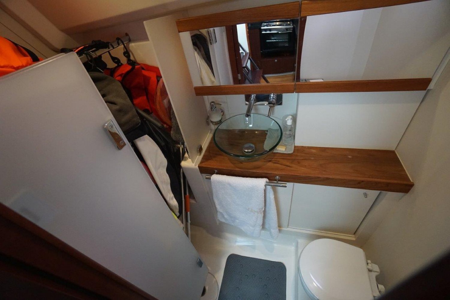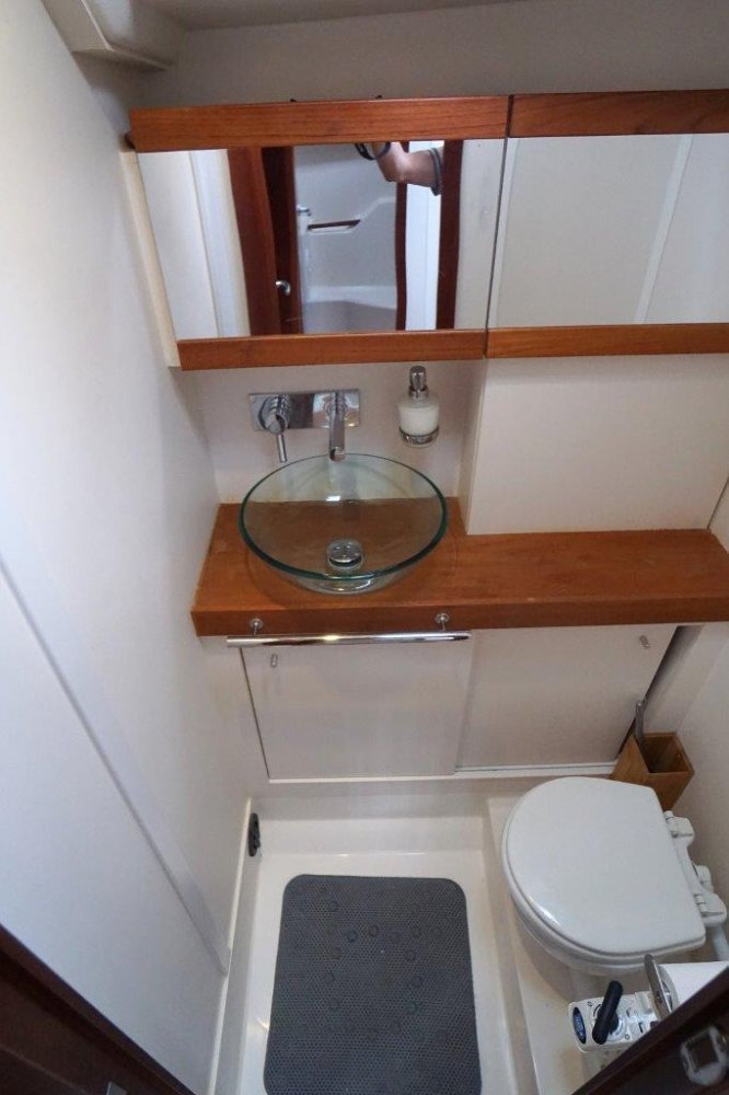 Tegenover het kombuis is aan bakboord de “gasten” natte cel gesitueerd. Deze is opvallend ruim met gescheiden douchegelegenheid welke overigens op dit moment gebruikt wordt door de eigenaar als natte kast.