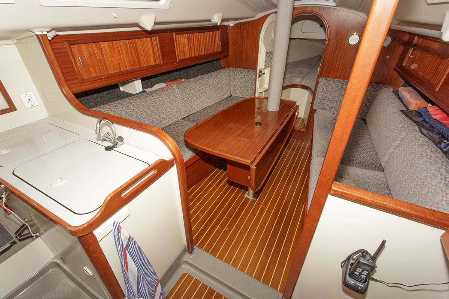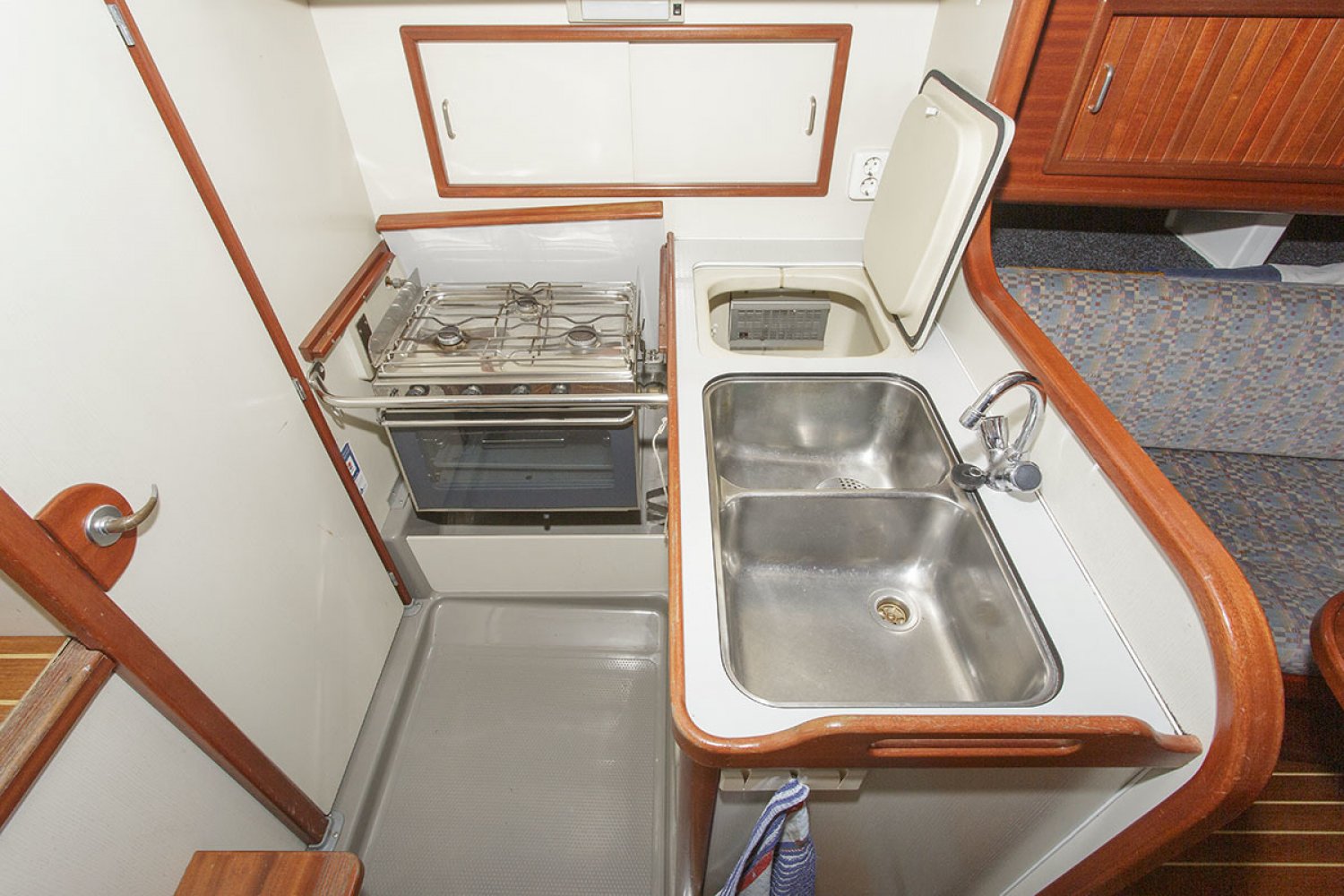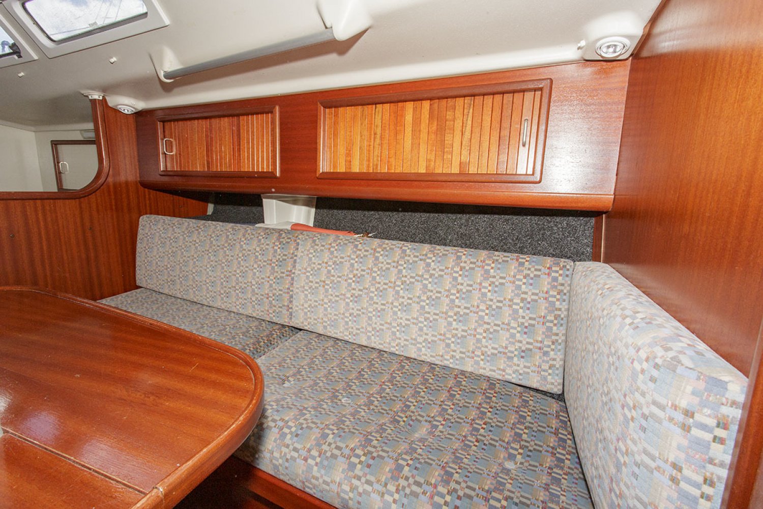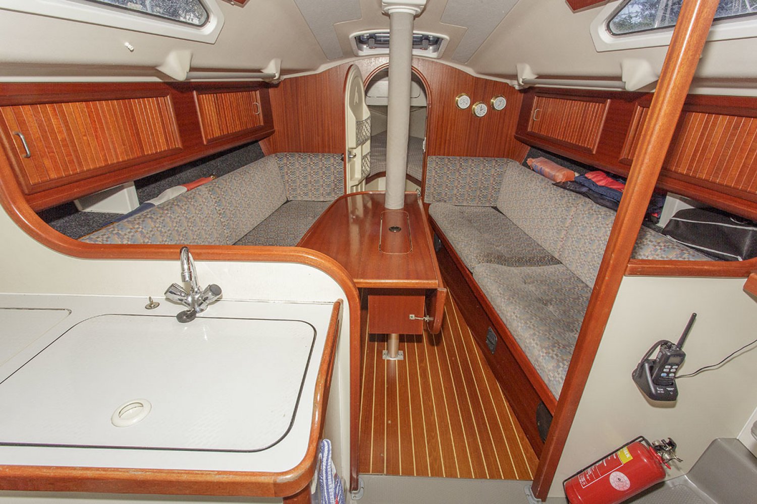De salon is ruim, door gebruik van Mahonie hout oogt de salon knus en scheeps. Aan bakboord bevindt zich de keuken met kookstel, oven, koelkast en veel opbergruimte. Aan stuurboord is de kaartentafel, met in het achterschip de mooie en praktische natte cel. De salon heeft 2 langs banken die tevens dienst kunnen doen als extra kooien. Achter is een ruime tweepersoons hut. In het voorschip bevindt zich een tweede dubbele hut.