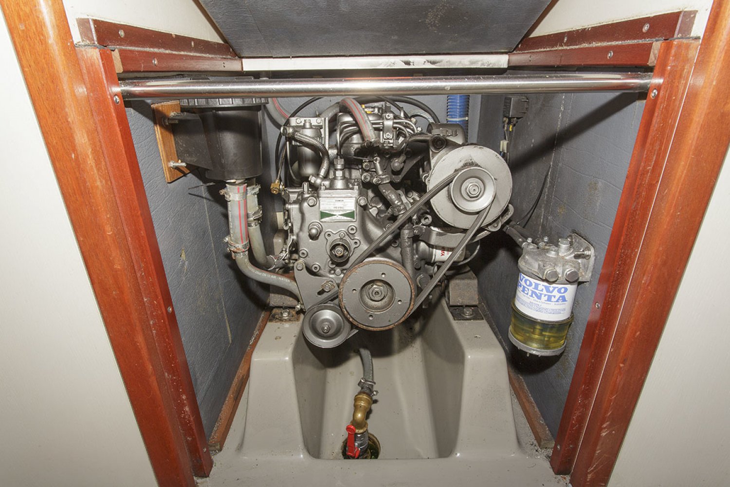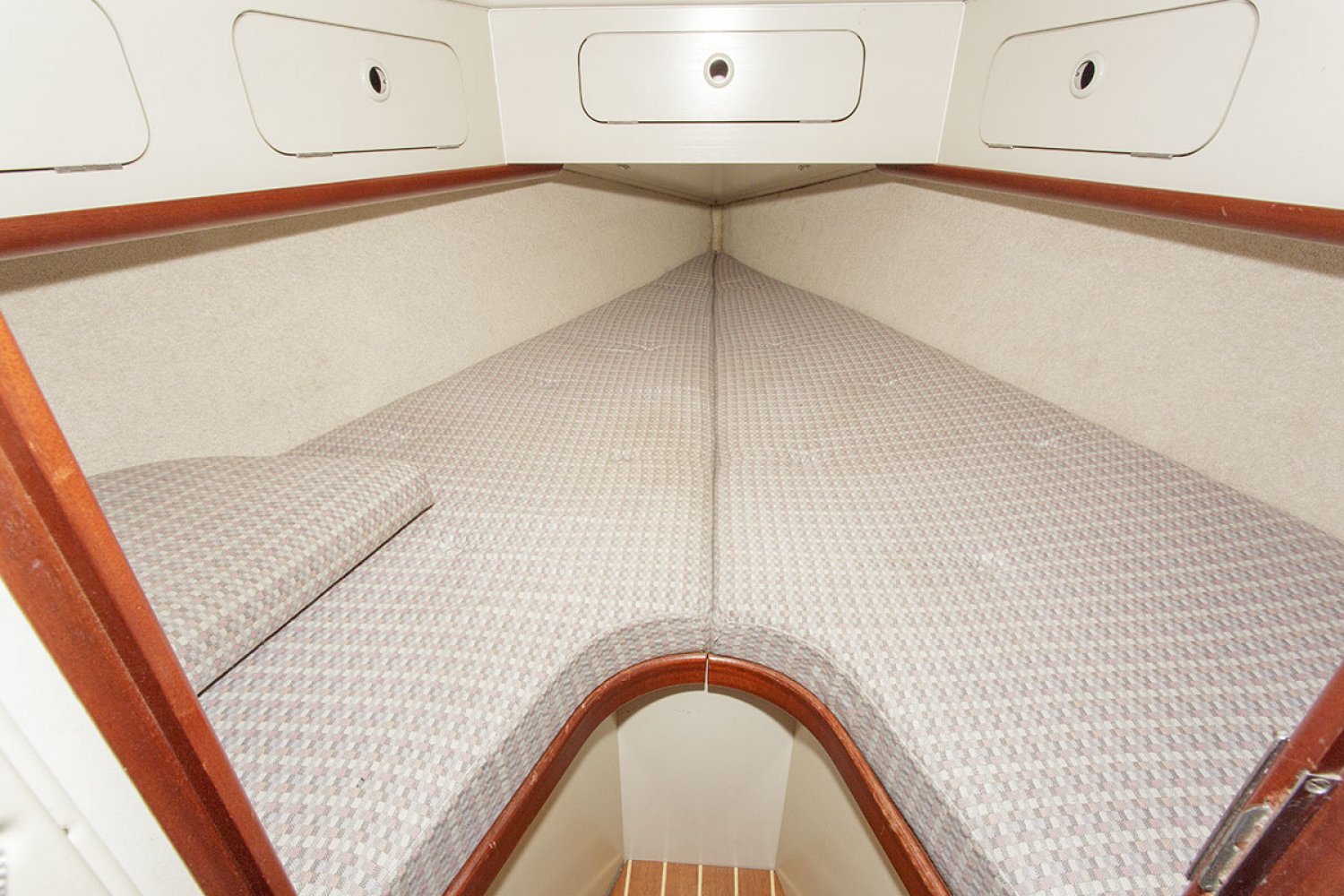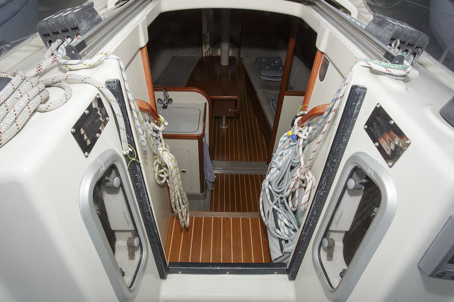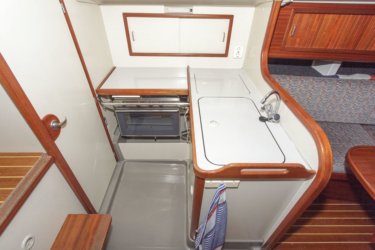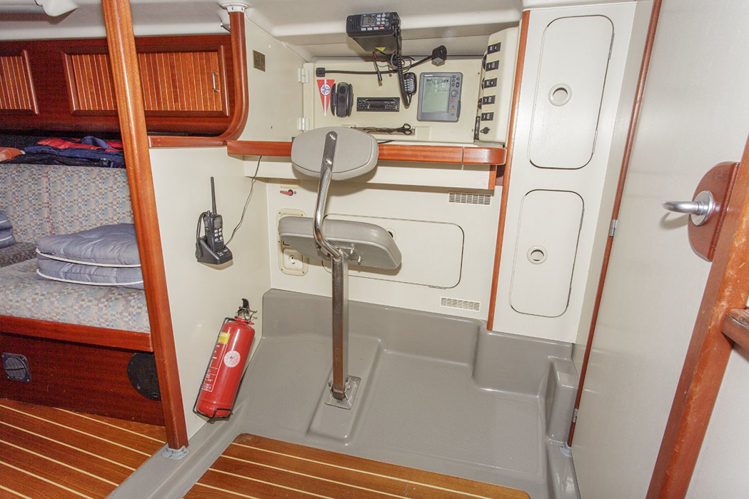 De salon is ruim, door gebruik van Mahonie hout oogt de salon knus en scheeps. Aan bakboord bevindt zich de keuken met kookstel, oven, koelkast en veel opbergruimte. Aan stuurboord is de kaartentafel, met in het achterschip de mooie en praktische natte cel. De salon heeft 2 langs banken die tevens dienst kunnen doen als extra kooien. Achter is een ruime tweepersoons hut. In het voorschip bevindt zich een tweede dubbele hut.