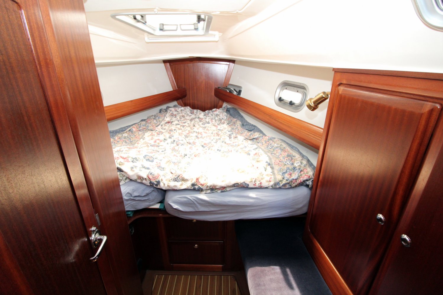 De ruime kuip aan boord van dit Bavaria 37 Exclucive zeiljacht biedt voldoende plaats voor u en mede opvarenden en is voorzien van 2 ruime bakskisten en een kuiptafel, welke neergeklapt kan worden voor extra bewegingsruimte. Panoramische ramen zorgen voor een natuurlijk licht in de benedendeks gelegen leefruimte en geven de gezellige salon met zijn 2 comfortabele banken en mahonie houten interieur een ruime uitstraling. Aan stuurboord bevindt zich de navigatiehoek met bergruimte voor navigatiekaarten en -instrumenten, ook onder de zitplaats is hier bergruimte gerealiseerd voor bijvoorbeeld gereedschap. Hier tegenover treft u een praktisch ingedeelde, U-vormige kombuis aan met o.a. een half-cardanisch 2 pits gasfornuis met oven, dubbele spoelbakken en voldoende kastruimte. In de voorpiek is aan bakboord zijde is het toilet met wastafel, deze kan ook vanuit de ernaast gelegen eigenaars hut bereikt worden. In deze hut heeft u de beschikking over een royaal 2 pers bed en voldoende bergruimte. De tweede hut bevindt zich achter  in het schip en ook hier is slaapplaats voor 2 personen en kastruimte voor persoonlijke spullen. Een hete lucht verwarming zorgt ervoor dat u ook tijdens frissere dagen comfortabel kunt genieten van dit schip.