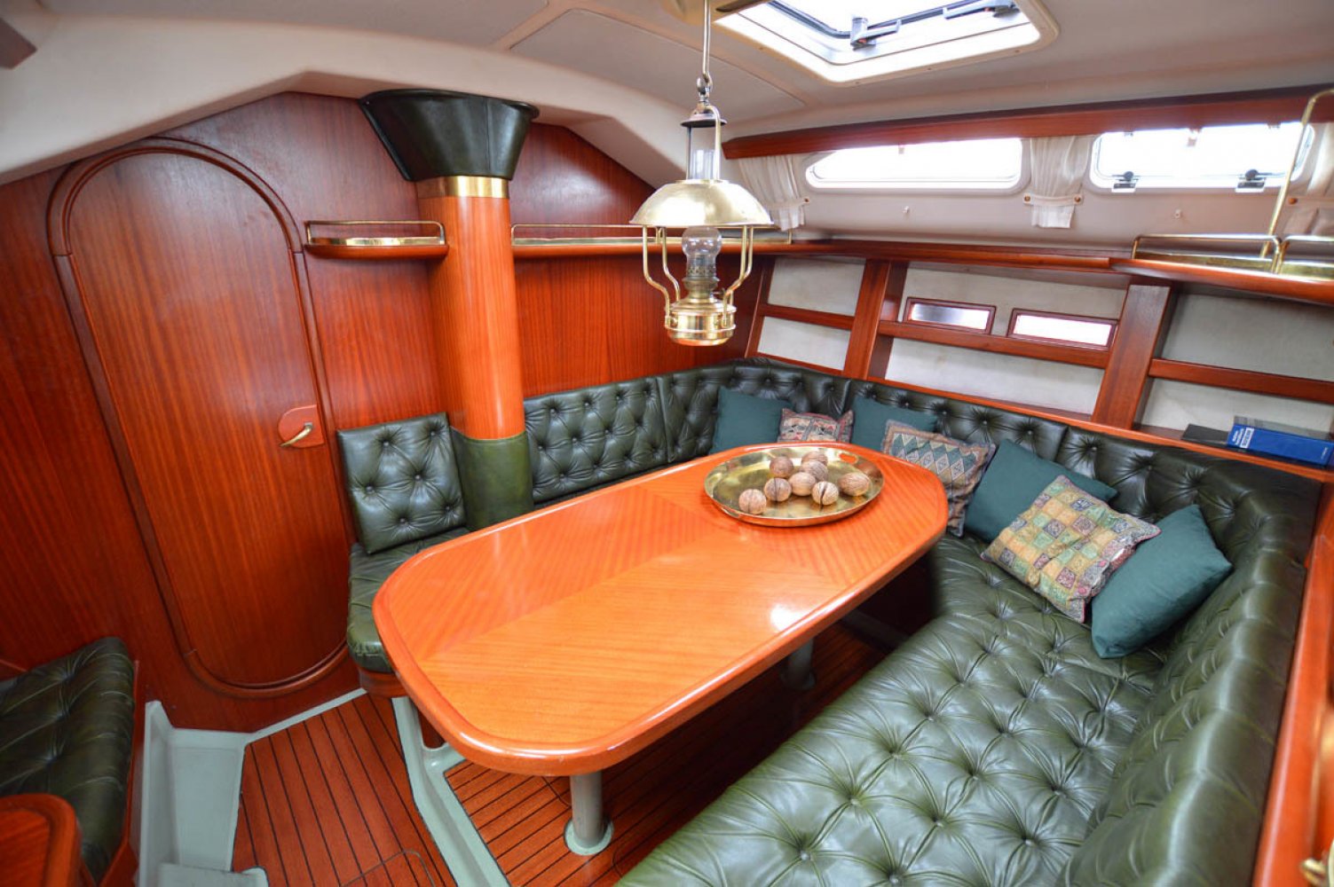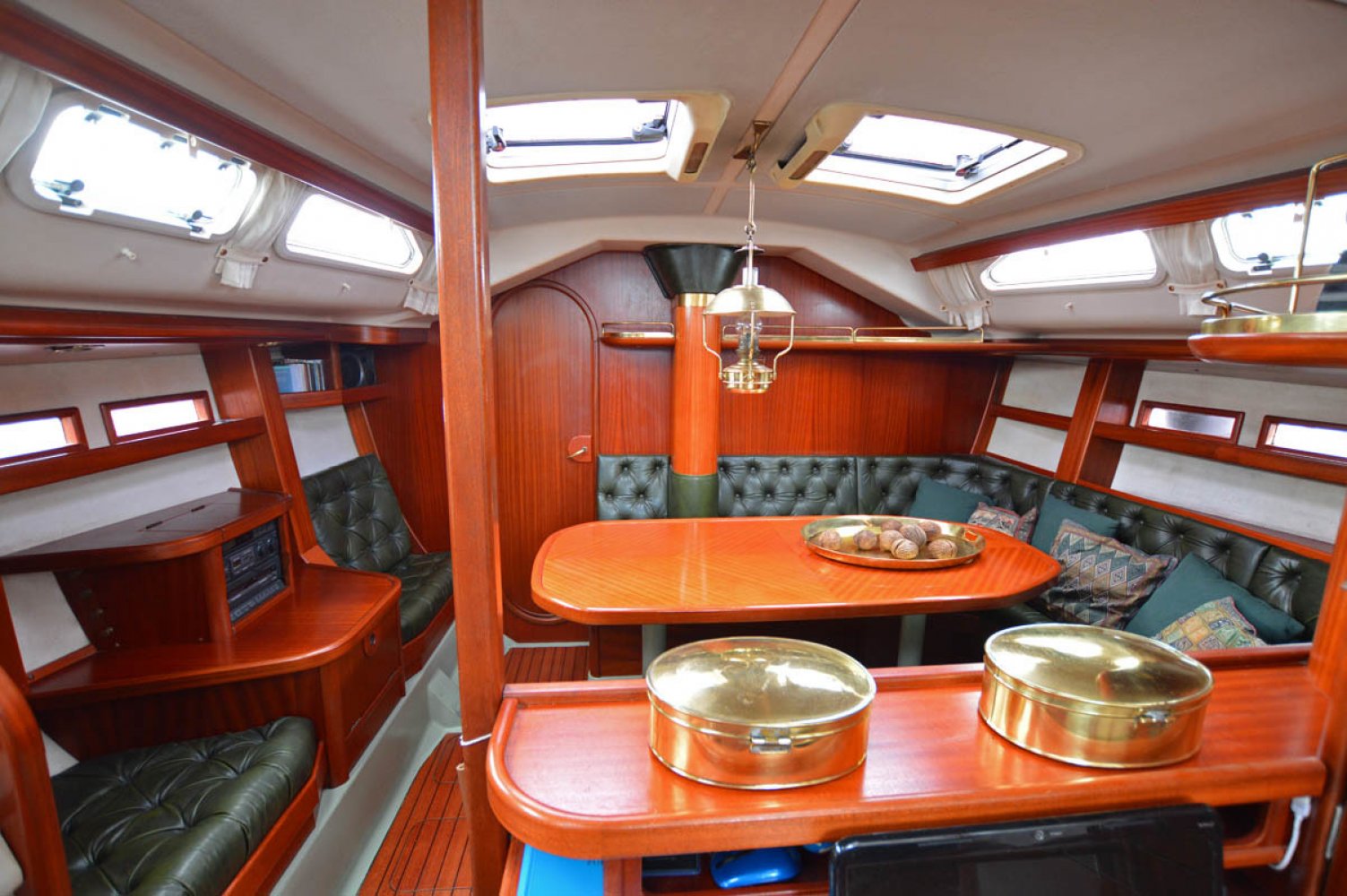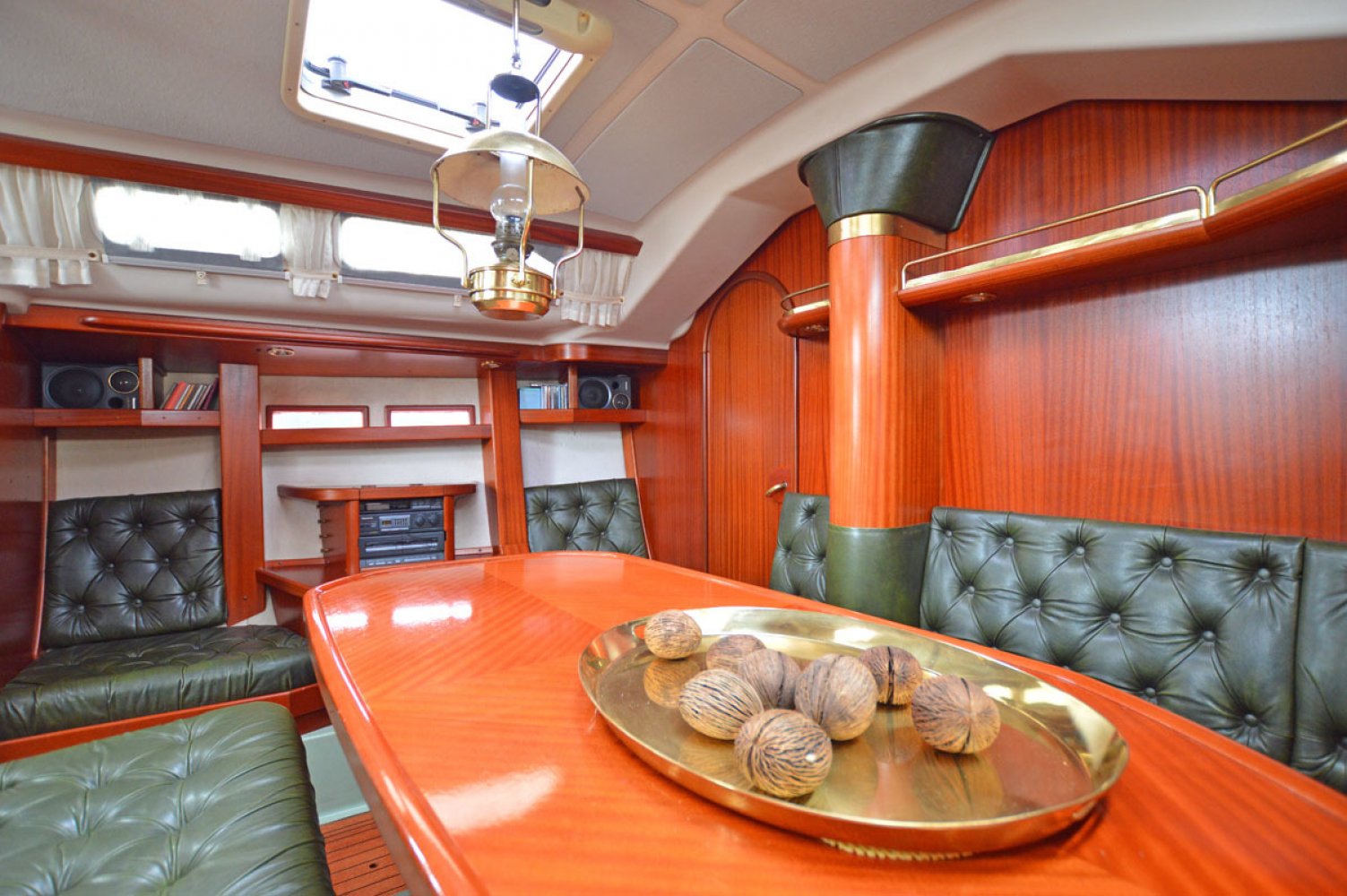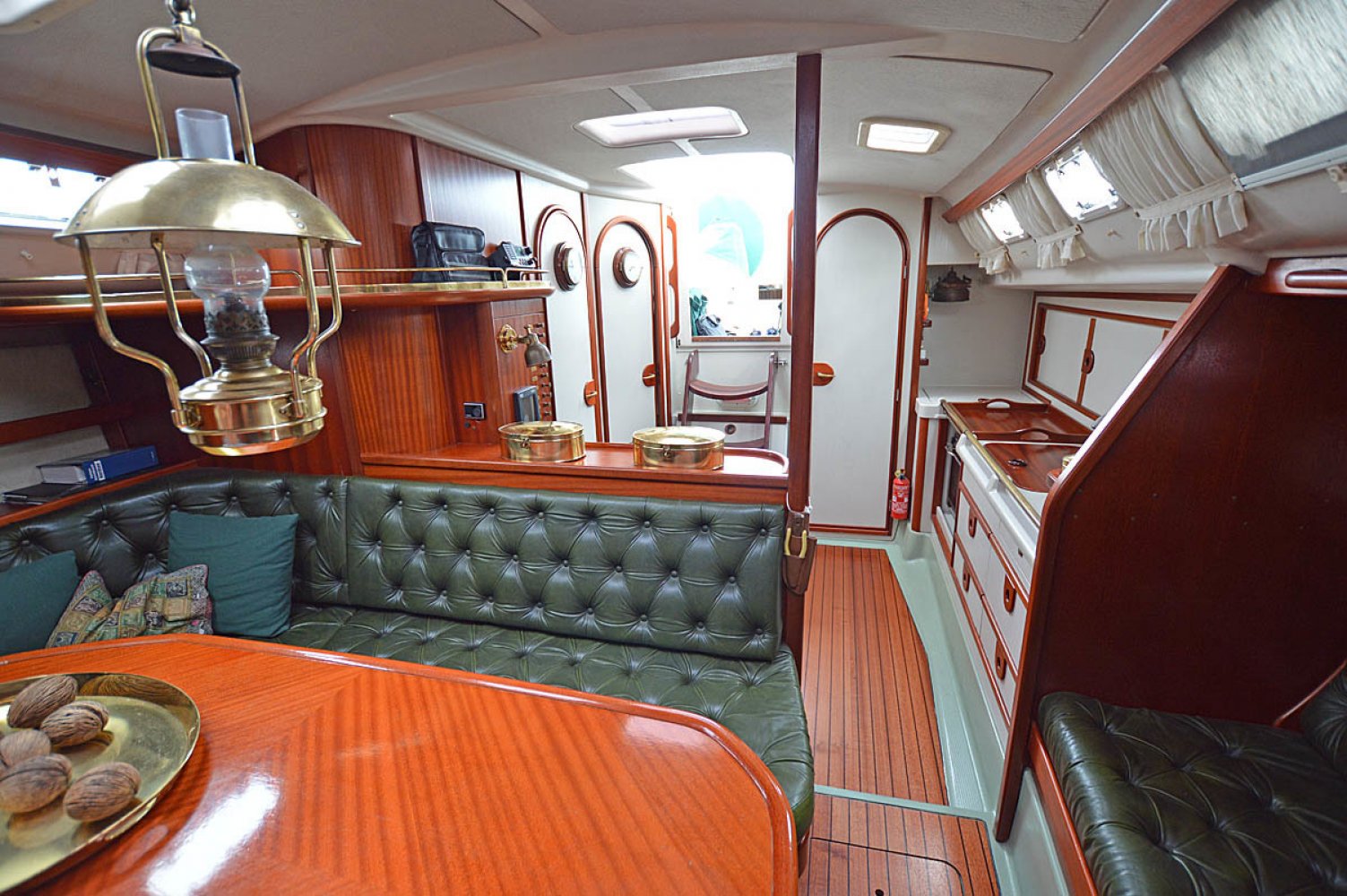 Bij binnenkomst is aan bakboord de kombuis met 3-pits kooktoestel, oven en koelkast. Aan stuurboord de natte cel met toilet, wastafel en douche en de kaartentafel met de nodige navigatieaparatuur. Door gebruik van gelakt mahonie en engels groene lederen bekleding ademt de salon een klassieke sfeer uit, het is goed toeven in de U-vormige bank aan stuurboord, of in één van de twee stoelen aan bakboord. In de punt is een hut met dubbel bed met toilet en wasbak en achter zijn ook nog 2 hutten met een dubbel bed