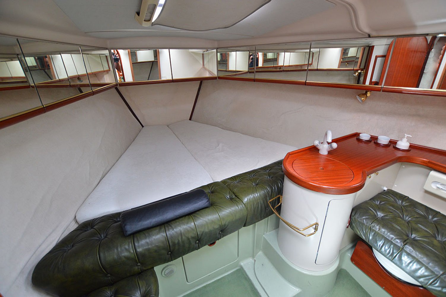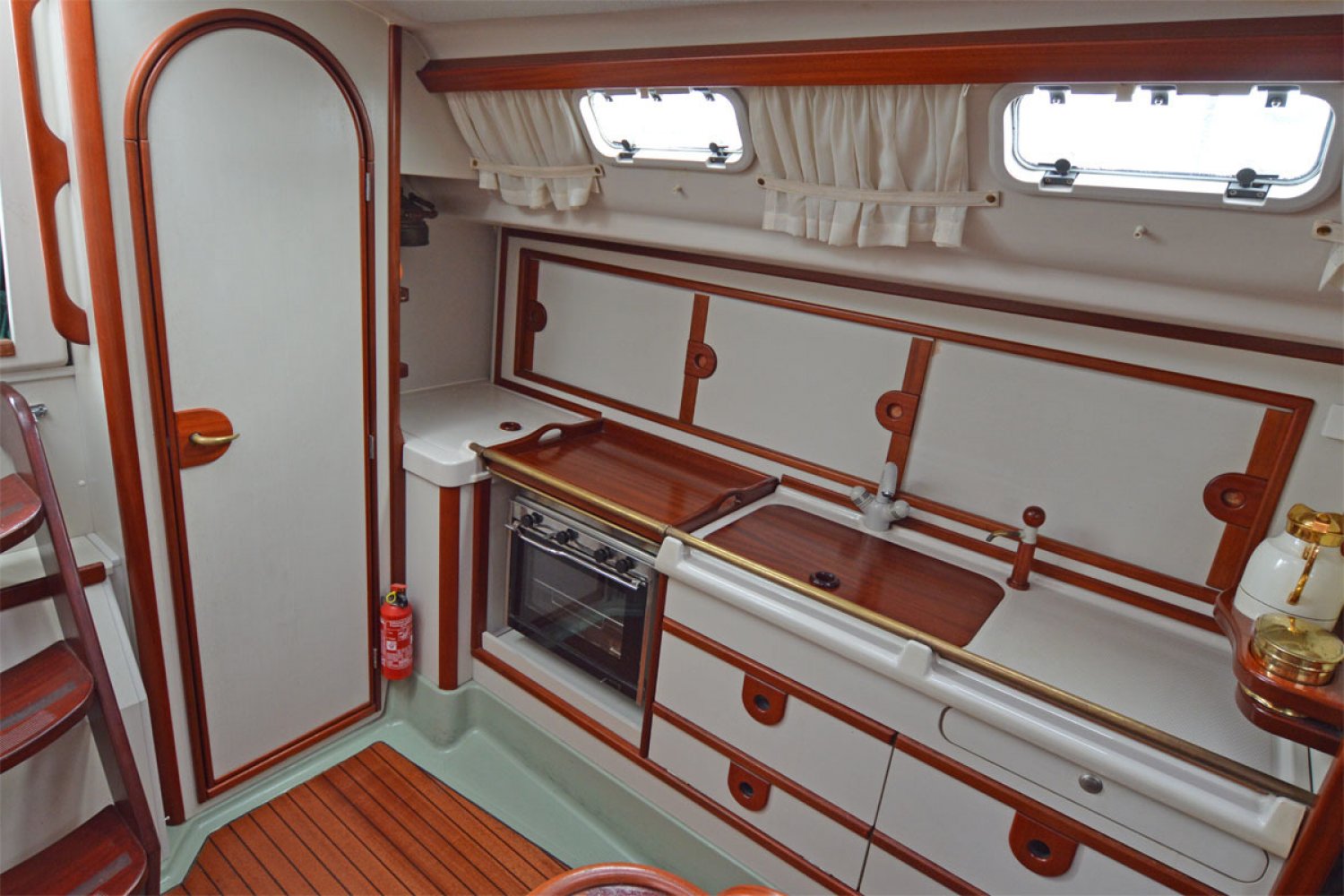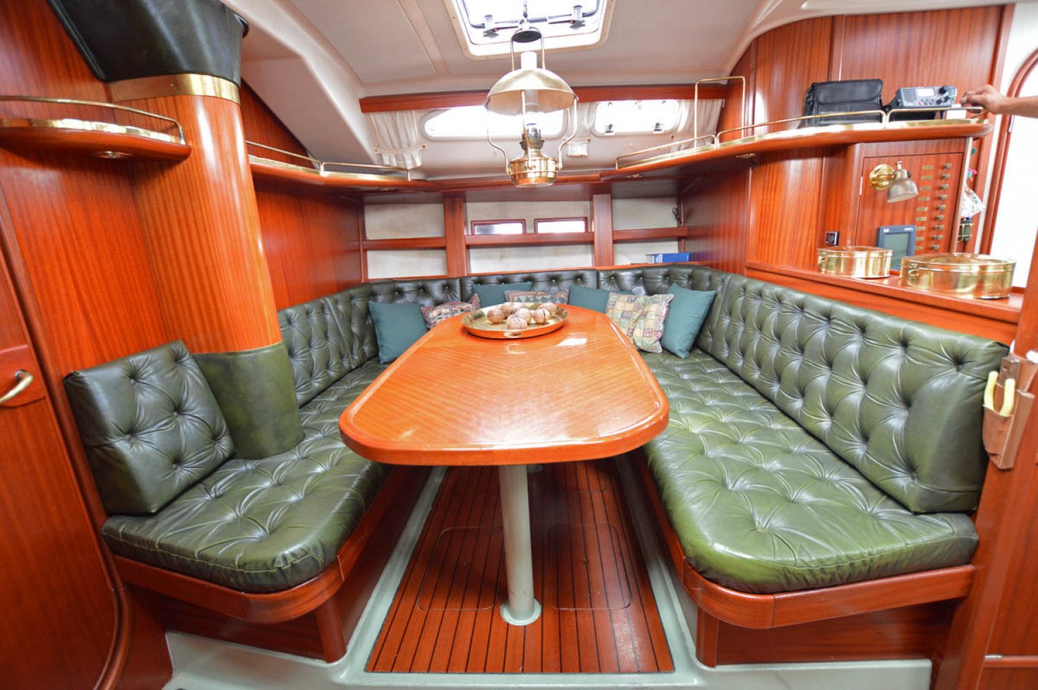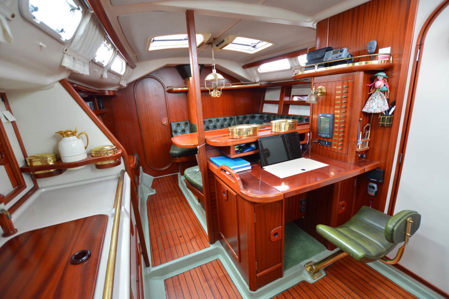 Bij binnenkomst is aan bakboord de kombuis met 3-pits kooktoestel, oven en koelkast. Aan stuurboord de natte cel met toilet, wastafel en douche en de kaartentafel met de nodige navigatieaparatuur. Door gebruik van gelakt mahonie en engels groene lederen bekleding ademt de salon een klassieke sfeer uit, het is goed toeven in de U-vormige bank aan stuurboord, of in één van de twee stoelen aan bakboord. In de punt is een hut met dubbel bed met toilet en wasbak en achter zijn ook nog 2 hutten met een dubbel bed