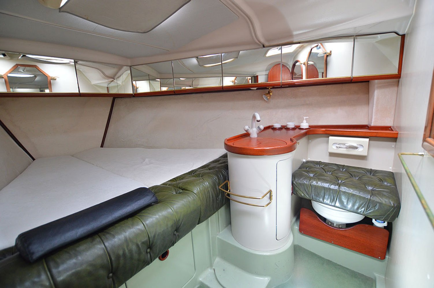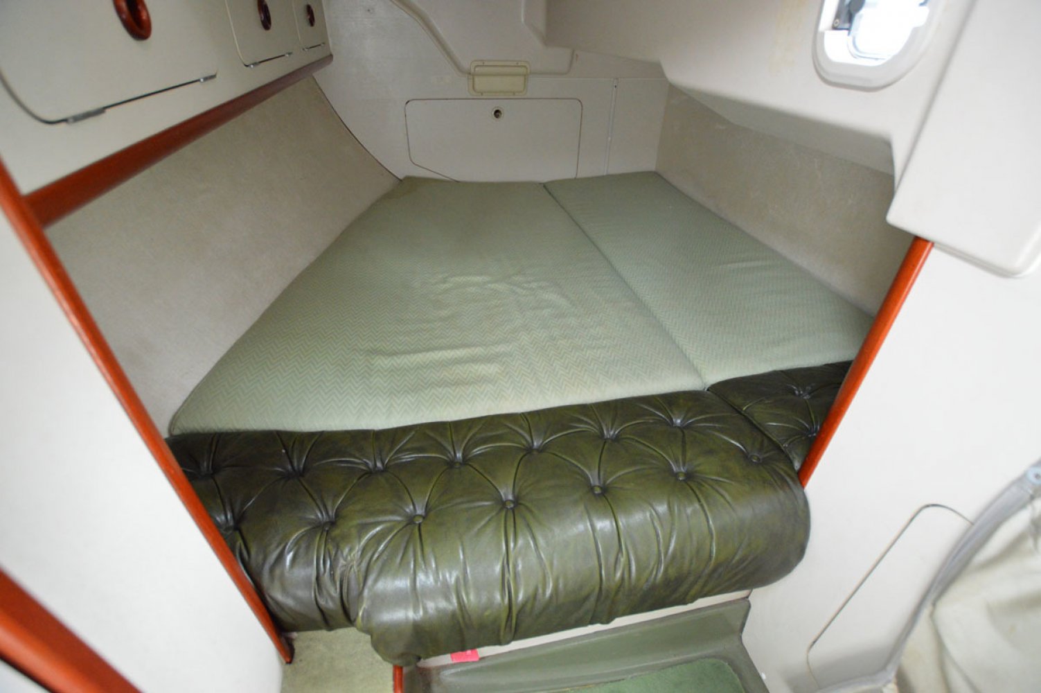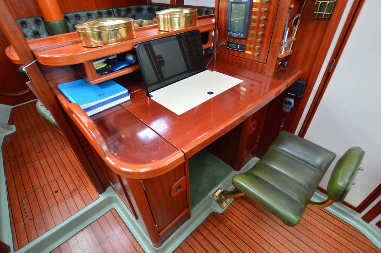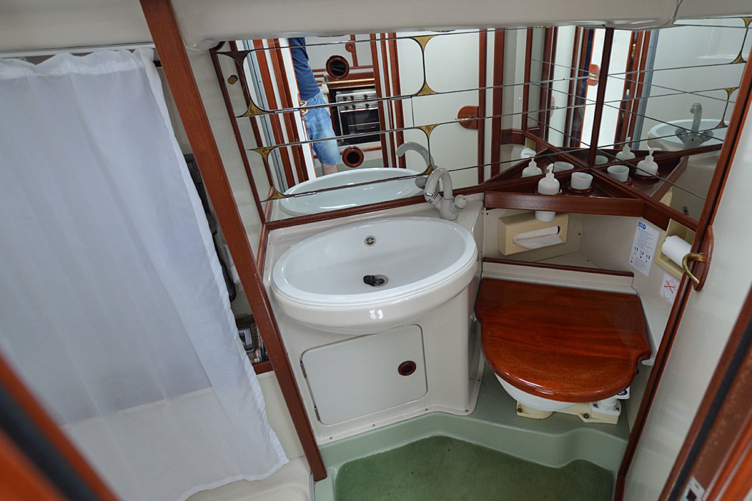 Bij binnenkomst is aan bakboord de kombuis met 3-pits kooktoestel, oven en koelkast. Aan stuurboord de natte cel met toilet, wastafel en douche en de kaartentafel met de nodige navigatieaparatuur. Door gebruik van gelakt mahonie en engels groene lederen bekleding ademt de salon een klassieke sfeer uit, het is goed toeven in de U-vormige bank aan stuurboord, of in één van de twee stoelen aan bakboord. In de punt is een hut met dubbel bed met toilet en wasbak en achter zijn ook nog 2 hutten met een dubbel bed