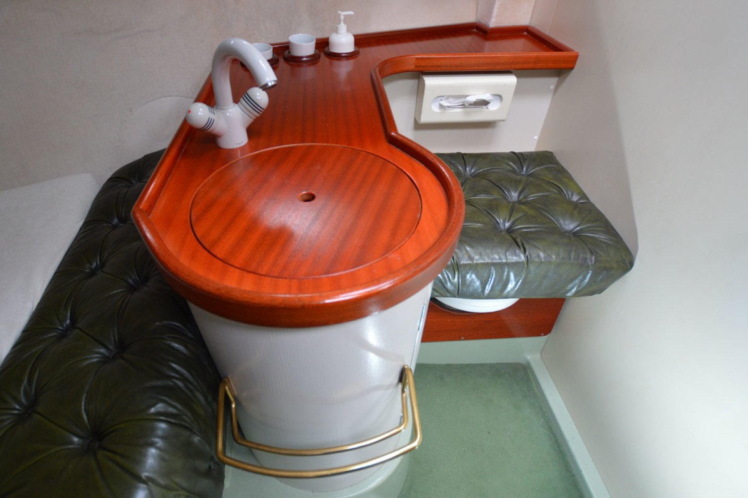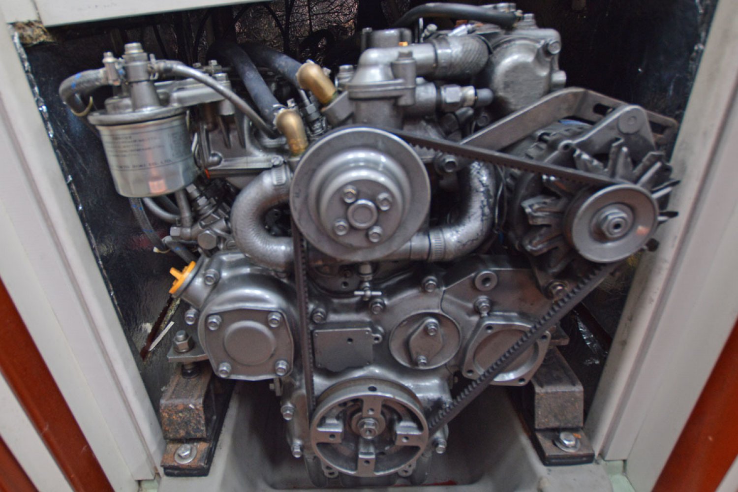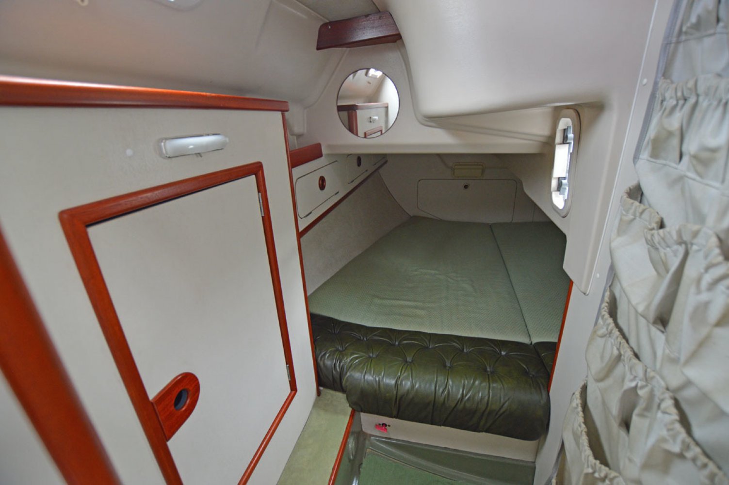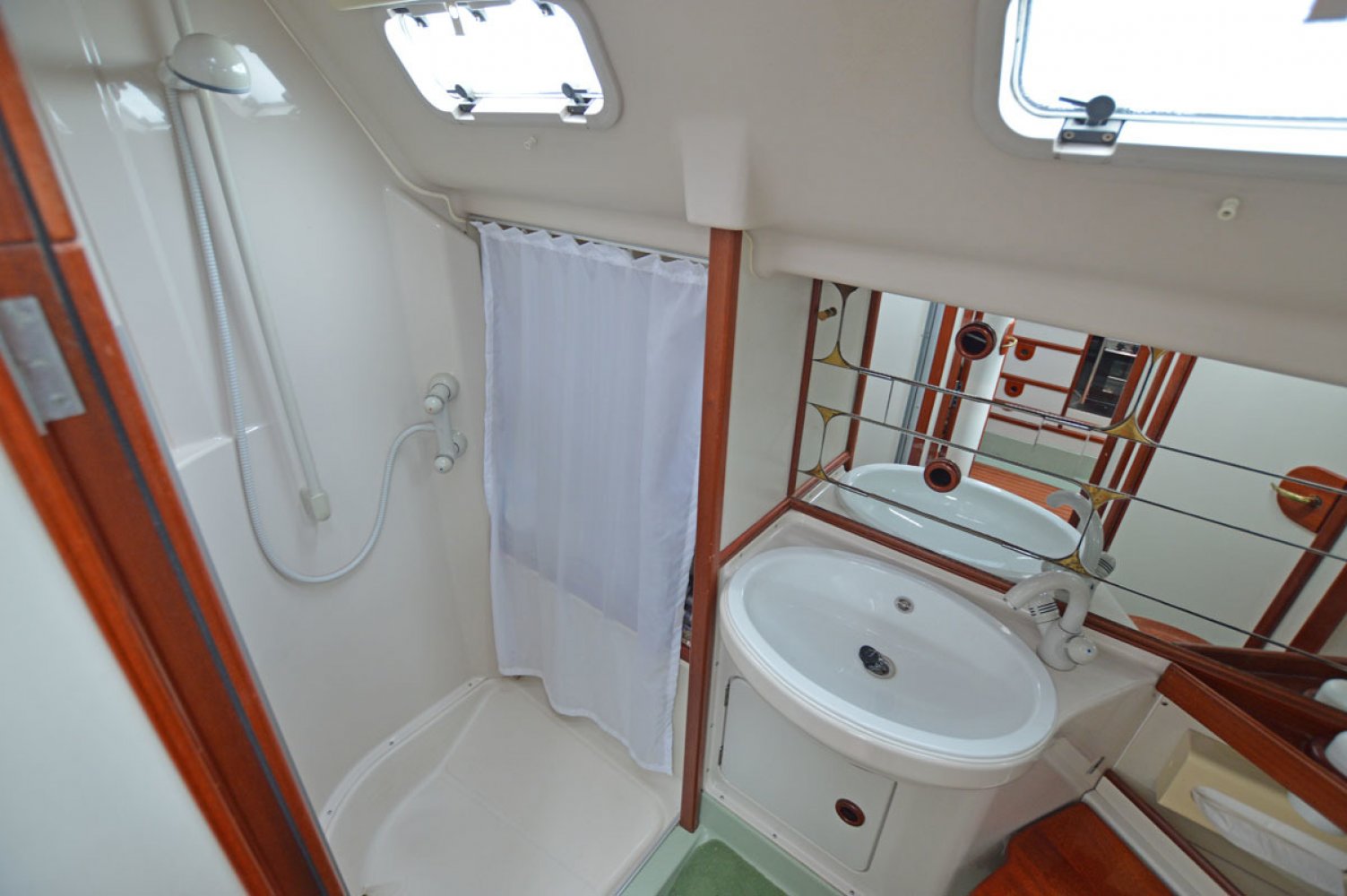 Bij binnenkomst is aan bakboord de kombuis met 3-pits kooktoestel, oven en koelkast. Aan stuurboord de natte cel met toilet, wastafel en douche en de kaartentafel met de nodige navigatieaparatuur. Door gebruik van gelakt mahonie en engels groene lederen bekleding ademt de salon een klassieke sfeer uit, het is goed toeven in de U-vormige bank aan stuurboord, of in één van de twee stoelen aan bakboord. In de punt is een hut met dubbel bed met toilet en wasbak en achter zijn ook nog 2 hutten met een dubbel bed