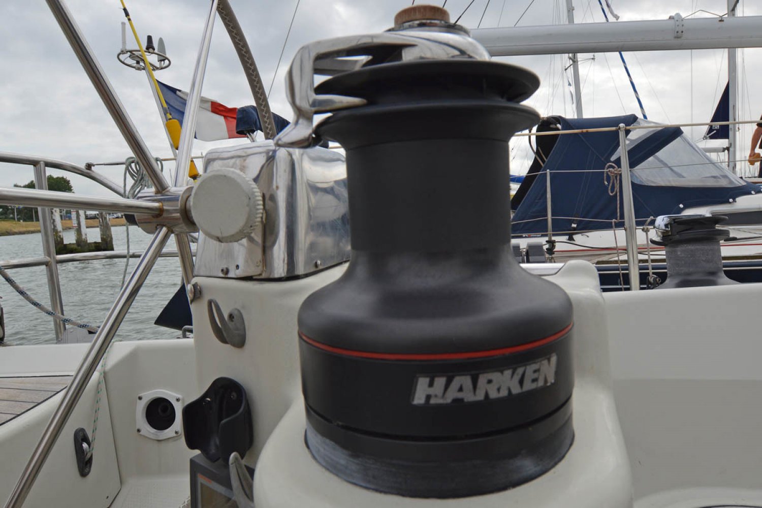 Harken; handmatige lieren; 1x aan de mast, 2 x in de kuip, electrische lieren; 2 x in de kuip