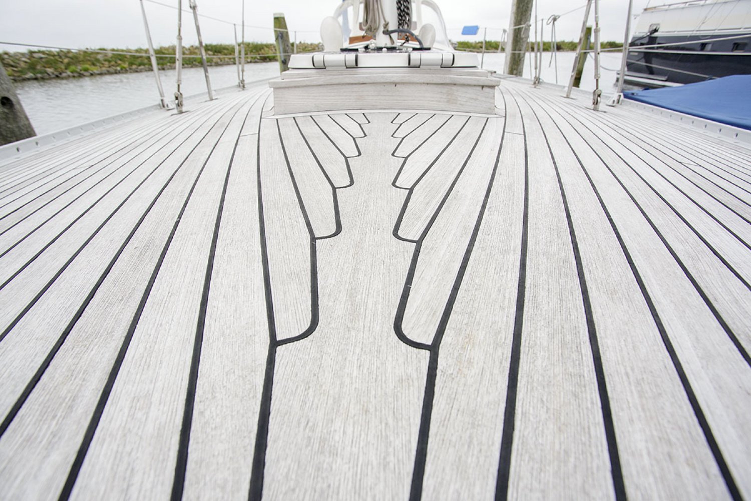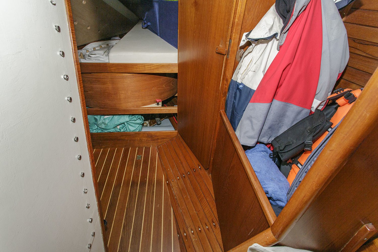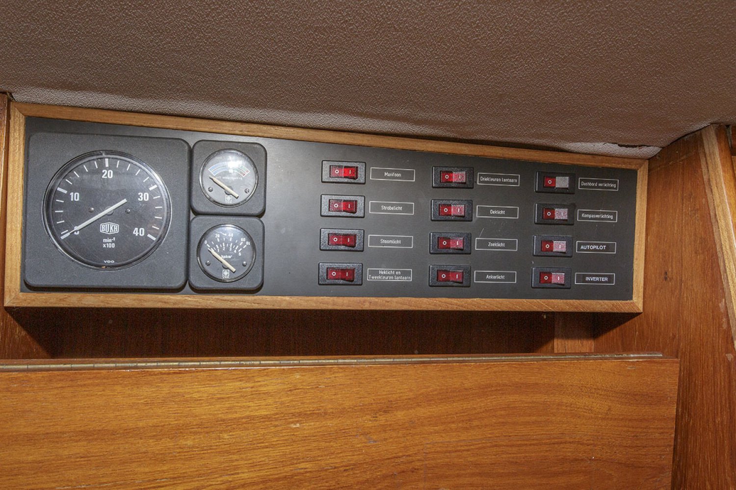 De salon biedt veel zitruimte met langsbanken aan beide kanten en straalt een gezellige sfeer uit. Bij binnenkomst is aan bakboord de kombuis met een 4-pits gas kookplaat, oven, spoelbak en koelkast. Aan bakboord is de kaartentafel met de nodige apparatuur. In de punt is een dubbel bed met aan bakboord het toilet en wastafel en aan stuurboord bergruimte. Onder het bed in de punt bevindt zich een bijzondere bergruimte voor het zeil (zie foto).