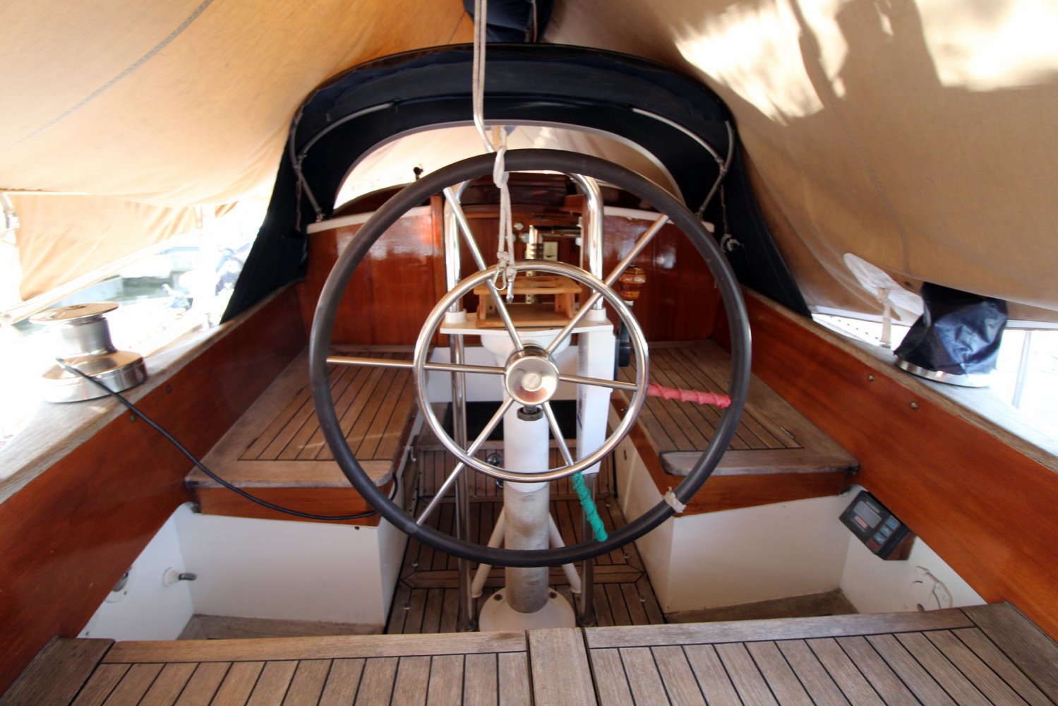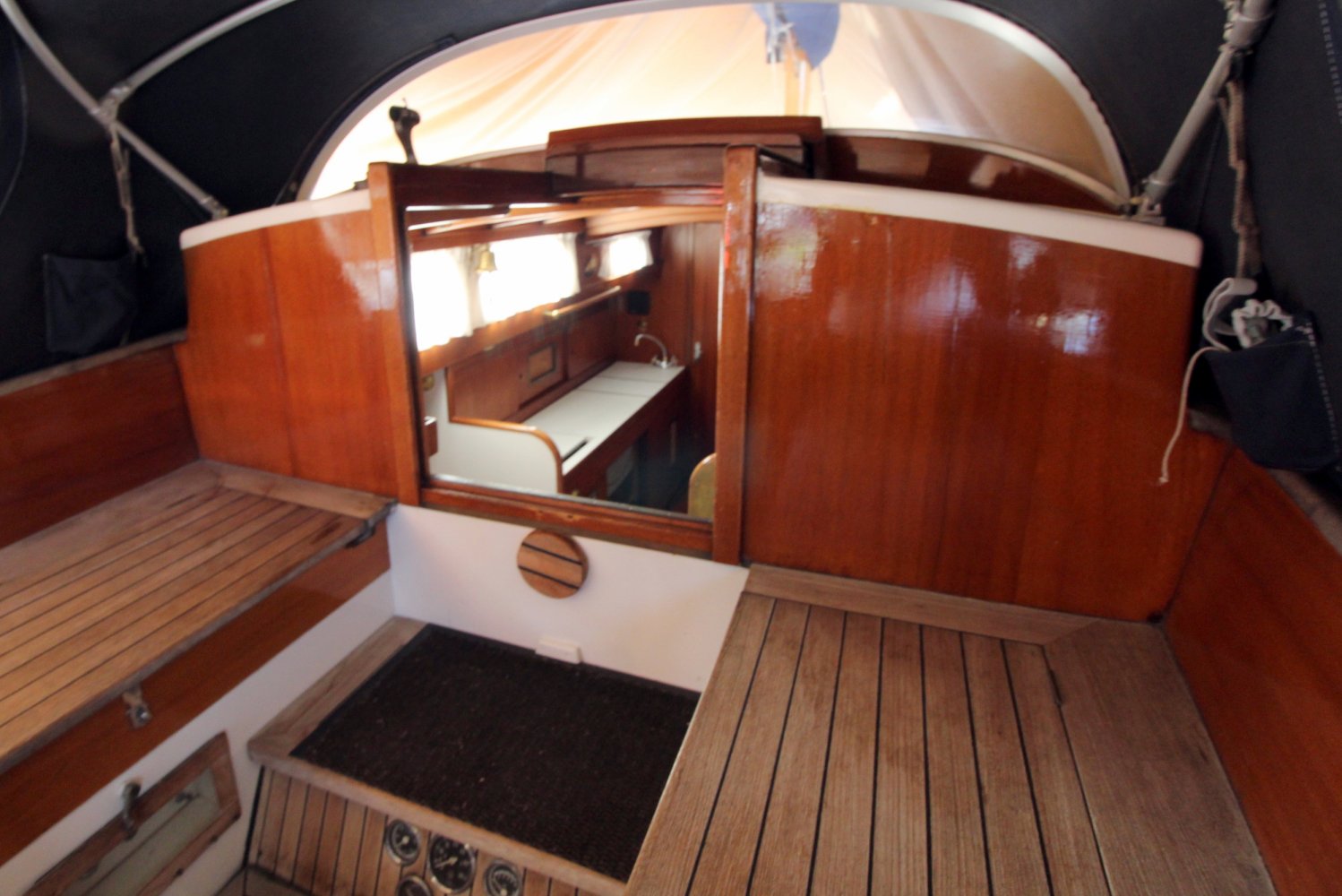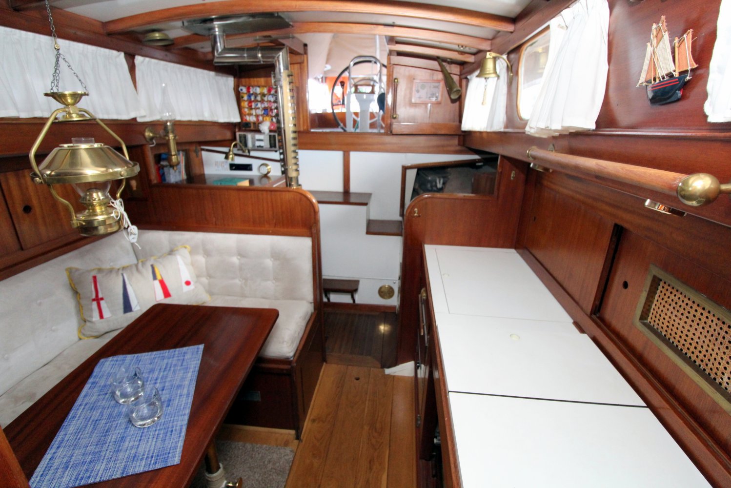 Evenals de gangboorden en het voordek is de kuip aan boord van deze One-Off Zeilboot voorzien van teak hout. Beschutting wordt hier geboden aan u en mede opvarenden door de opbouw en een buiskap. Vanuit de kuip heeft u toegang tot de kajuit waar rondom geplaatste ramen voor een natuurlijk licht zorgen, hetgeen de benedendeks gelegen leefruimte een ruime uitstraling geeft. Een gezellige salon met een warm houten interieur, een comfortabele U-vormige zithoek en veel authentieke details dragen bij aan de plezierig nautische sfeer aan boord. Aan stuurboord, gelijk naast de kajuittrap, treft men de navigatiehoek aan welke beschikt over de nodige berg -en werkruimte. Een ruime kombuis en een toilet met wastafel ontbreken natuurlijk niet aan boord van deze One-Off Zeilboot. Verder heeft men de beschikking over 5 slaapplaatsen; eigenaarsverblijf in de boeg met een twee persoons bed, de zithoek welke veranderd kan worden in nog eens twee slaapplaatsen en een één persoons bed aan bakboord naast de kajuittrap, een slaapplaats die gedeeltelijk onder de kuip loopt.
