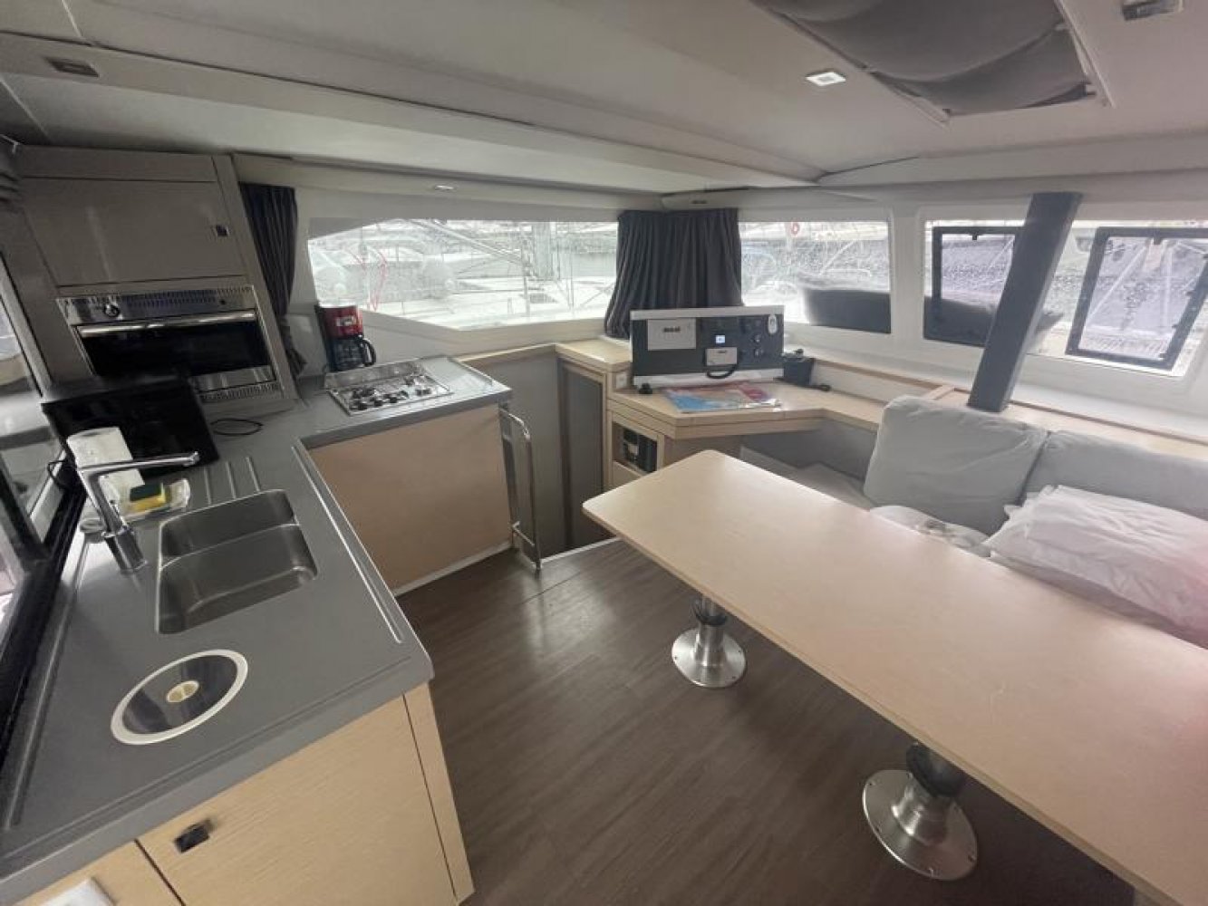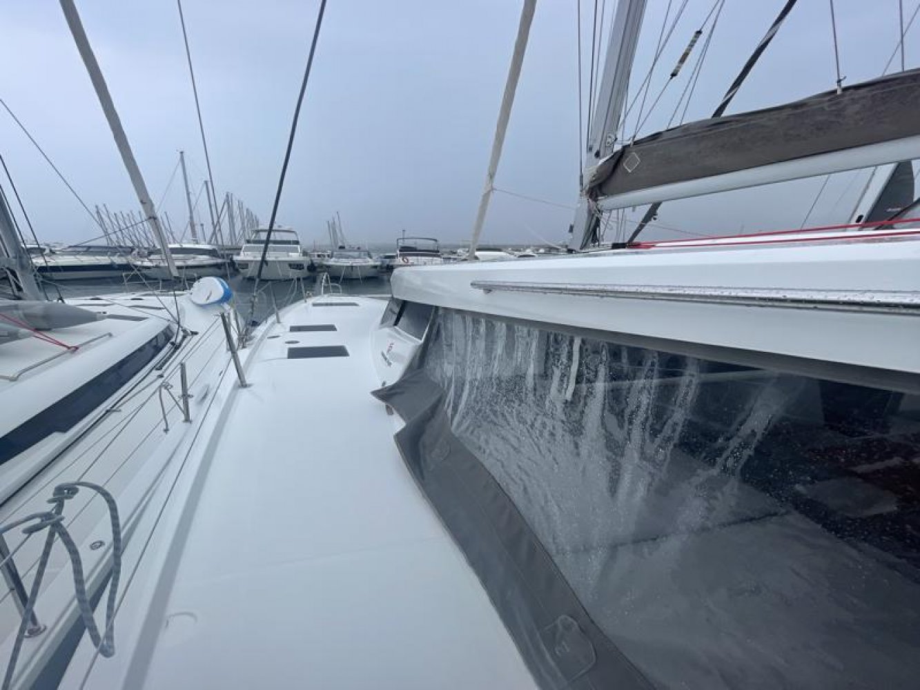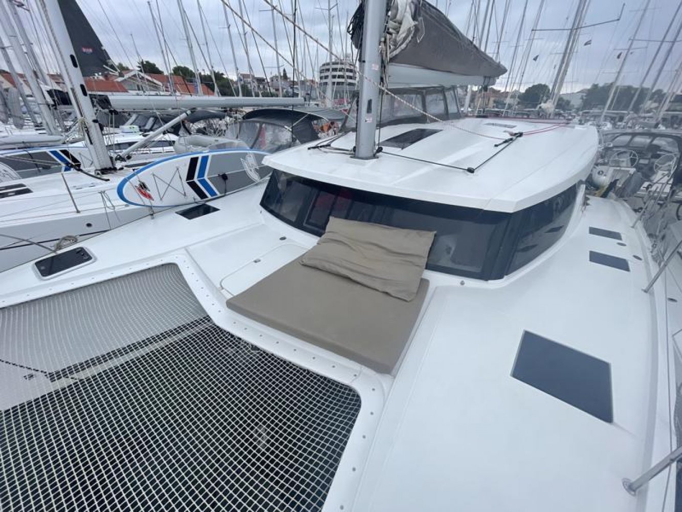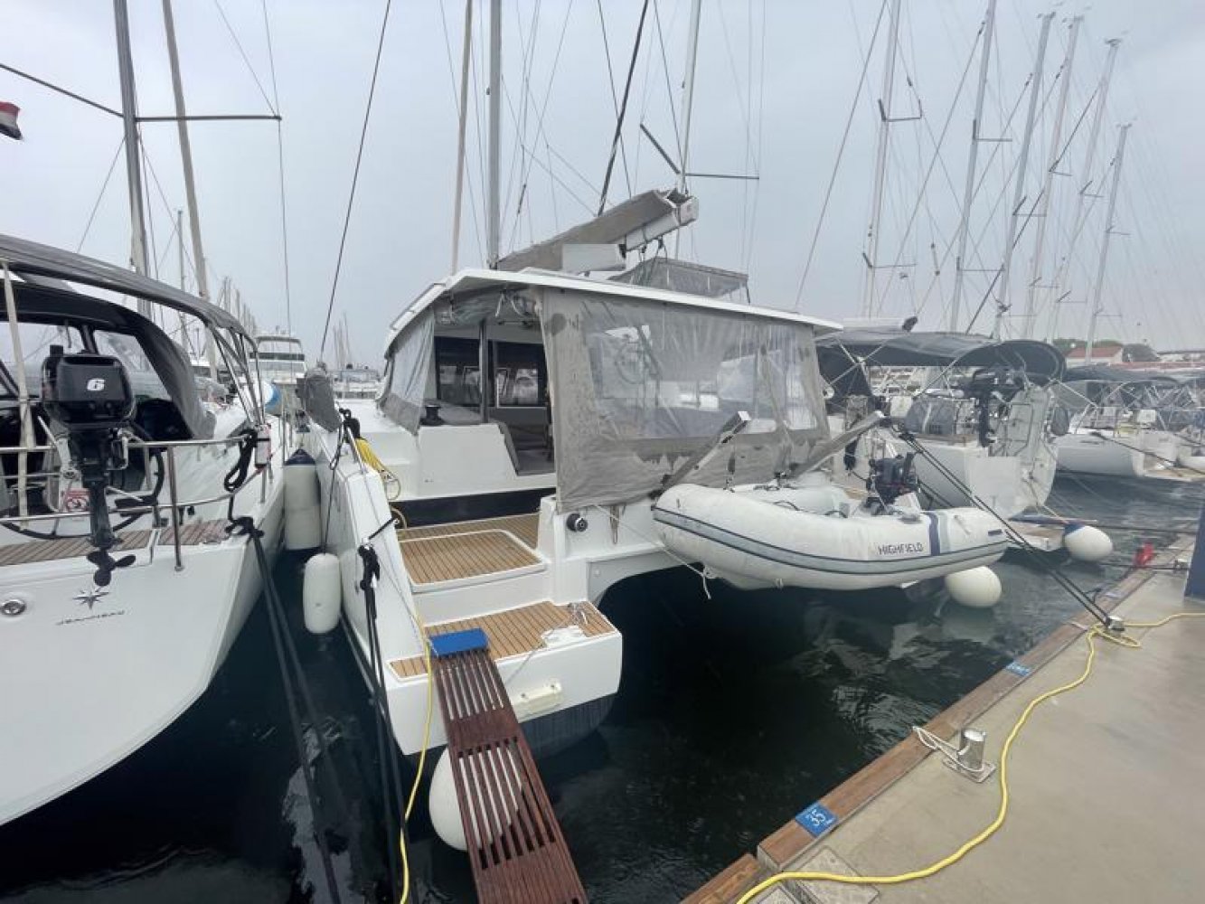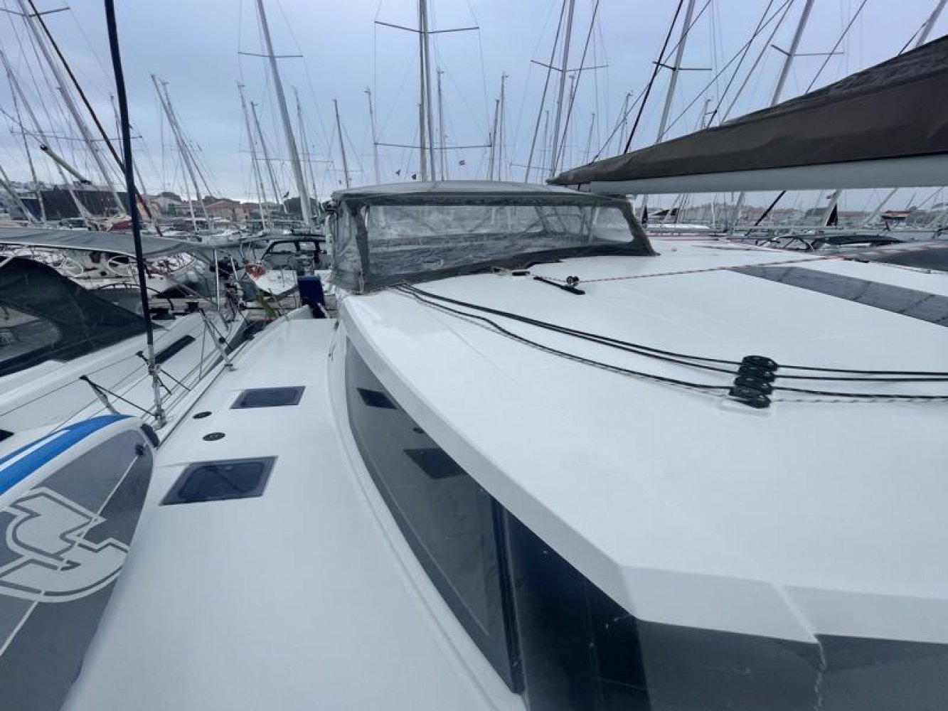 Deze Fountaine Pajot Lucia 40 uit 2017 is een zeer goed onderhouden ex-charter jacht.  Onder haar apparatuur kunnen we benadrukken : generator, airconditioning, webasto verwarming, zonnepanelen, watermaker (2021) en ijsmachine (2021). Ze vaart onder Kroatische vlag.