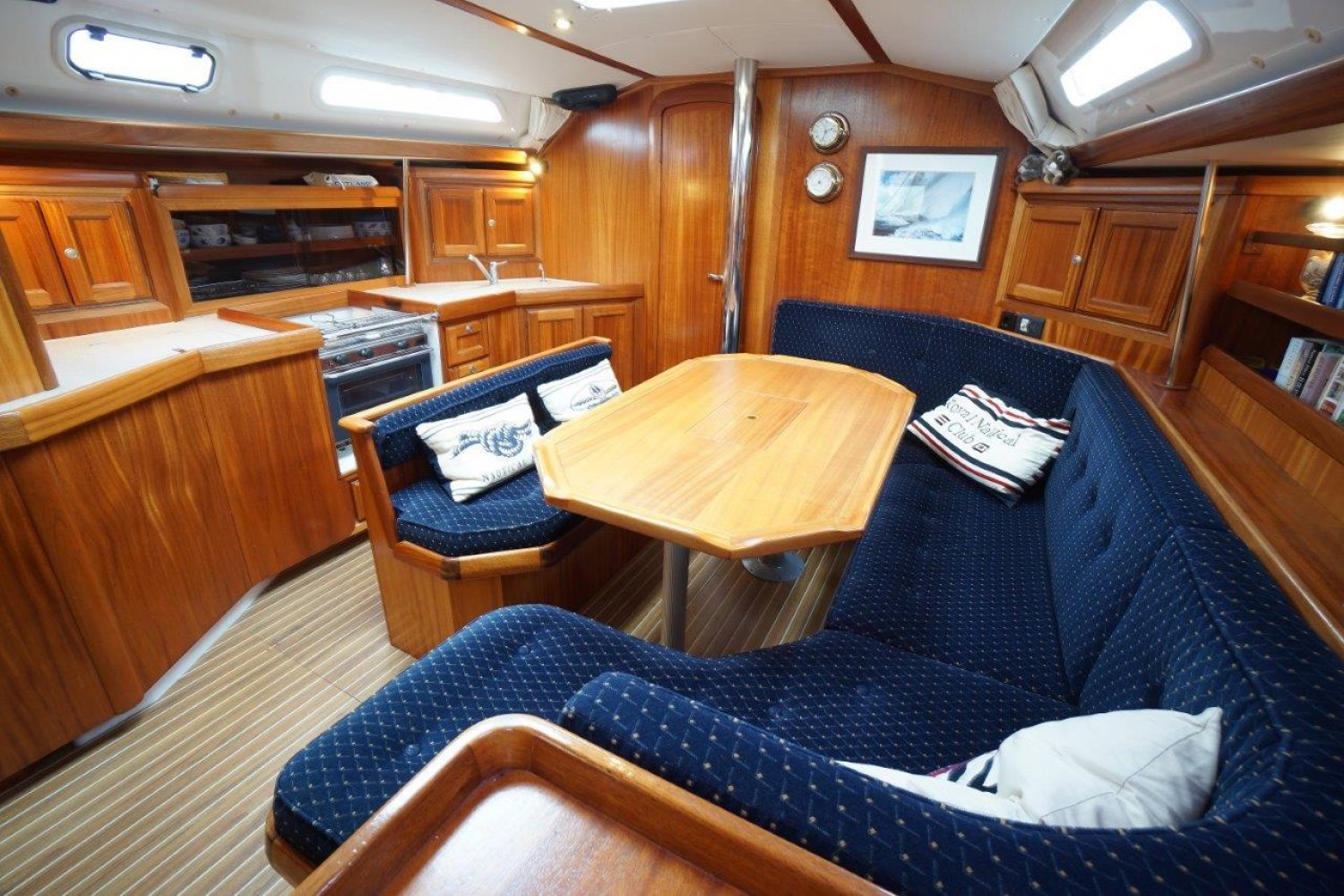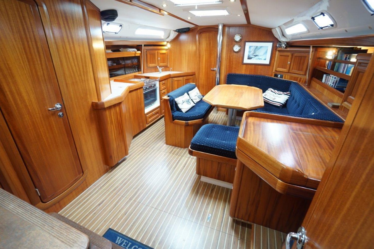 Midscheeps is de ruime salon met aan bakboord een praktisch kombuis en aan stuurboord een riante rondzit met een tafel in het midden. De grote zitbank heeft de huidige eigenaar overigens professioneel laten aanpassen zodat deze nog wat ruimer en comfortabeler zit.
