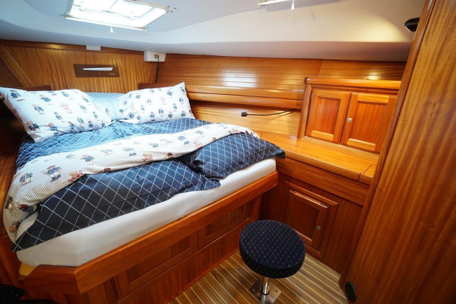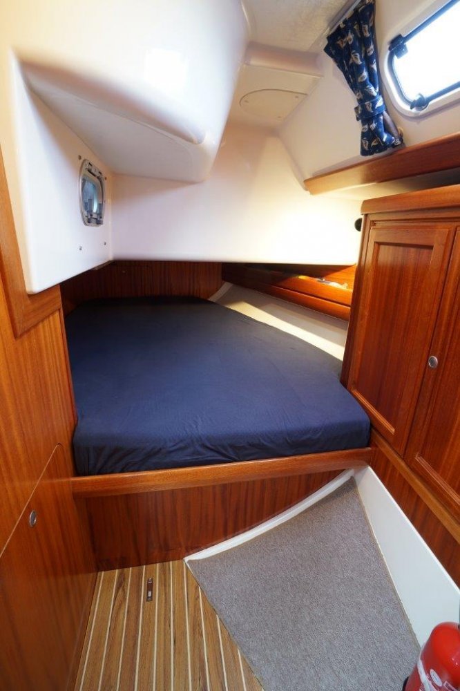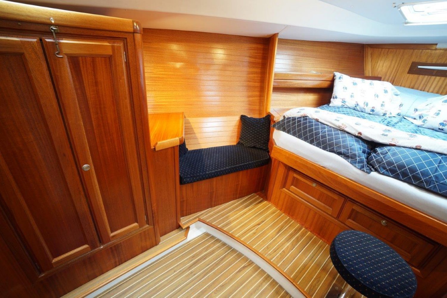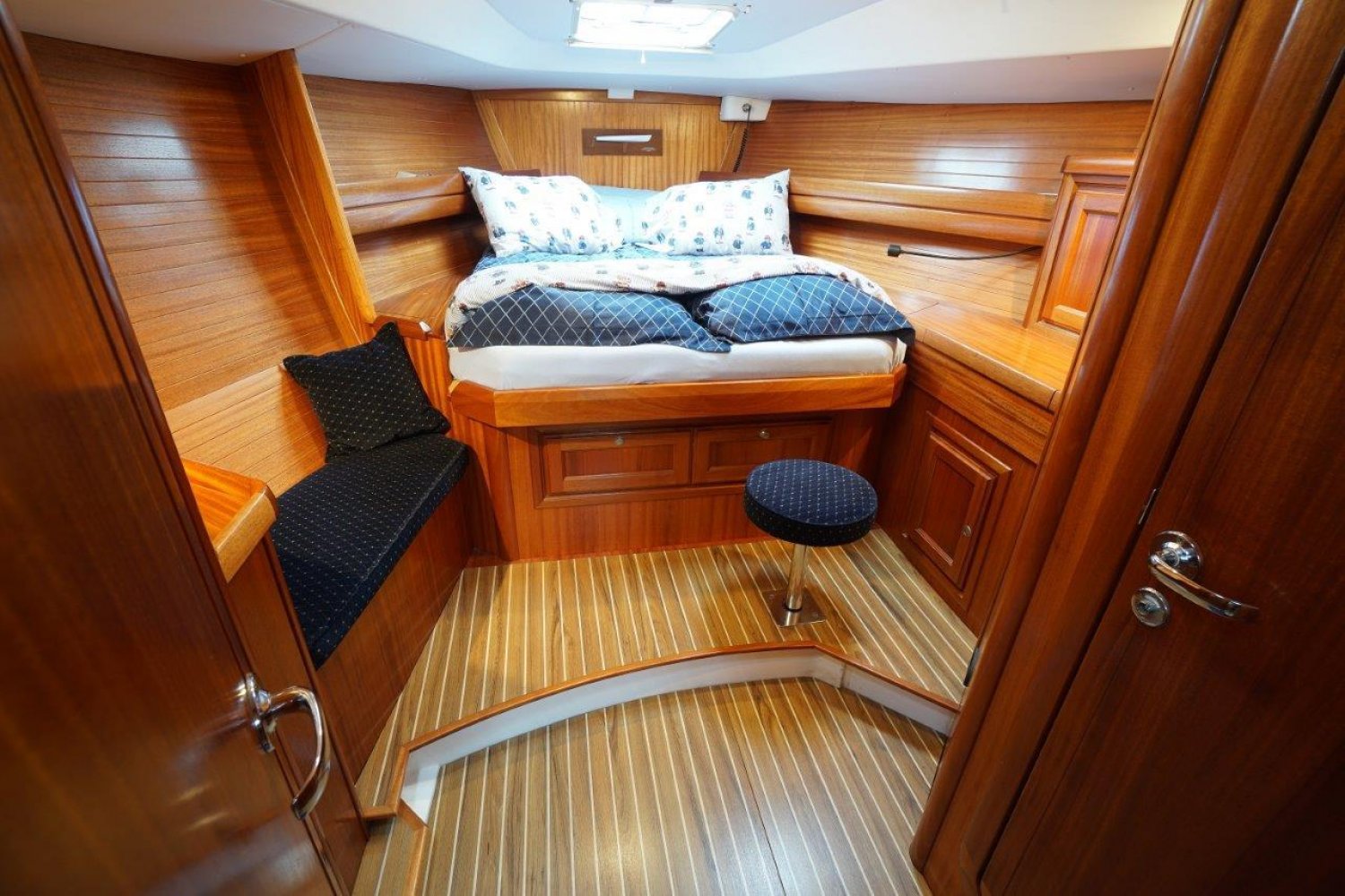 In het achterschip treft u twee ruime hutten aan. Elk voorzien van de nodige bergruimte en twee persoonsbedden. Een stukje naar voren in het schip is aan stuurboord een ruim opgezette kaartentafel. Voorzien van de nodige apparatuur en de bediening van alle boordsystemen. Hier tegenover is aan bakboord de een van de twee natte cellen met onderwatertoilet en een separate douchegelegenheid.