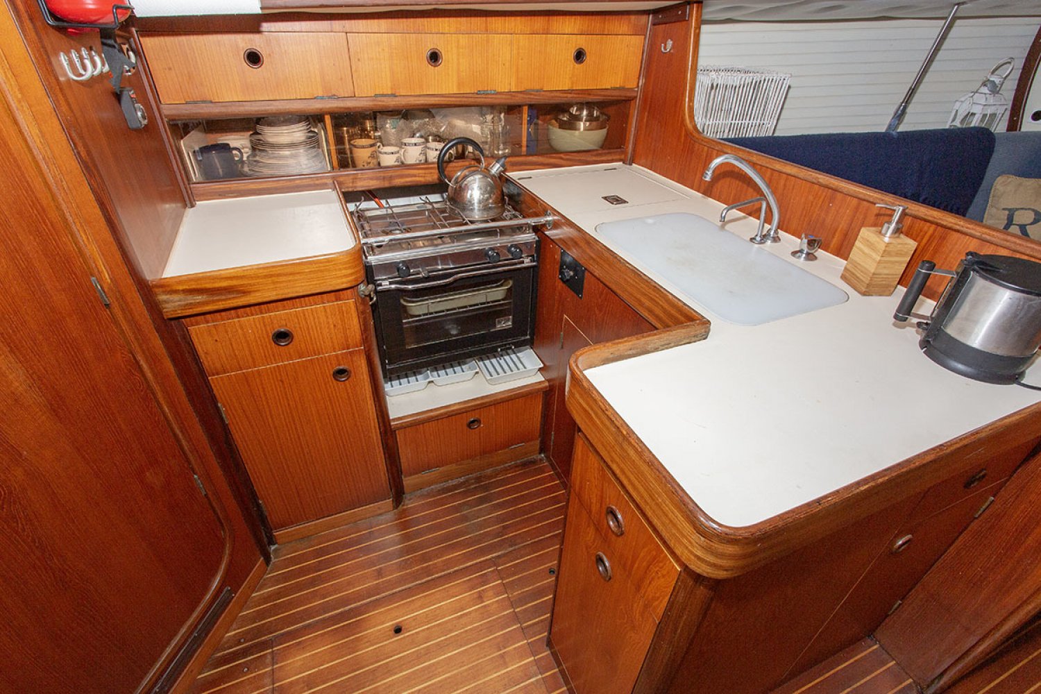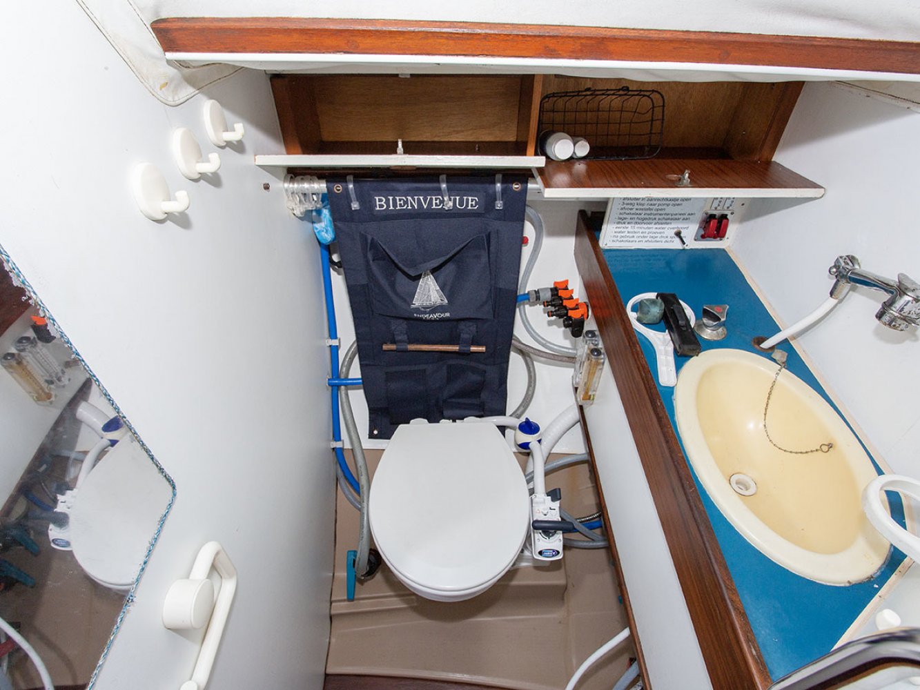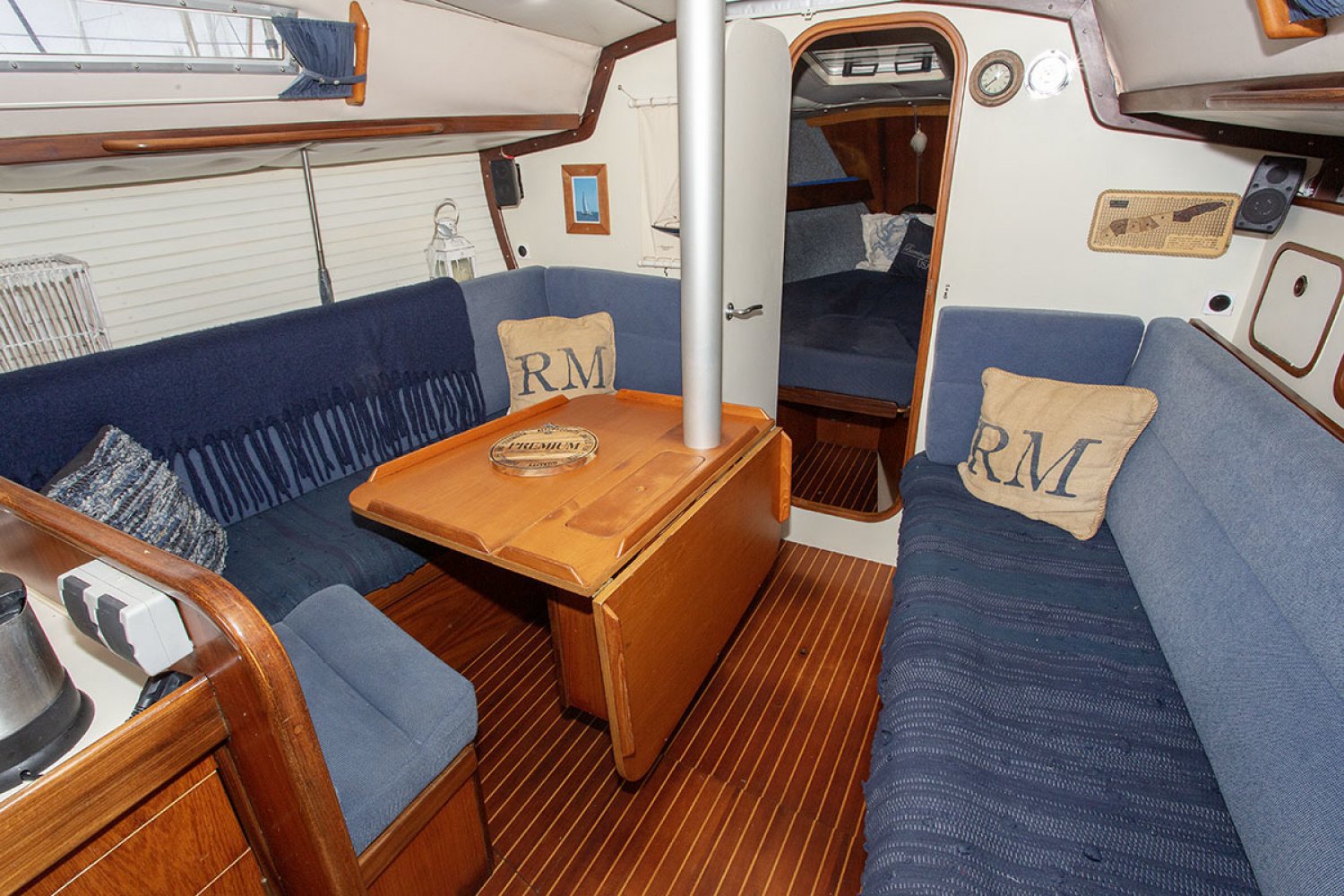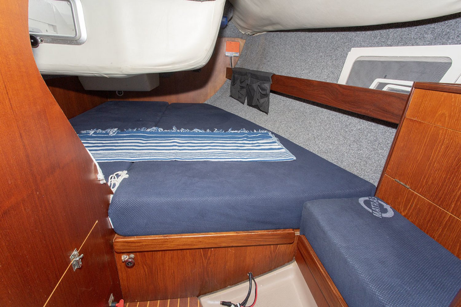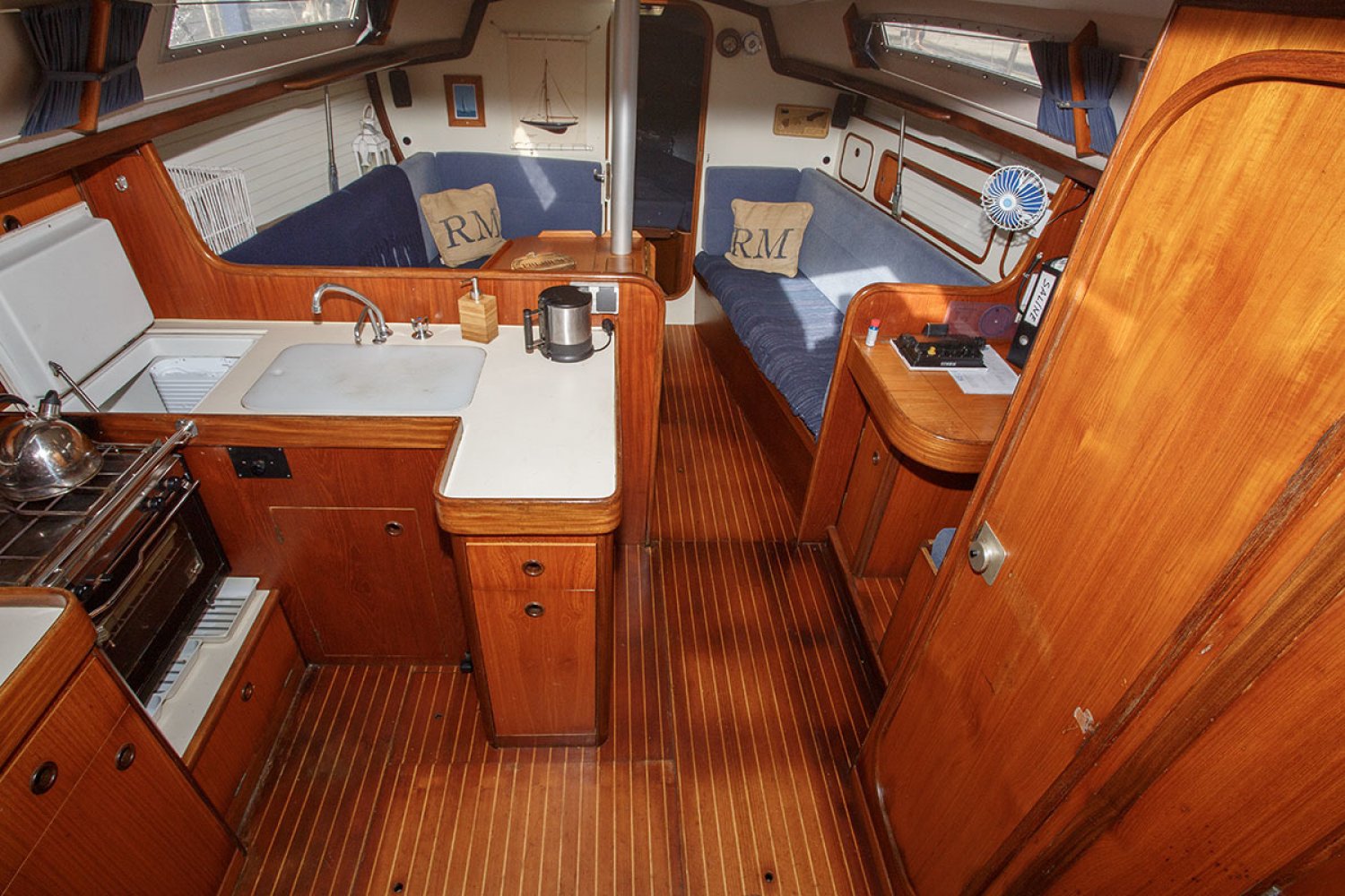 Binnen treft u een praktische en warme salon aan die opvallend ruim aandoet. Aan bakboord is de kombuis en daar tegenover aan stuurboord de kaartentafel. In het voorschip is een twee persoons hut met de nodige opbergruimte. In het achterschip is aan stuurboord een hut met twee loodskooien en aan bakboord een ruime tweepersoons hut. Er is een natte cel met toilet en douche. Kortom, een lekker ruim zeiljacht met overzichtelijke buitenmaten, ideaal voor een fijne vakantie of gewoon een lekker dagje op het water met het hele gezin.