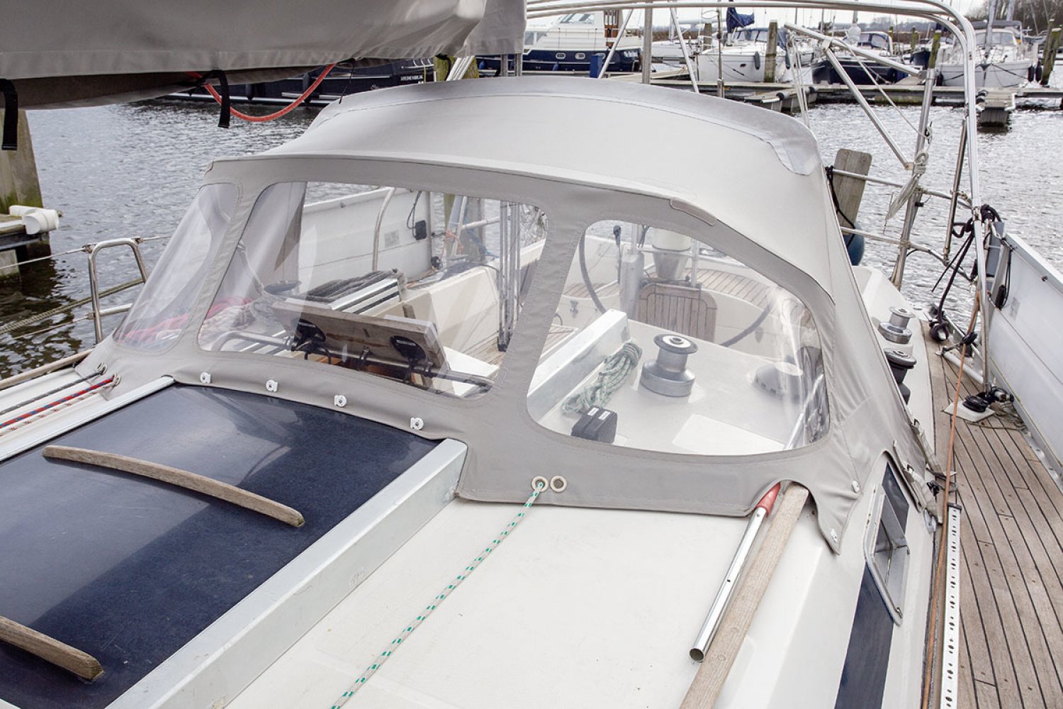 34 m² Off-shore/racing, 9 Oz. (385gr) US High Modulus Premium Dacron, cross-cut Sunbrella UV strook in cadet grey kleur, Foam in voorlijk