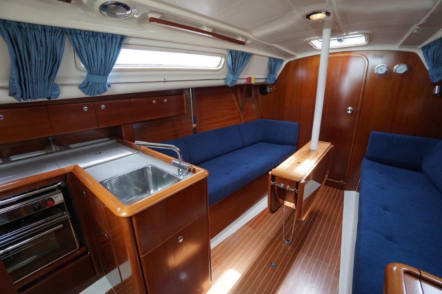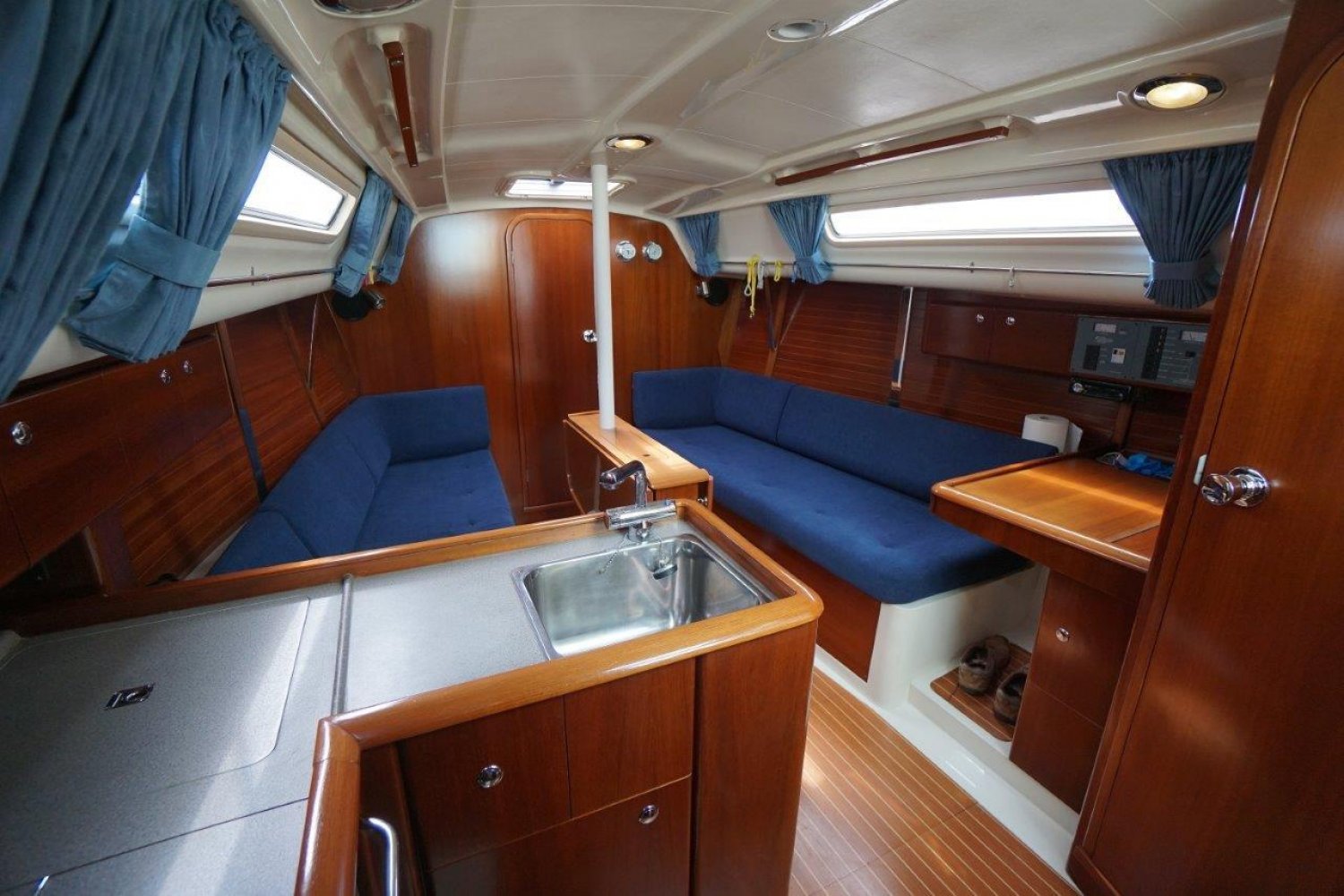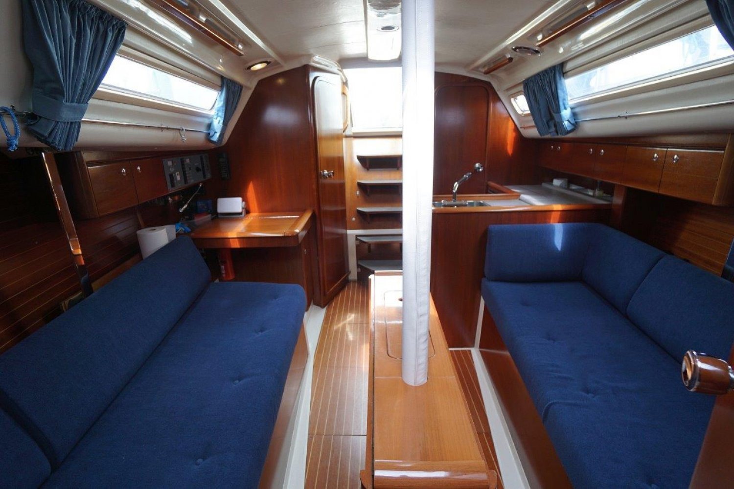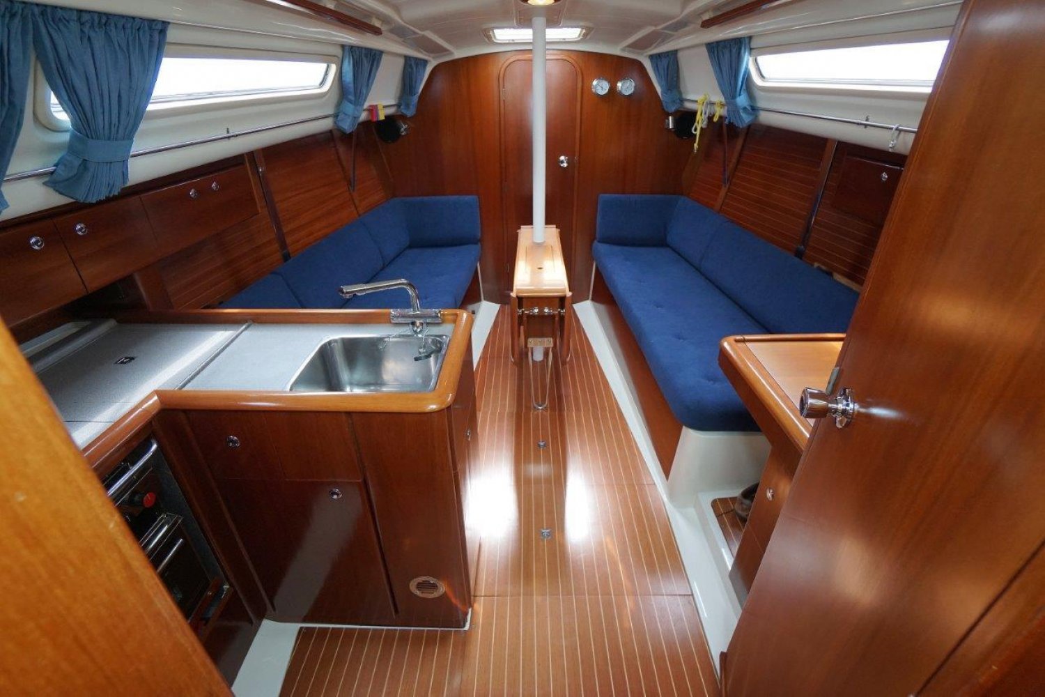 Binnenin het schip treft u een Moody-waardig interieur aan. Alles is netjes afgewerkt en ze maakt een opvallend ruime indruk. Aan bakboord is een compact maar praktisch kombuis. Uiteraard voorzien van een fornuis, koelkast, stromend water en de nodige opbergruimte. Hier tegenover is aan stuurboord de ruime natte cel met douchegelegenheid. Midscheeps is de salon met aan beide kanten langsbanken met een tafel in het midden. In de voorpiek is een gastenhut met plaats voor twee personen om te slapen. In het achterschip is verbazend ruime achterhut.
