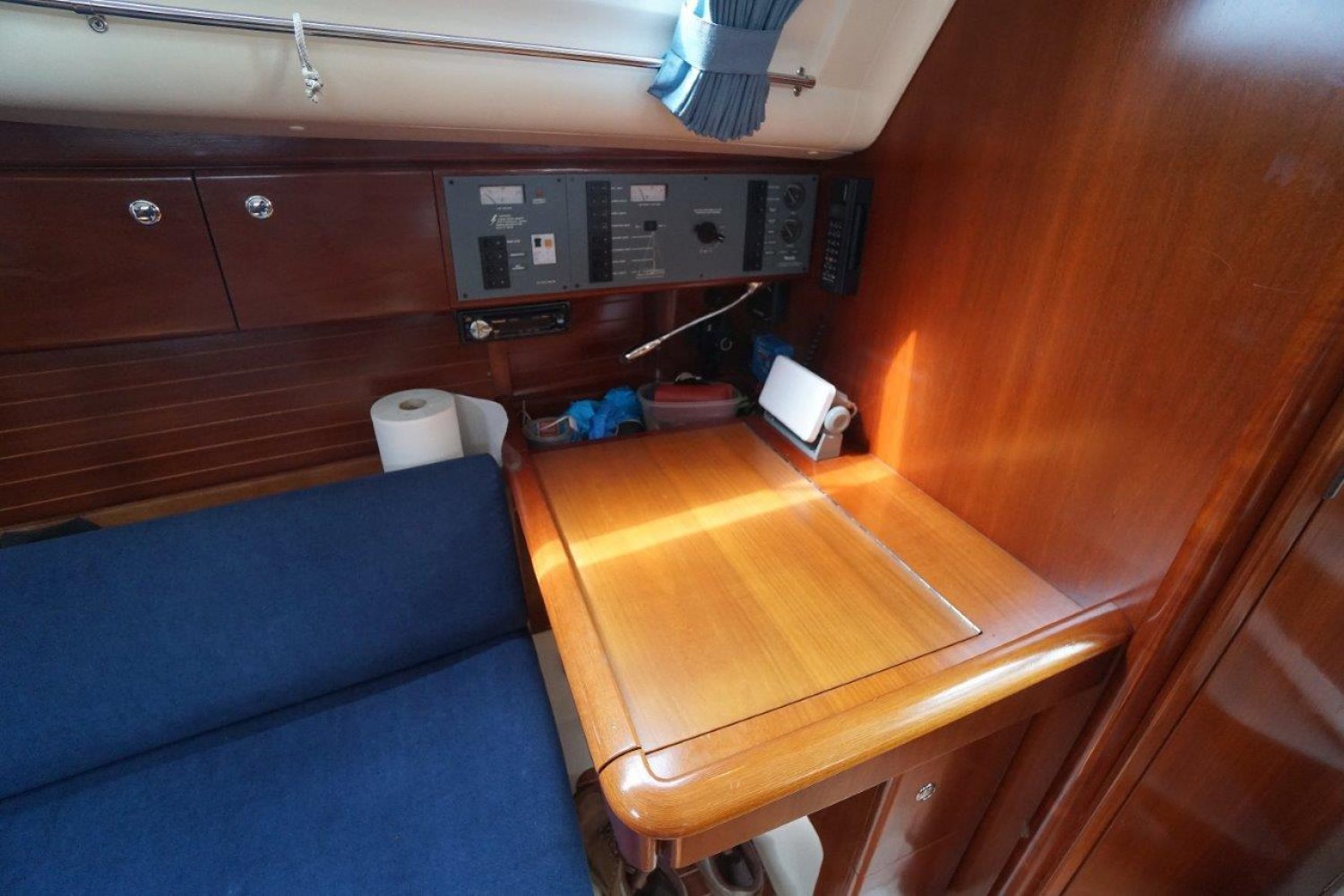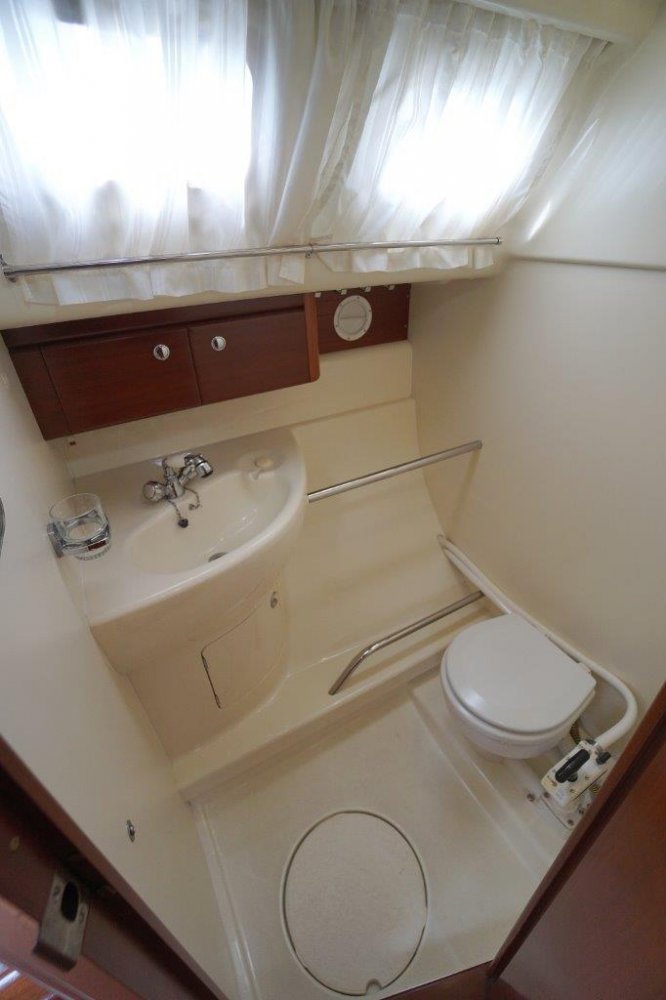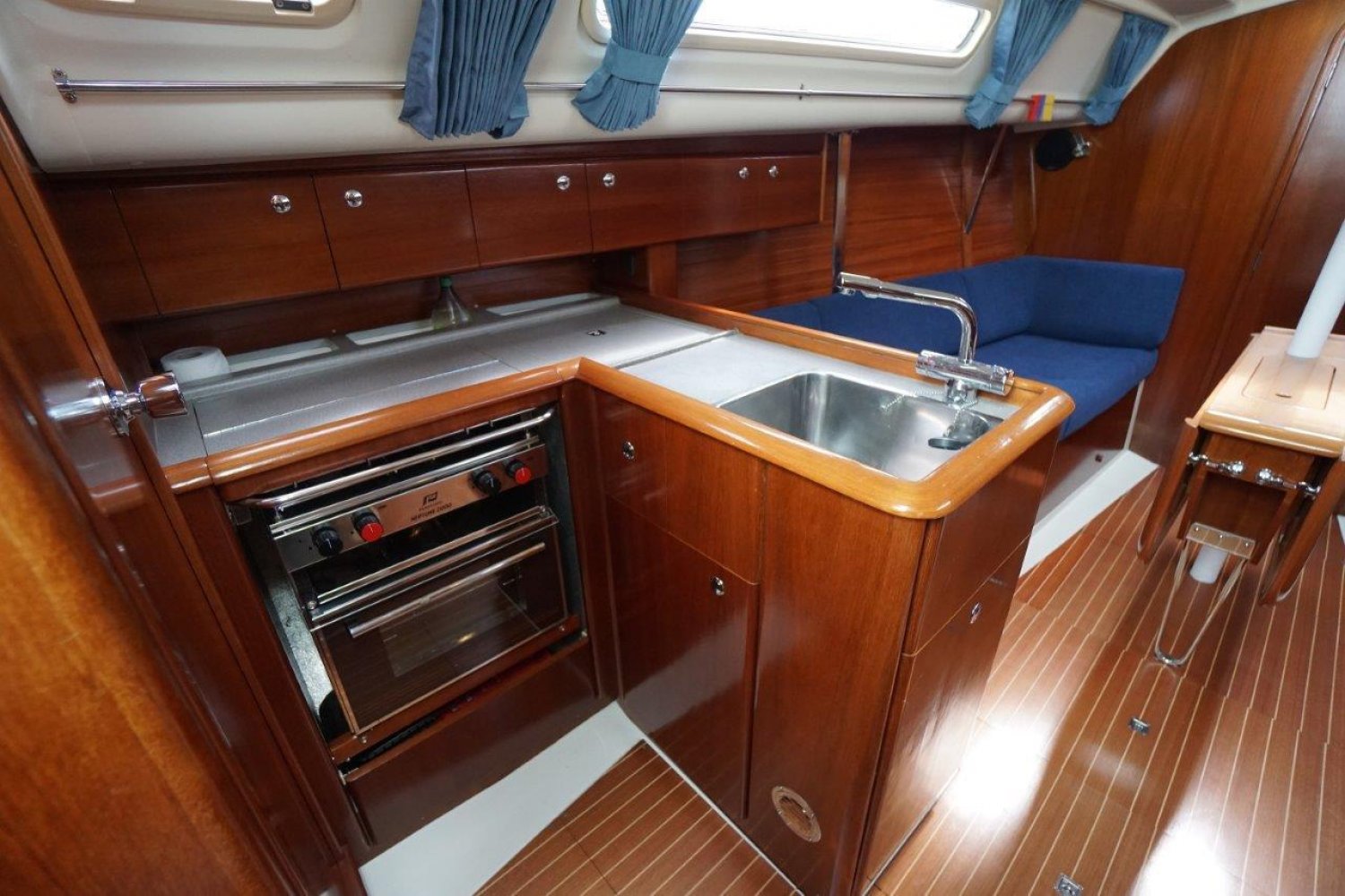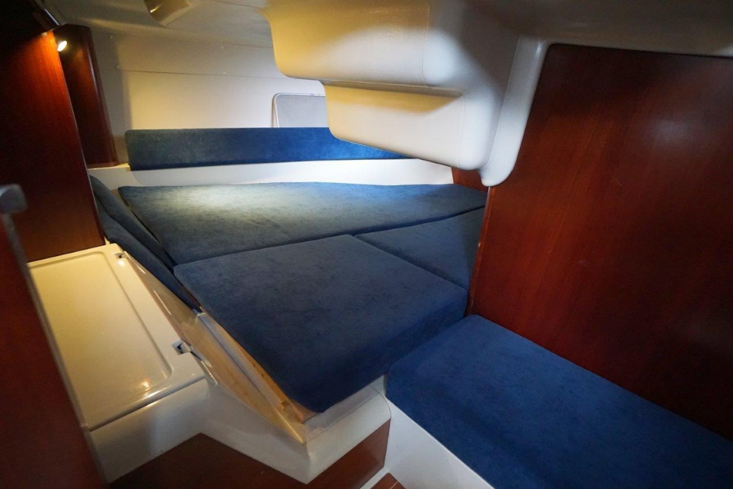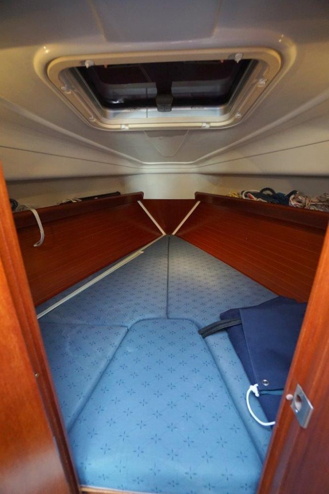 Binnenin het schip treft u een Moody-waardig interieur aan. Alles is netjes afgewerkt en ze maakt een opvallend ruime indruk. Aan bakboord is een compact maar praktisch kombuis. Uiteraard voorzien van een fornuis, koelkast, stromend water en de nodige opbergruimte. Hier tegenover is aan stuurboord de ruime natte cel met douchegelegenheid. Midscheeps is de salon met aan beide kanten langsbanken met een tafel in het midden. In de voorpiek is een gastenhut met plaats voor twee personen om te slapen. In het achterschip is verbazend ruime achterhut.