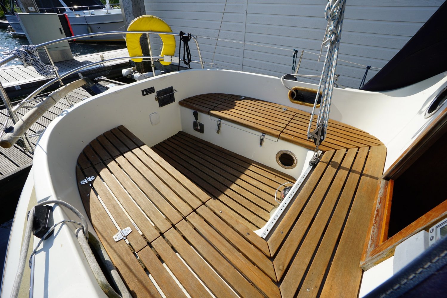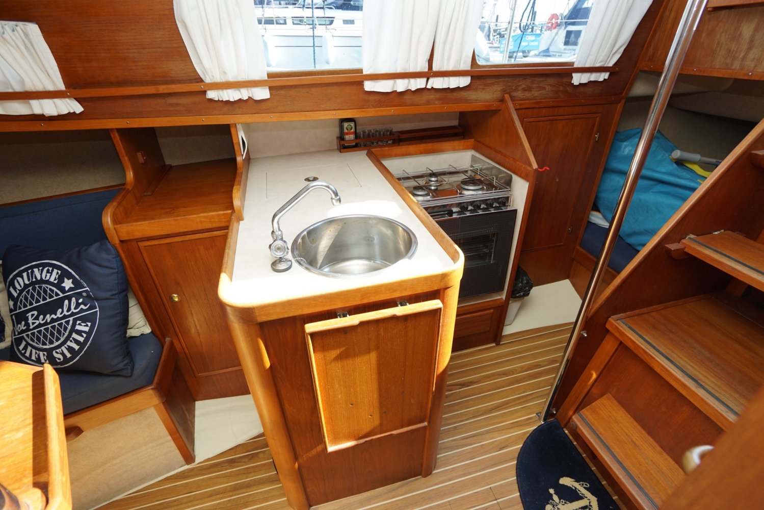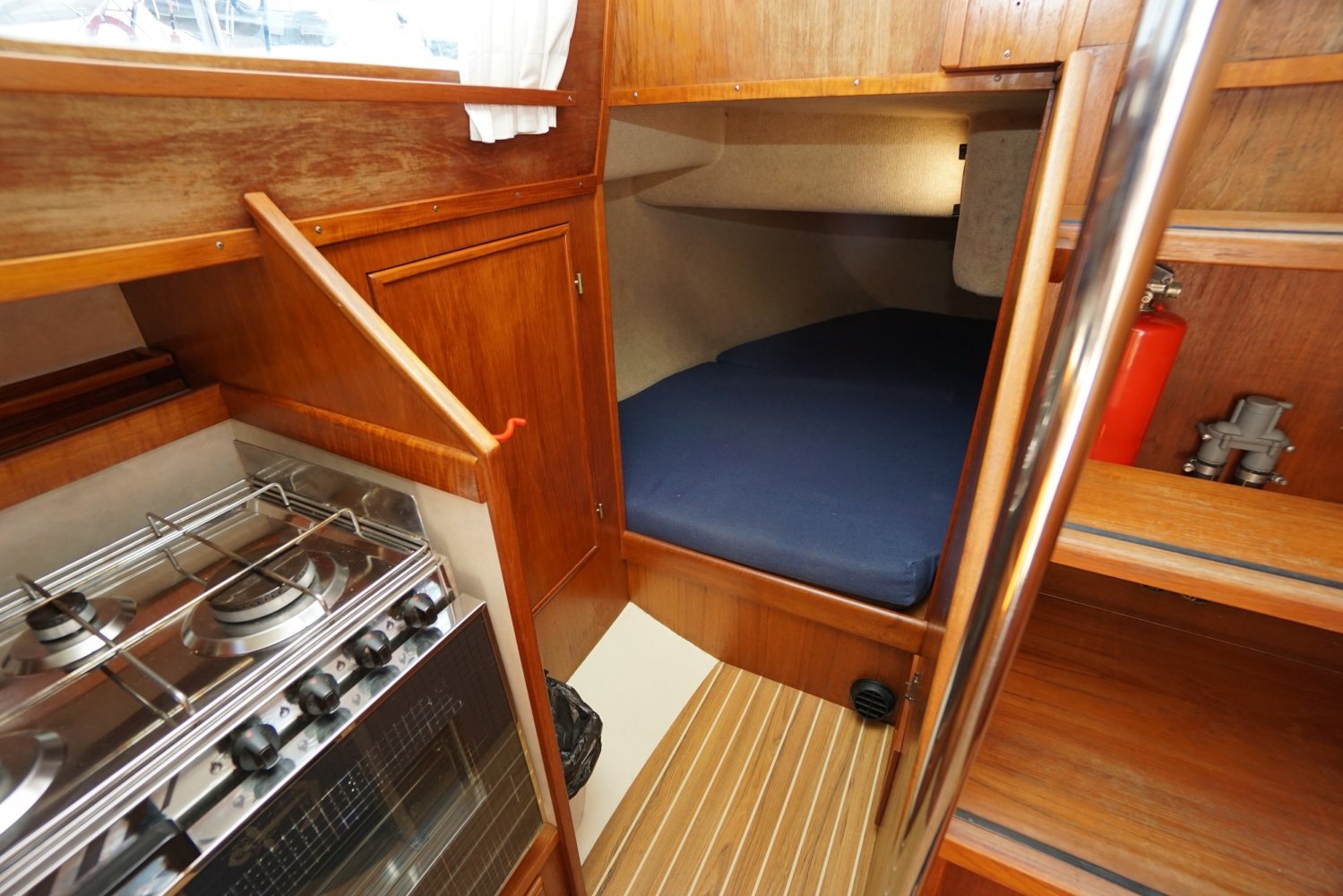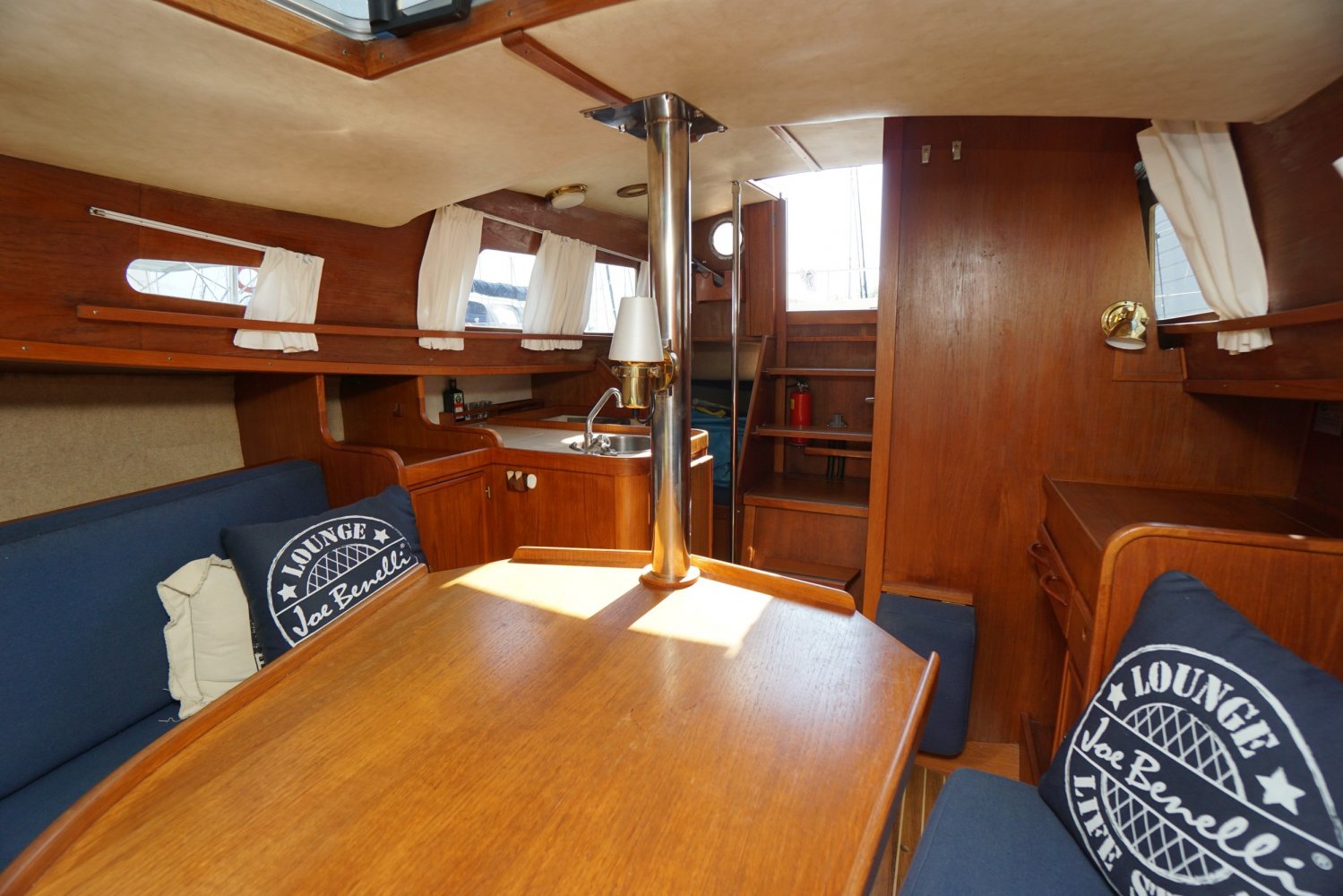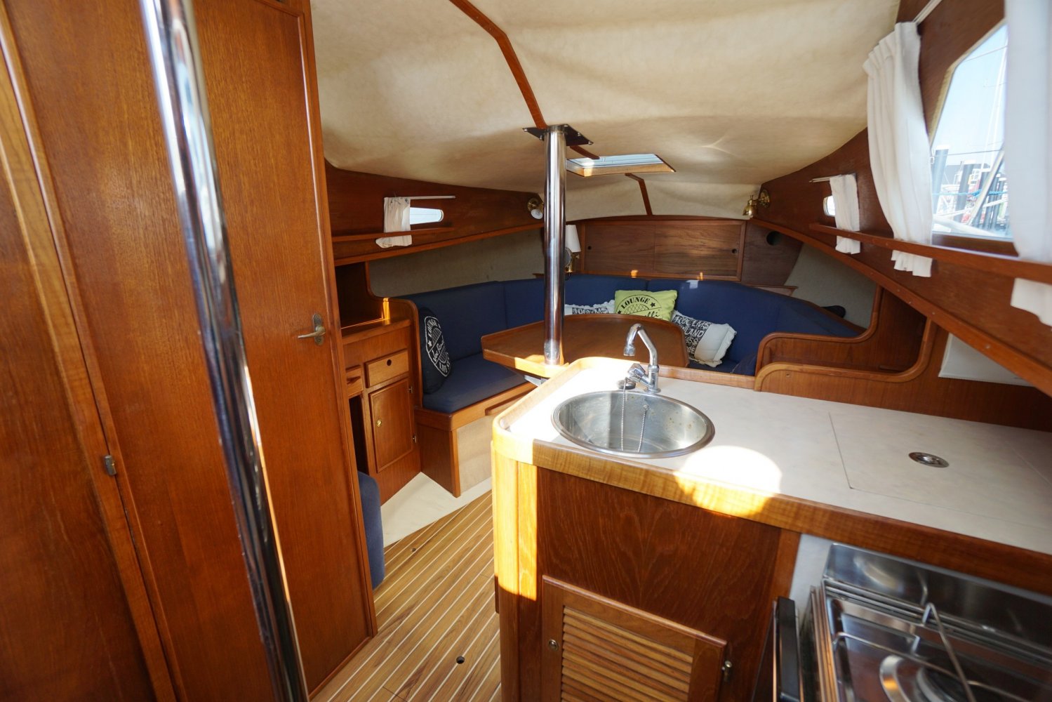 Een gemoedelijke zeiler (S-spant) met geringe diepgang. De kuip en het interieur zijn voor haar lengte verassend ruim, het schip zit vol slimme oplossingen. Zo is de zitting van de kaartentafel wegklapbaar, is de wasbak in de toilet ruimte weg te schuiven en vindt u zowel een doorgang naar de achterhut via de toilet ruimte als via de salon. De ruimte in het achterschip is eventueel weer terug te brengen naar een twee hut variant.