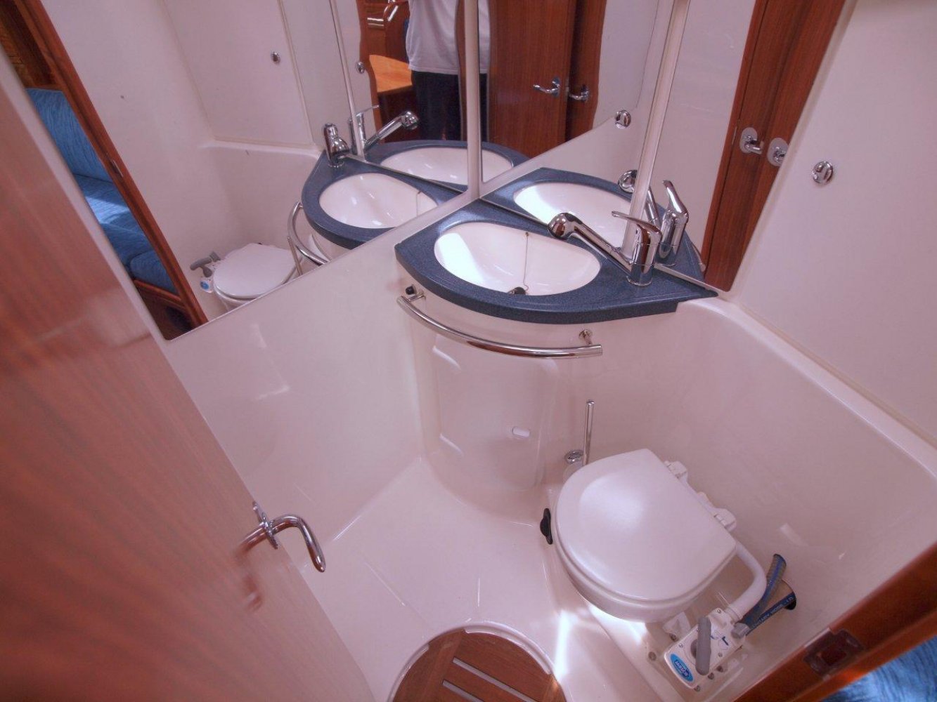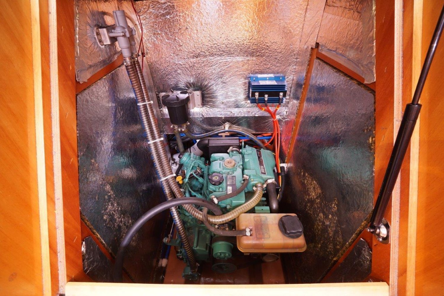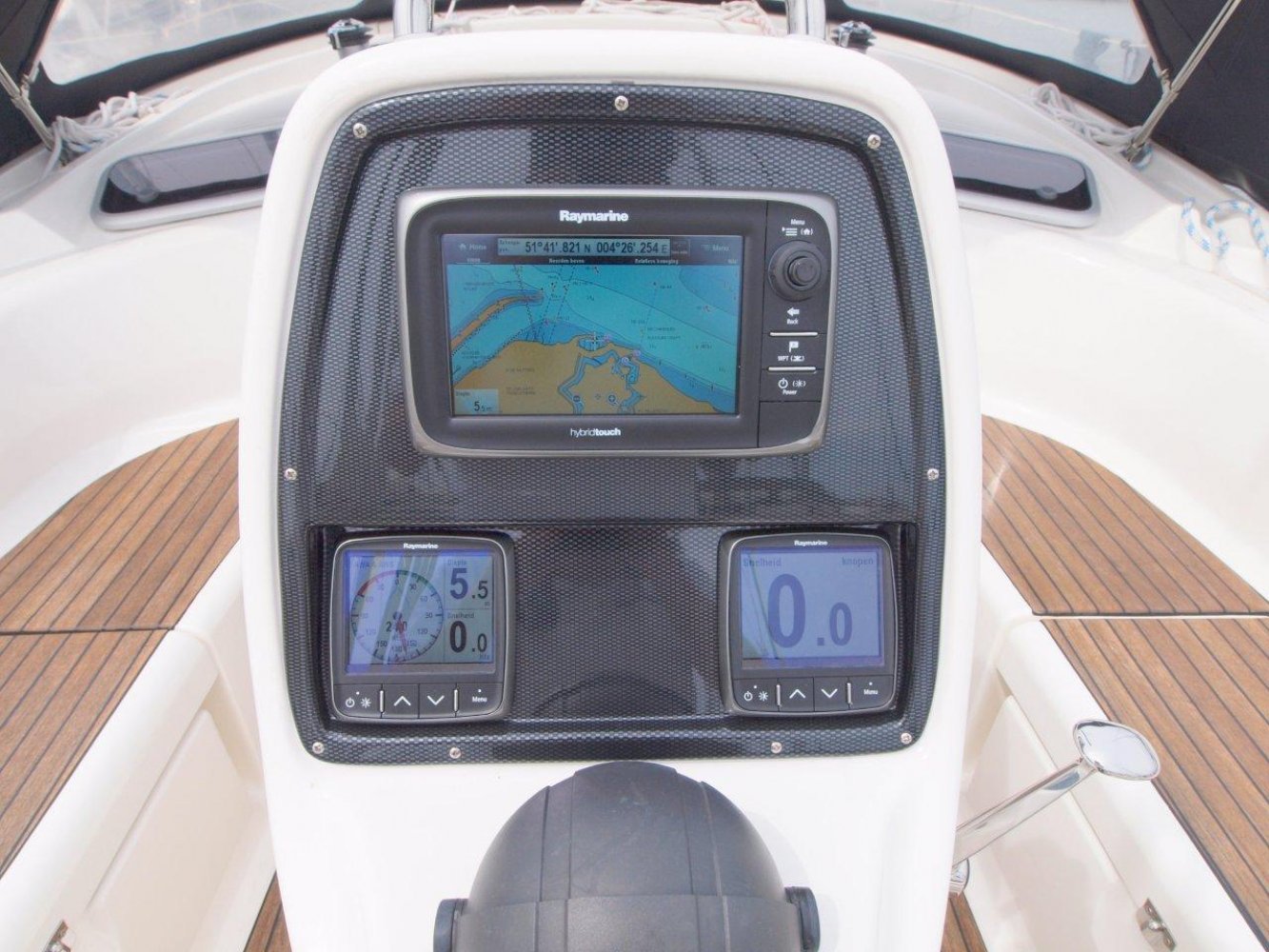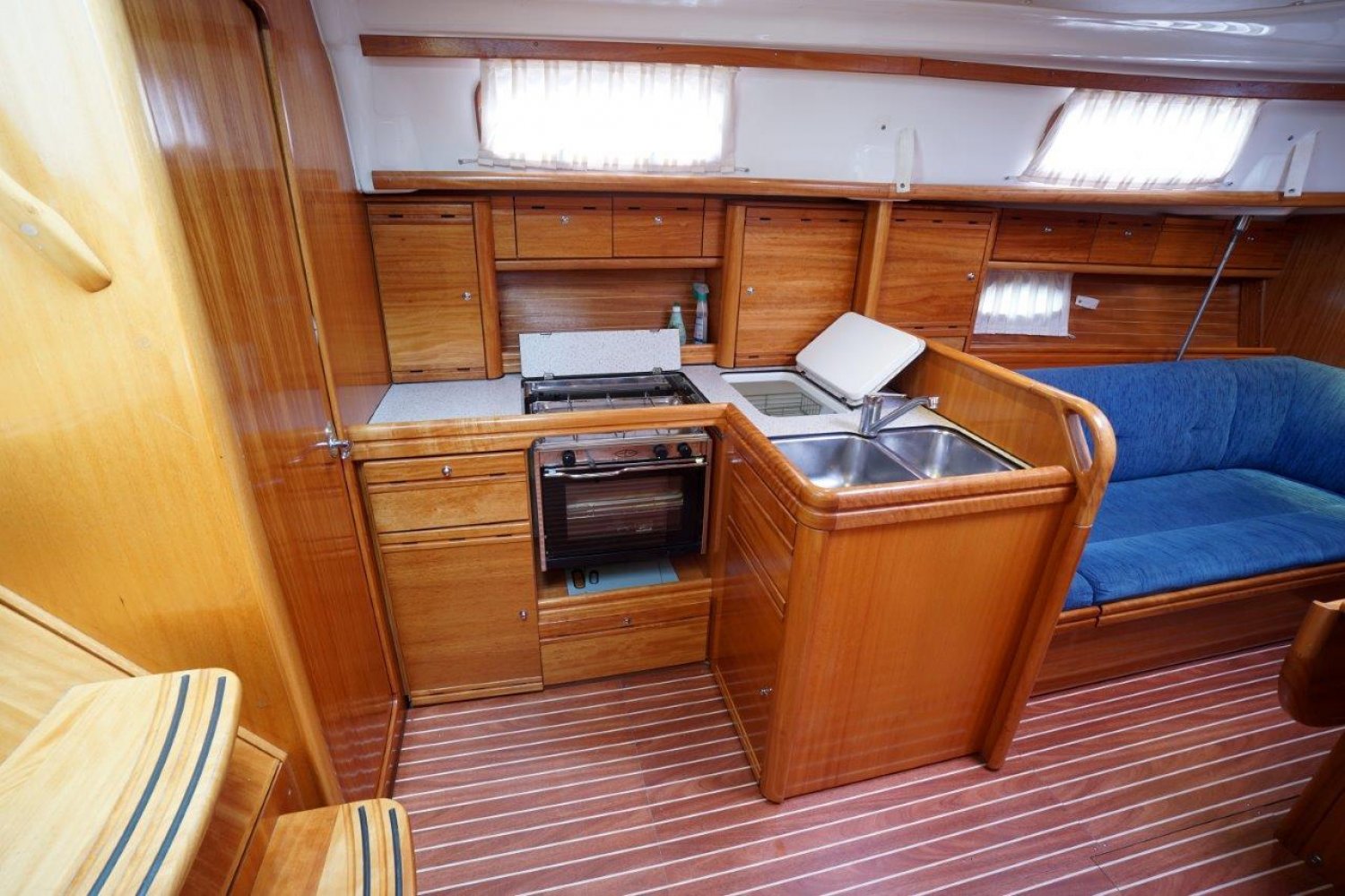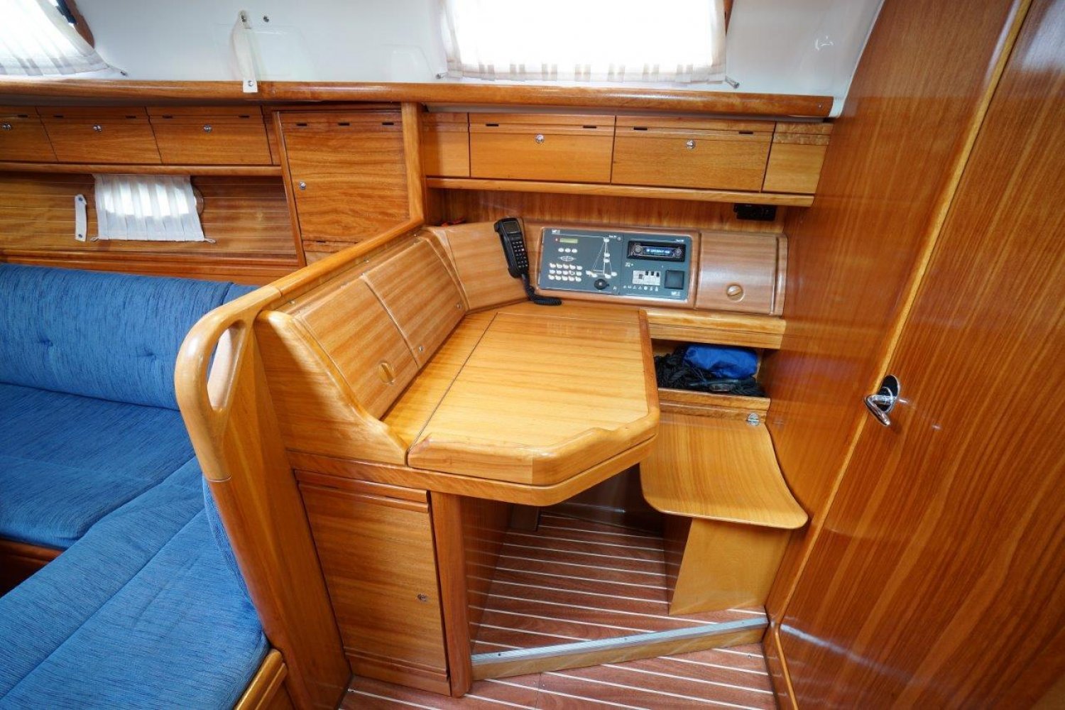 Binnen het schip valt direct de ruimte en lichte interieur op. Aan stuurboord is de kaarten tafel met nog veel extra inbouw ruimte voor extra apparatuur mocht u daar behoefte aan hebben. Hier tegenover is het praktische kombuis, uiteraard voorzien van warm water, gas fornuis met oven, flinke koelkast en veel opberg ruimte. Verder naar voren is de gezellige salon met aan bak- en stuurboord een comfortabele zitbank en een royale tafel in het midden. In de voorpiek is de ruime eigenaarshut en de natte cel. Deze is zowel vanuit de salon als vanuit de eigenaars hut toegankelijk. In het achterschip zijn de twee overige hutten. Deze worden gekenmerkt door de ruime dubbele bedden en veel opberg ruimte.