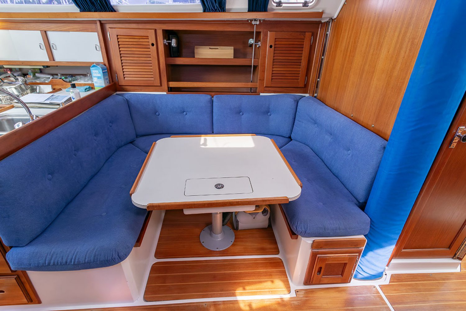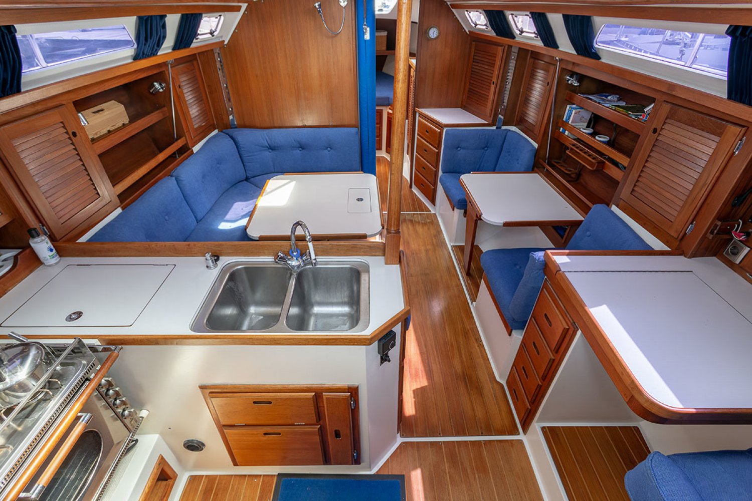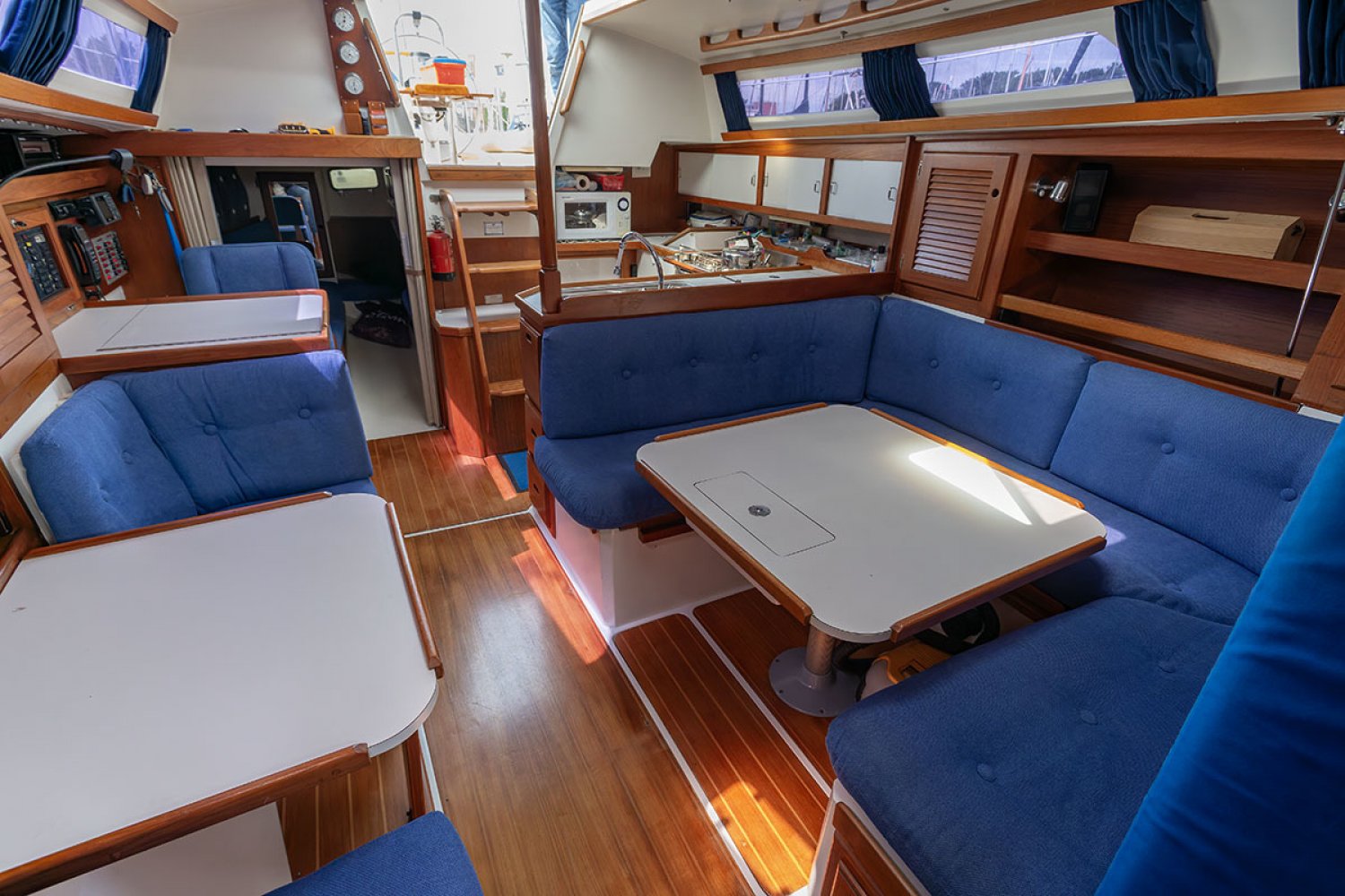 Het interieur is opvallend ruim. Bij binnenkomst is aan bakboord de kombuis met alle moderne gemakken waaronder magnetron. Aan stuurboord is de navigatiehoek. Midscheeps is een U-bank met er tegenover twee stoelen. Beide tafels zijn te verlagen en tot bed om te bouwen zodat er in totaal maar liefts 7 slaapplaatsen zijn te maken. Voor de mast is de natte cel met douche en toilet. Geheel in de boeg is een hut met V-bed. In het achterschip is een dubbele hut met zeer ruim bed. Deze ruimte kan met een vouwdeur worden afgesloten. De motor is recent uitgebreid onderhouden en heeft onder andere nieuwe motorsteunen en schroefas met lagers.