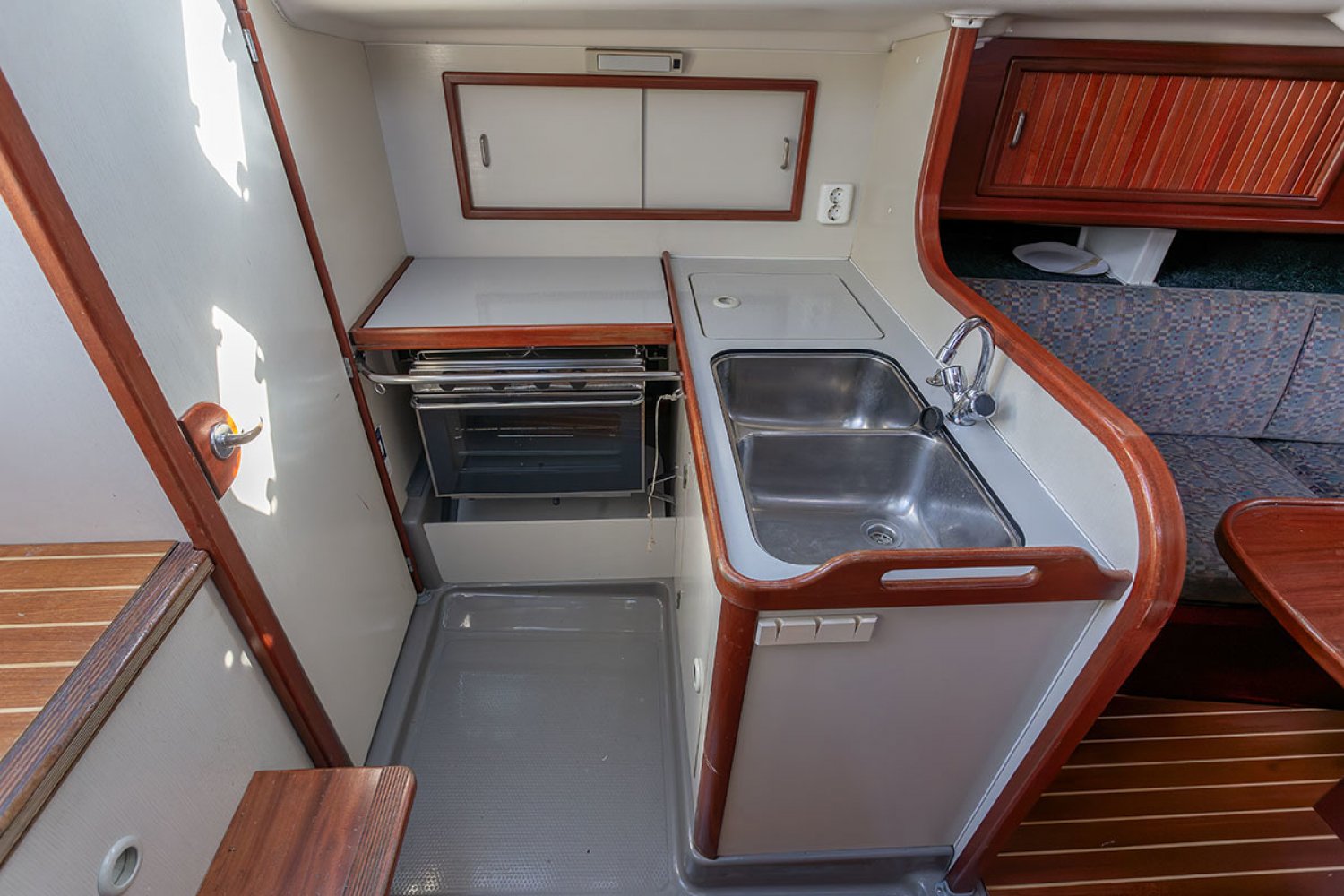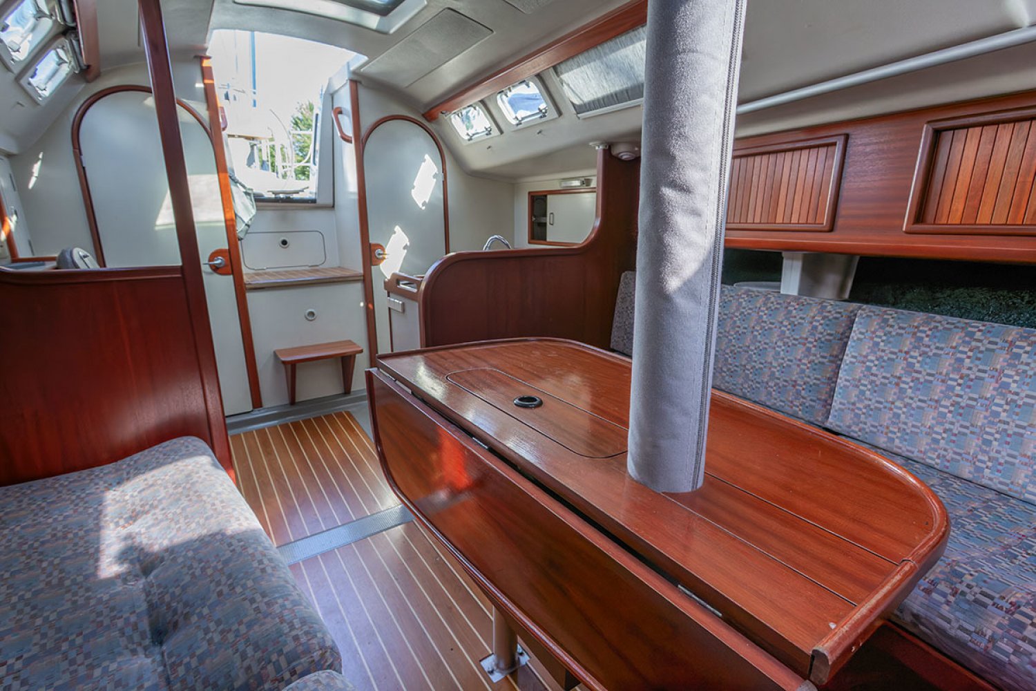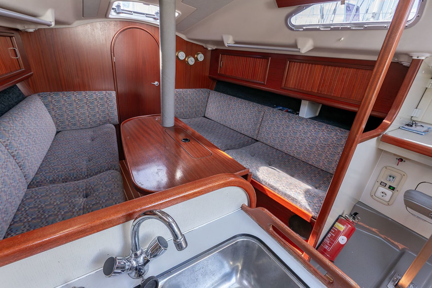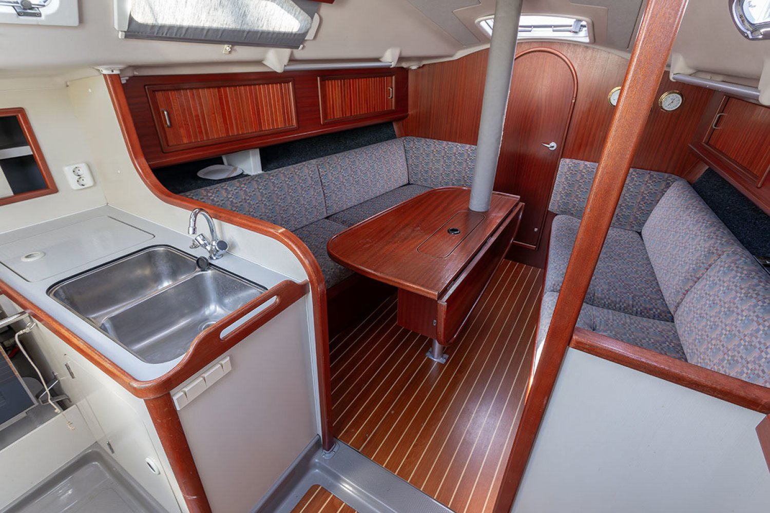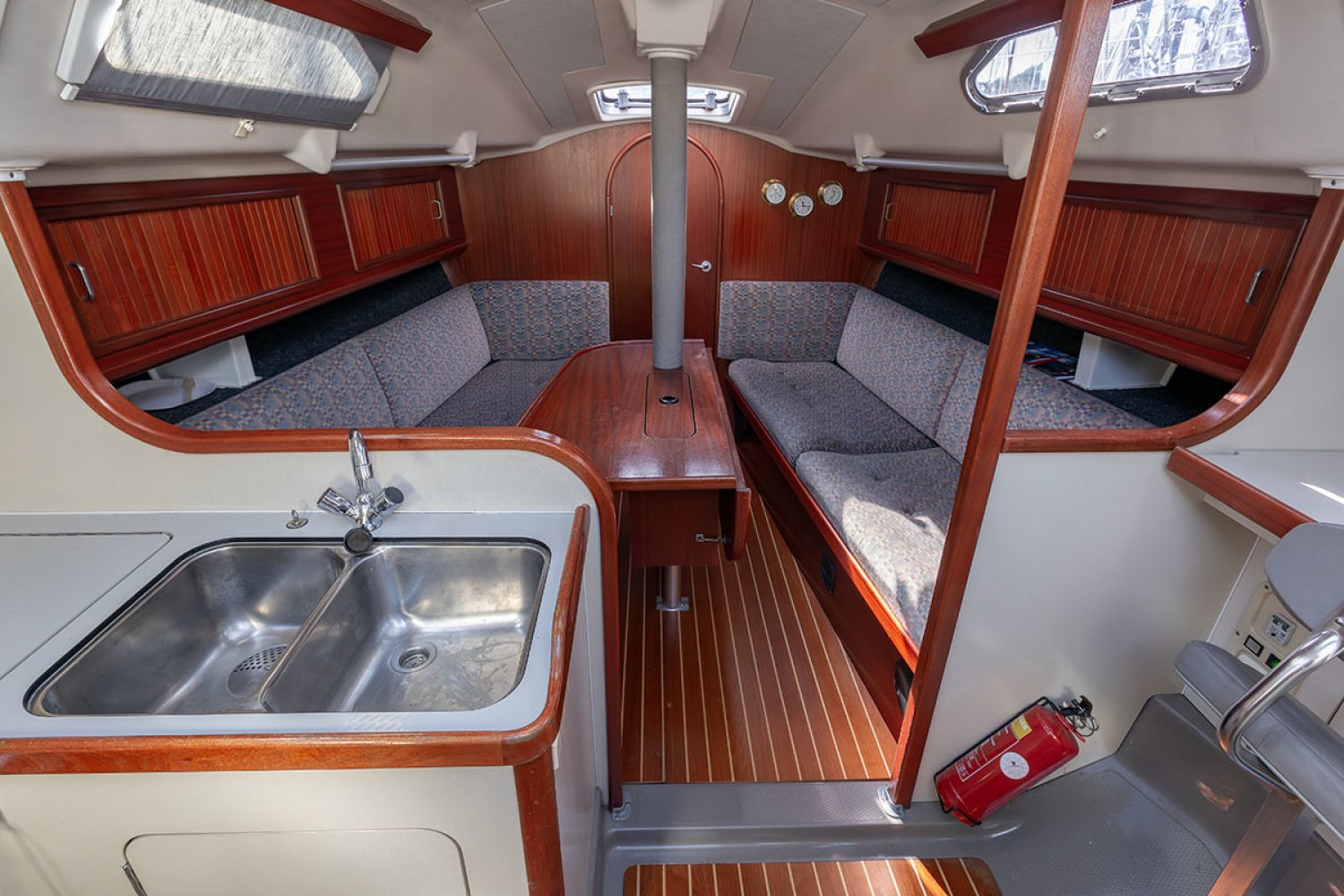 De salon is ruim, door gebruik van Mahonie hout oogt de salon knus en scheeps. Aan bakboord bevindt zich de keuken met kookstel, oven, koelkast en veel opbergruimte. Aan stuurboord is de kaartentafel, met in het achterschip de mooie en praktische natte cel. De salon heeft 2 langs banken die tevens dienst kunnen doen als extra kooien. Achter is een ruime tweepersoons hut. In het voorschip bevindt zich een tweede dubbele hut.