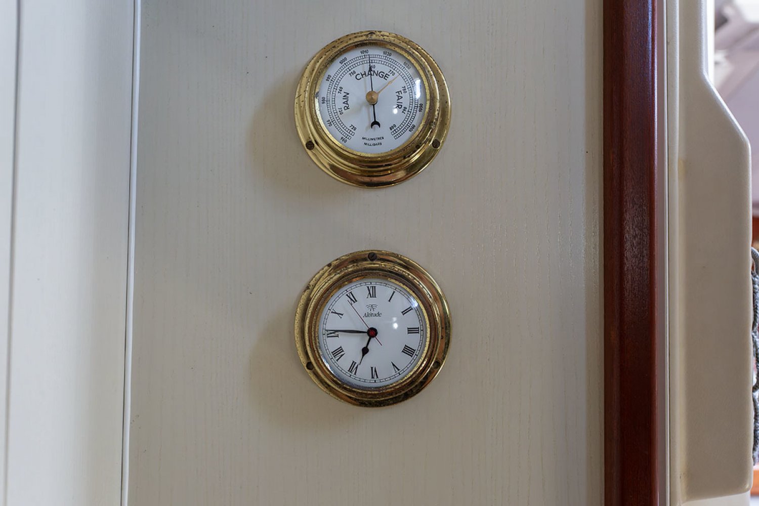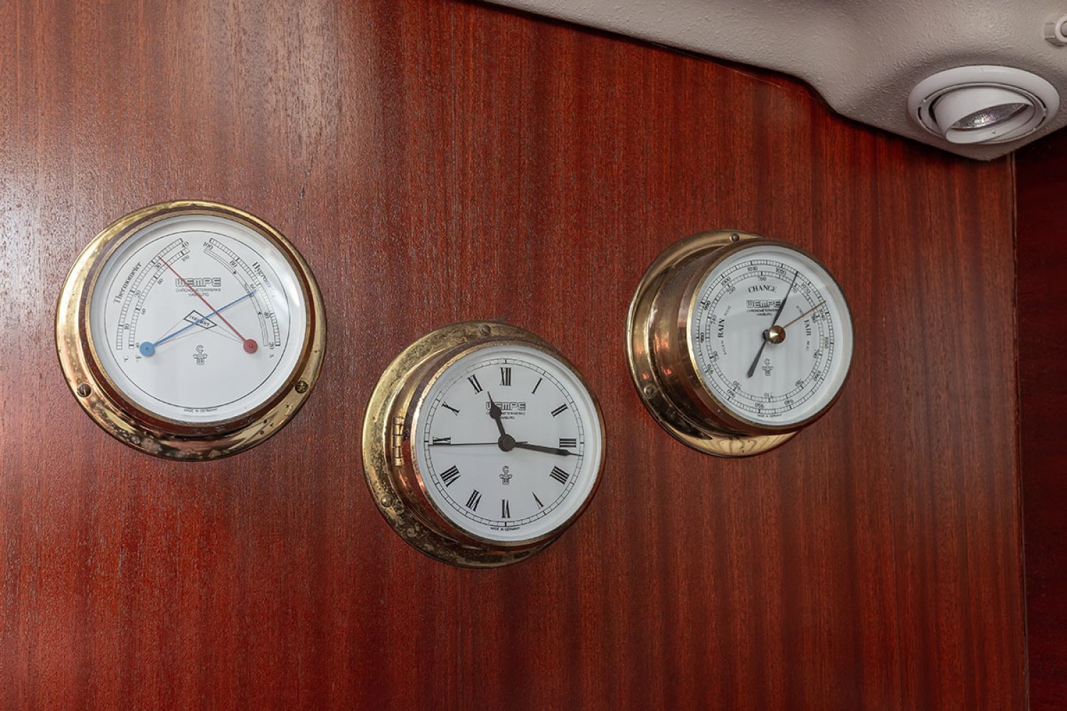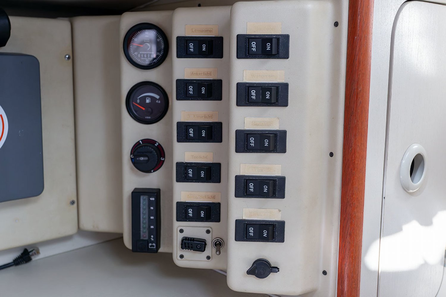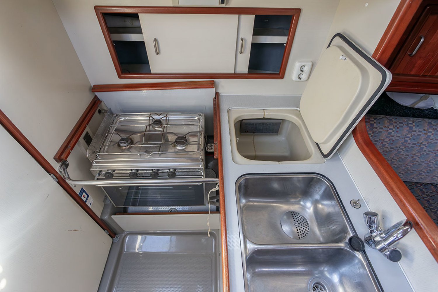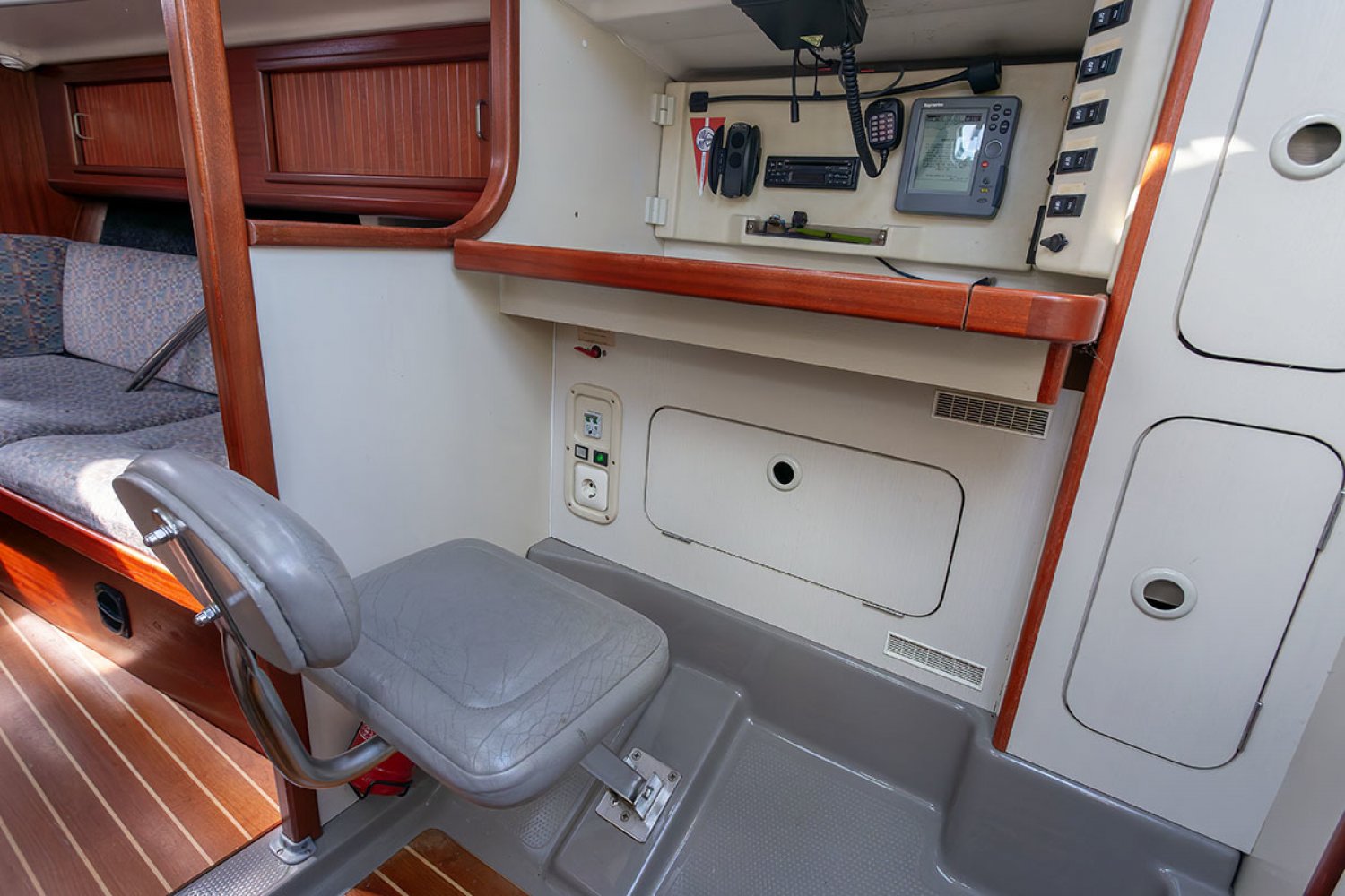 De salon is ruim, door gebruik van Mahonie hout oogt de salon knus en scheeps. Aan bakboord bevindt zich de keuken met kookstel, oven, koelkast en veel opbergruimte. Aan stuurboord is de kaartentafel, met in het achterschip de mooie en praktische natte cel. De salon heeft 2 langs banken die tevens dienst kunnen doen als extra kooien. Achter is een ruime tweepersoons hut. In het voorschip bevindt zich een tweede dubbele hut.