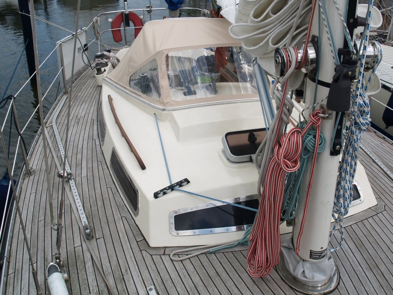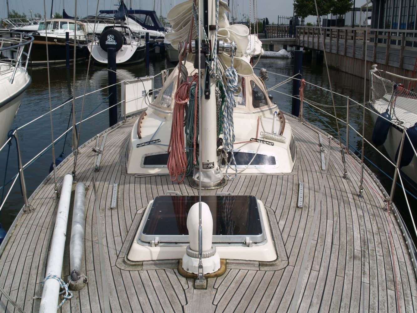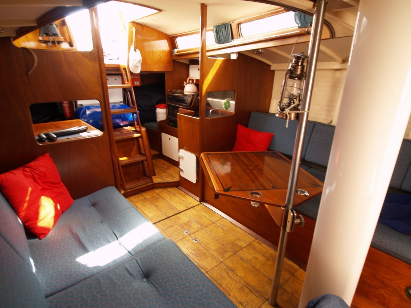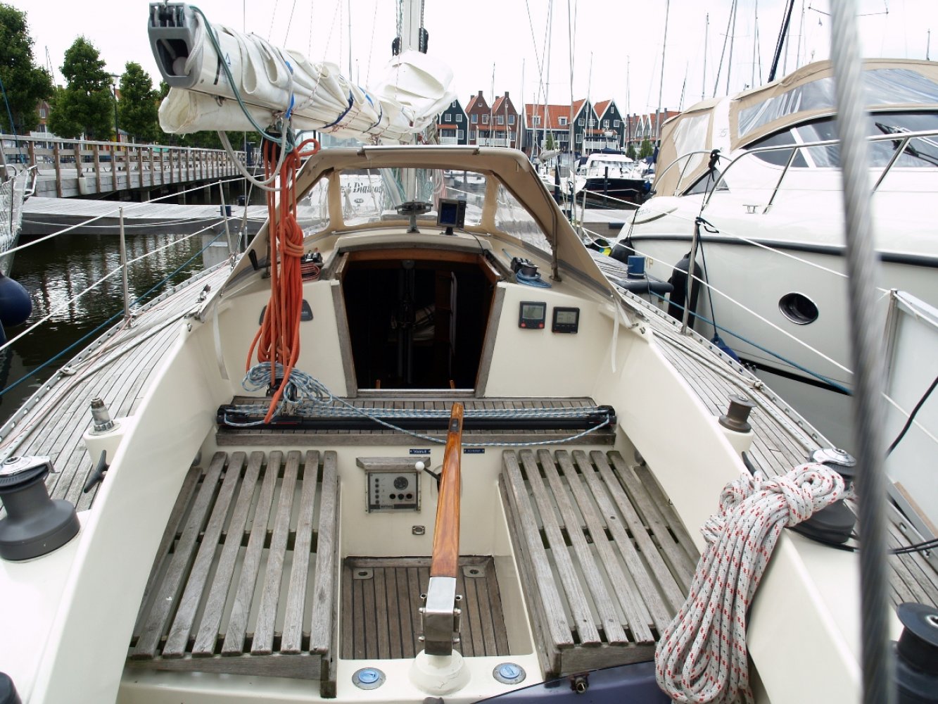 De Koopmans Polka Mazurka 36 die wij u aanbieden is gebouwd in 1974 bij Kesteloo in Terneuzen. Het is een snel en zeewaardig jacht en biedt gemakkelijk ruimte aan 4 tot 6 opvarenden. Deze charmante boot met prachtige lijn en opvallende ontwerp details is op veel essentiele punten verbeterd. Zo is in 2008 de complete tuigage, getekend door D. Koopmans jr. vervangen. Zeer smaakvol is de creme kleurstelling van opbouw en tuigage. De kuip is diep en biedt goede beschutting achter de nieuwe (2011) buiskap. Opvallend is dat de helmstok in het midden is geplaatst zodat de roerganger gemakkelijk alle lijnen en motorbediening onder handbereik heeft. Ook de instrumenten zijn eenvoudig afleesbaar. Zo kan de boot eenvoudig solo gevaren worden. Het dek is erg ruim en het teak is nog in goede staat al behoeft het voordek wat onderhoud. Het interieur heeft een open en ruim karakter omdat het vooronder niet is afgesloten met een schot en deur. Het timmerwerk is van fraai donker mahonie met lichte deuren in kast en bergruimte. In de boeg is een tweepersoons kooi, en in het achterschip zijn twee loodskooien. In de salon zijn op de banken nog twee slaapplaatsen. Er is een bescheiden maar complete kombuis aan bakboord, en aan stuurboord een navigatiehoek met de nodige apparatuur. De betrouwbare Vetus motor is in een kist onder de trap gebouwd. Deze Koopmans Polka Mazurka 36 is een jacht wat zeer geschikt is voor tochten op open zee als ook een clubwedstrijd. Na alle verbeteringen die de laatste paar jaren zijn aangebracht is zij geheel vaarklaar. Bent u geinteresseerd? Maakt u een afspraak voor een bezichtiging in Volendam. Uw jachtmakelaar is Robert de Vries +31(0)6 50201336