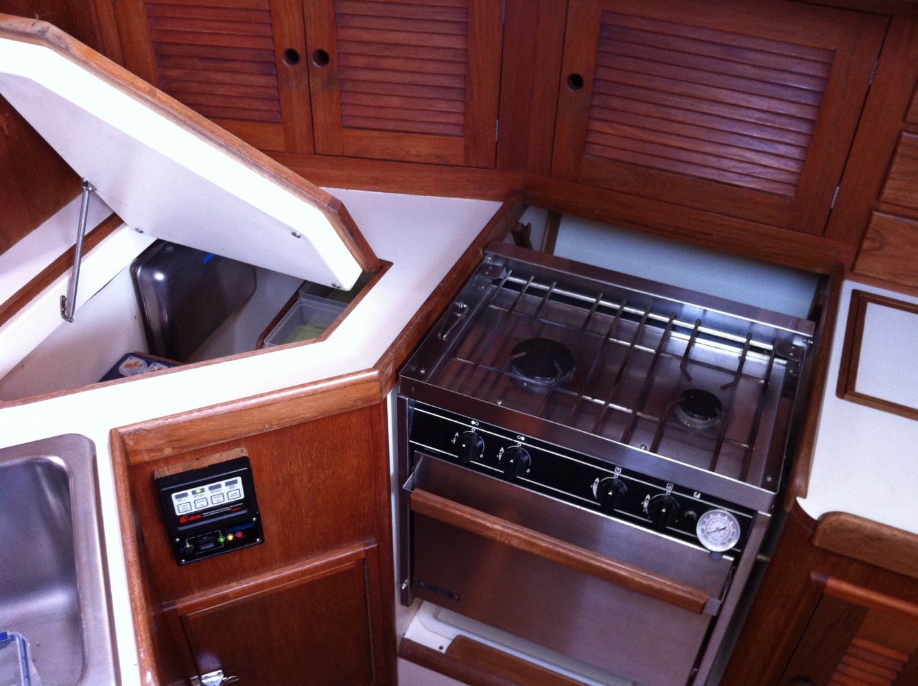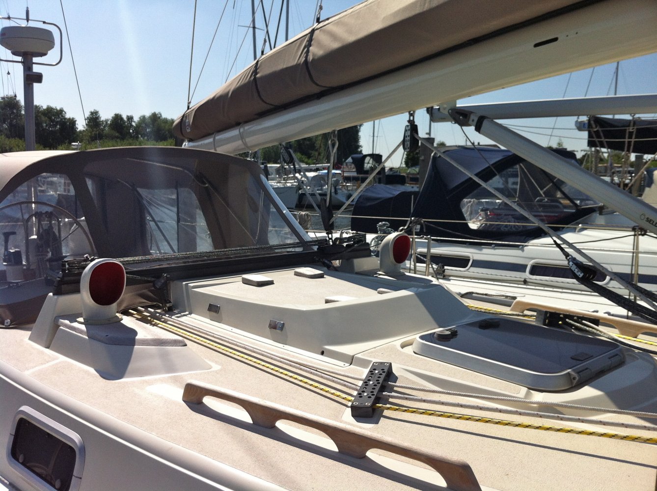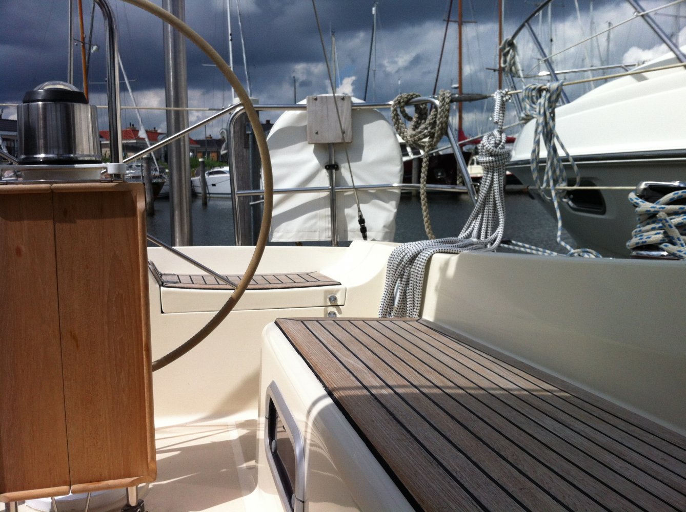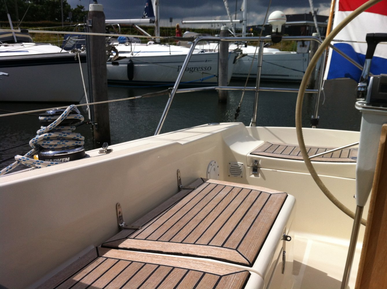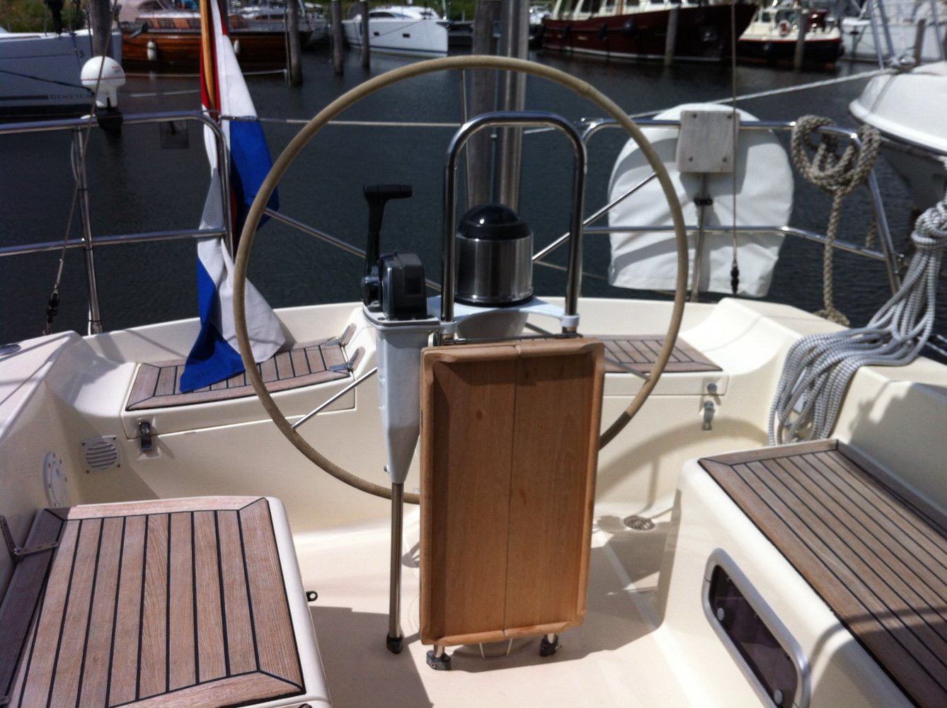 • bovenbouw en dek anti-slip op het dek, • teak op de kuipbanken, • Lewmar ramen in aluminium frame, • brandstoftank: ca.. 95 liter (RVS), • zoet water tanks: 1 x 125 en 1 x 150 liter (1x alu/1x GRP), • vuilwatertank: 1x 60 liter (GRP + mercator versnijder), • stuurwiel met suede bekleed ‘13, • Richie kompas hoes, • noodhelmstok, • bilgepomp elektrisch en handmatig, • Modern teak interieur, nieuwe memoryfoam matrassen ’11, • alle verlichtingsarmaturen chroom/rvs ’13, • Ocean plise gordijntjes ’13, • salon + twee hutten, 4 (+2) slaapplaatsen, • ruime natte cel met handbediend toilet en een douche, • Webasto hete lucht verwarming (revisie ’13), • warm water via boiler (draait op motor/220V), • accumulator (vervangen in 2013), • kombuis met spoelbak, • koelkast, • twee-pits gasfornuis met oven en grill, • gasbun voor twee gasflessen (1 meegeleverd), • elektrische gasdetector ’11, • Jabsco Toilet, • douche (warm water), • accu’s ’13, • schroefas + lager ’13, • 3 blads klapschroef (Fex-O-Fold), • Volvoseal ’13, • Aluminium Offshorespars doorgestoken mast, • beslag RVS, • 1x Harken rolsysteem, • doorgelat grootzeil (Gaastra ‘13), • High Aspect (Gaastra ‘13), • Genua 1 (Hagoort), • werkfok (Hagoort), • lazyjack, buiskap, • achtertent winter(kuip) tent (allround zeilmakers ‘13), • Selden neerhouder, • Harken lieren: 2x 44.2 ST - twee snelheden + 2x 32 + , • Harken overloop, • lopend want in ’13 vervangen voor Dynema, • 2 luchthappers op dek, • teakhouten potdeksel/voetrail, • teakhouten handsvaten en dekafvoer (geen zwarte strepen meer op de romp), • Radar/Kaartplotter RC70 Raymarine met kaart ’13, • Marifoon, • Mastervolt acculader en monitor, • omvormer 12/230v, • brandstofmeter, • watermeter, • GPS Autohelm, • Navtex Renaud, • diepte-, snelheid-, windmeter en multi ST50 Autohelm, • stuurautomaat (op kwadrant) ST6000 Autohelm. • inclusief komaliwant (serviesgoed), • lifelines, • reddingsvlot, • landvasten, • stootwillen, • Bruce 15kg anker/ankerketting en loodlijn, • neuringlijn, • ankerbol, • motorkegel, • bootsmansstoel, • muggen horren tbv Lewmar ramen, • losse kussens voor in de kuip • Reeds 2013, • Diverse manuals, • Foto’s tijdens de bouw, • Diverse facturen (voor zover beschikbaar), • Douane verklaring dat BTW voldaan is.