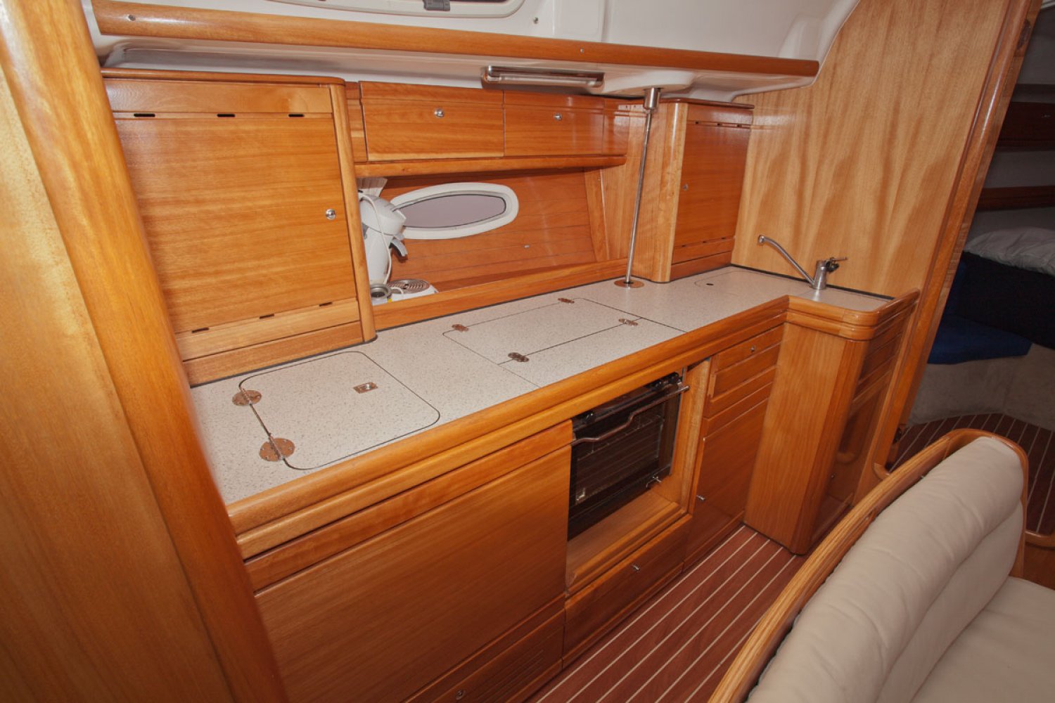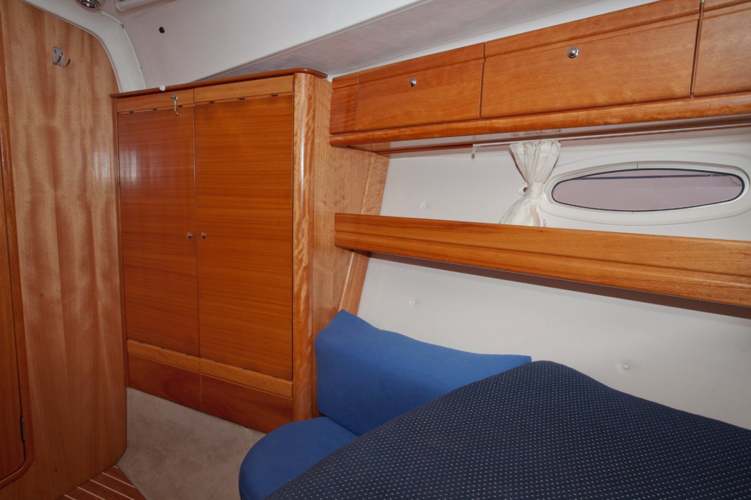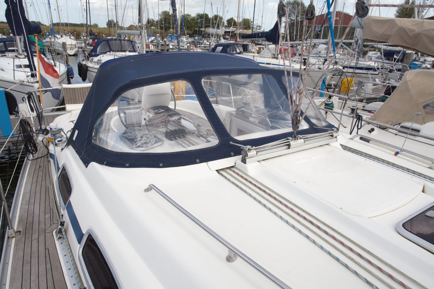 De Bavaria 39 cruiser die wij namens de eerste particuliere eigenaar mogen aanbieden verkeert in goede staat van onderhoud. Het in Nederland gelegde teak dek ziet er prima uit. De boot is uitgerust met 55 pk motor welke in 2010 is gereviseerd door de Volvo dealer. Zij heeft een 3 hutten uitvoering en is geheel vaarklaar. De kuip is bijzonder ruim en dankzij de buiskap zit men goed beschut. Niet alleen het motorvaren is simpel, ook het zeilen is kinderspel dankzij rolsystemen voor zowel grootzeil als genua. Voor ruime koersen is er een gennaker. Dit alles is vanuit de kuip te bedienen. Zoals van Bavaria bekend is het interieur bijzonder ruim en praktisch van opzet. In de midscheeps is een gezellige zit met één vrijstaande en één U-vormige sofa, bekleed met in 2014 vernieuwde creme kleurige skai. Aan bakboord is een langs keuken geplaatst met dubbele spoelbak, oven en koelbox. Er is veel kastruimte voor het opbergen van proviand. Links van de keuken is een grote natte cel met toilet, spoelbak en douche. Aan stuurboord is de navigatie hoek met schakelpaneel en onder andere de thermostaat voor de Webasto verwarming. In de boeg is de eigenaarshut met en-suite badkamer. In het achterschip zijn twee dubbele hutten zodat de boot gemakkelijk plaats biedt aan 6 personen en eventueel 2 extra. De motor kan voor service bereikt worden via het omhoog scharnierende trapluik en de wegneembare zijpanelen. Deze Bavaria 39 biedt veel comfort en uitrusting en is geheel vaarklaar. We willen u dan ook van harte uitnodigen voor een bezichtiging in Andijk (NL). Maakt u een afspraak via [email protected] Uw jachtmakelaar is Robert de Vries +31 (0)6 50201336.