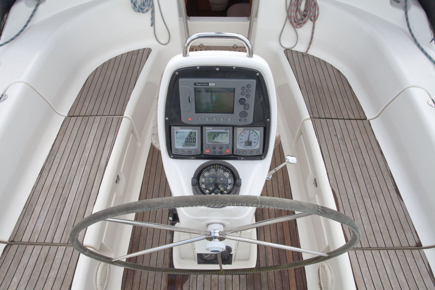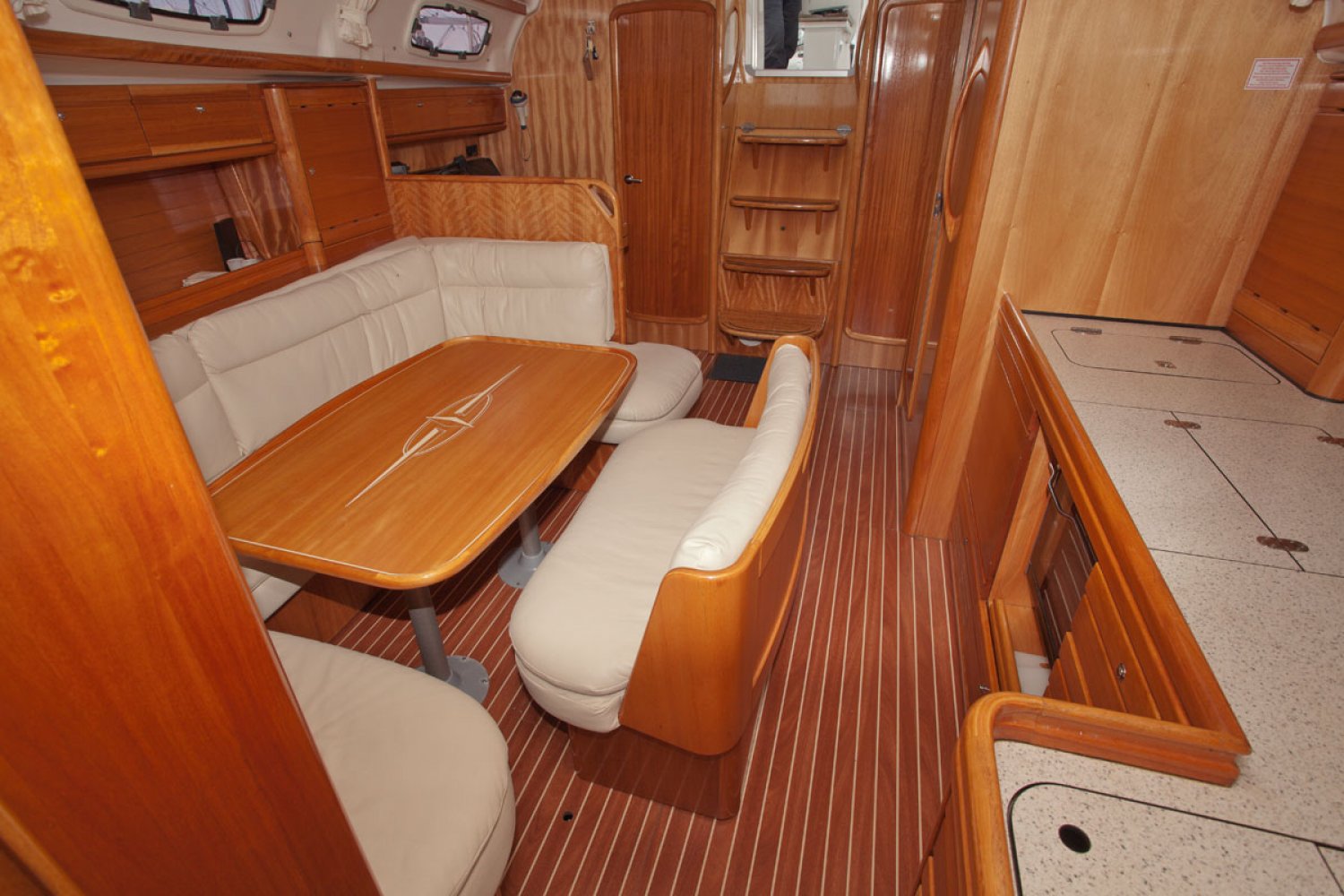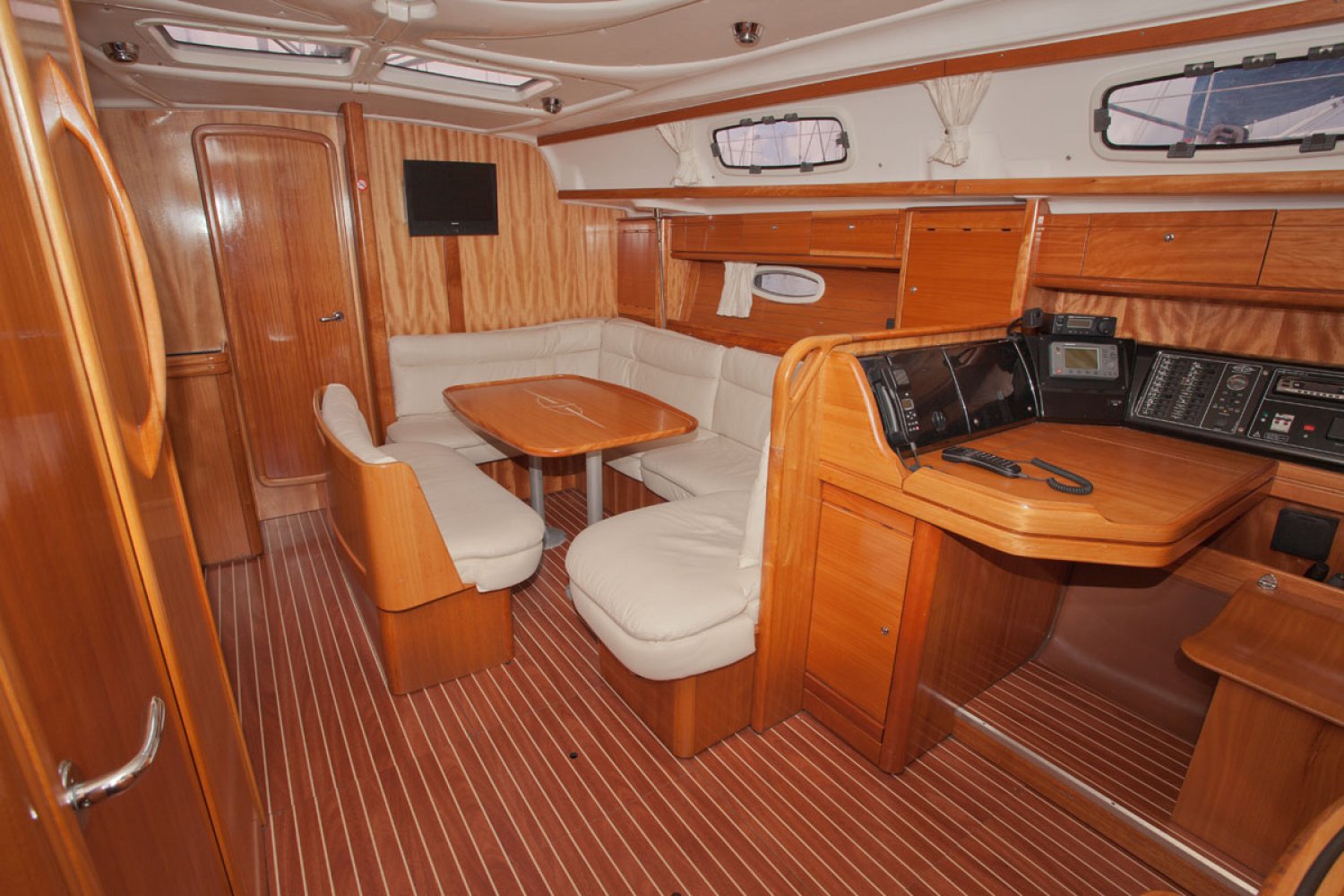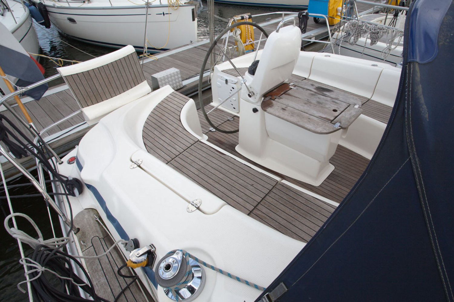 De Bavaria 39 cruiser die wij namens de eerste particuliere eigenaar mogen aanbieden verkeert in goede staat van onderhoud. Het in Nederland gelegde teak dek ziet er prima uit. De boot is uitgerust met 55 pk motor welke in 2010 is gereviseerd door de Volvo dealer. Zij heeft een 3 hutten uitvoering en is geheel vaarklaar. De kuip is bijzonder ruim en dankzij de buiskap zit men goed beschut. Niet alleen het motorvaren is simpel, ook het zeilen is kinderspel dankzij rolsystemen voor zowel grootzeil als genua. Voor ruime koersen is er een gennaker. Dit alles is vanuit de kuip te bedienen. Zoals van Bavaria bekend is het interieur bijzonder ruim en praktisch van opzet. In de midscheeps is een gezellige zit met één vrijstaande en één U-vormige sofa, bekleed met in 2014 vernieuwde creme kleurige skai. Aan bakboord is een langs keuken geplaatst met dubbele spoelbak, oven en koelbox. Er is veel kastruimte voor het opbergen van proviand. Links van de keuken is een grote natte cel met toilet, spoelbak en douche. Aan stuurboord is de navigatie hoek met schakelpaneel en onder andere de thermostaat voor de Webasto verwarming. In de boeg is de eigenaarshut met en-suite badkamer. In het achterschip zijn twee dubbele hutten zodat de boot gemakkelijk plaats biedt aan 6 personen en eventueel 2 extra. De motor kan voor service bereikt worden via het omhoog scharnierende trapluik en de wegneembare zijpanelen. Deze Bavaria 39 biedt veel comfort en uitrusting en is geheel vaarklaar. We willen u dan ook van harte uitnodigen voor een bezichtiging in Andijk (NL). Maakt u een afspraak via [email protected] Uw jachtmakelaar is Robert de Vries +31 (0)6 50201336.