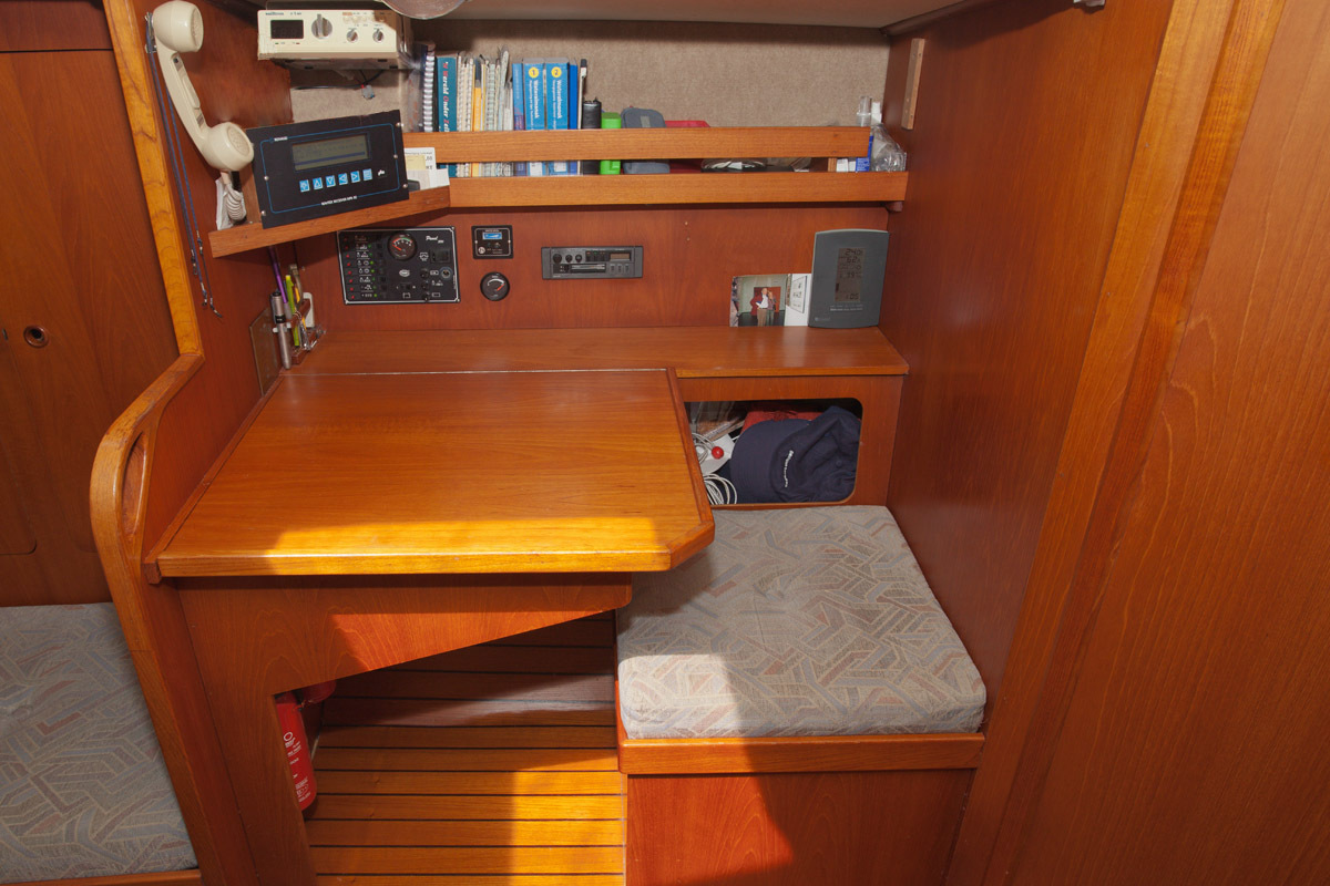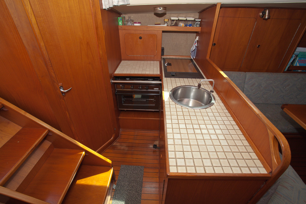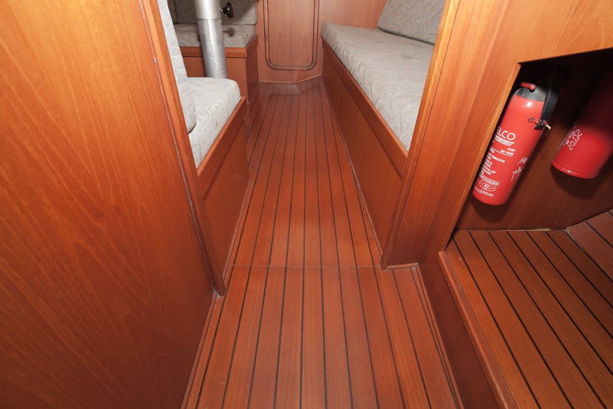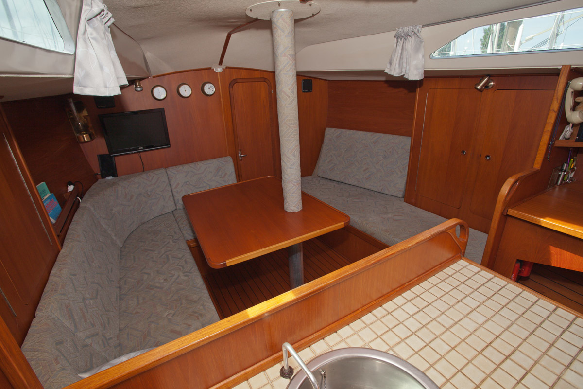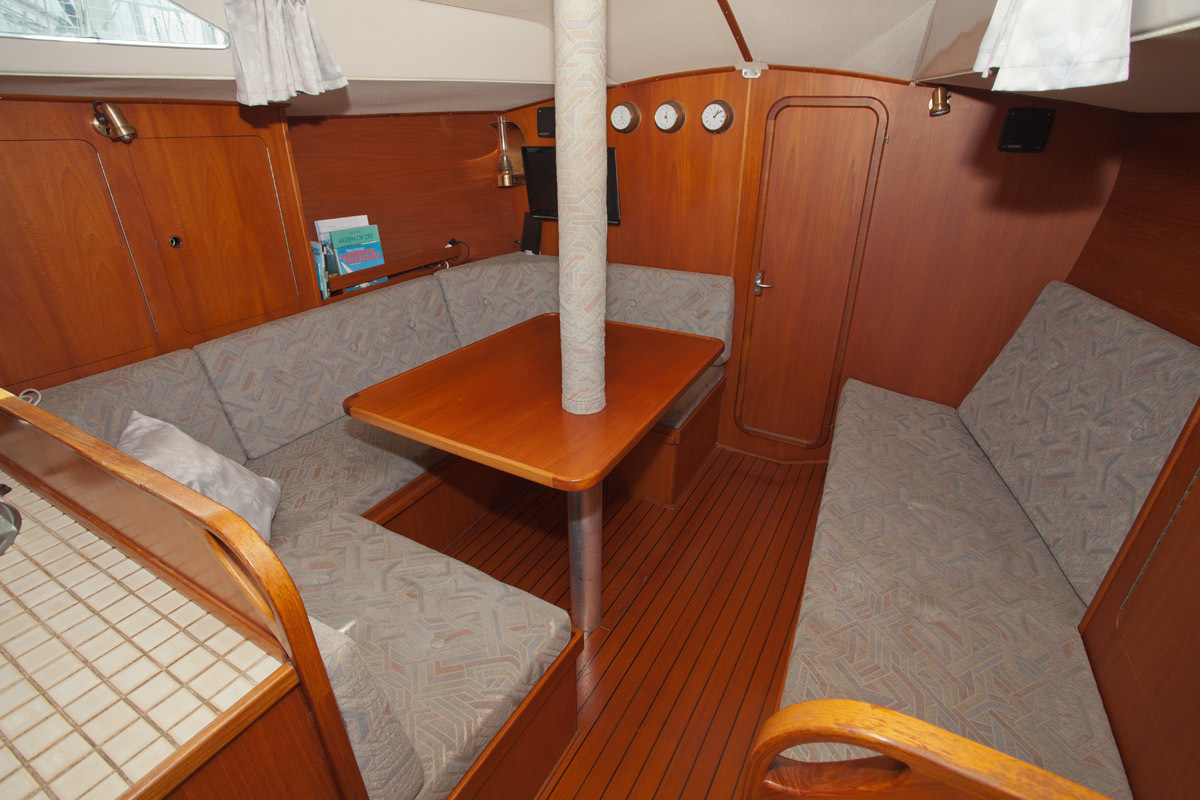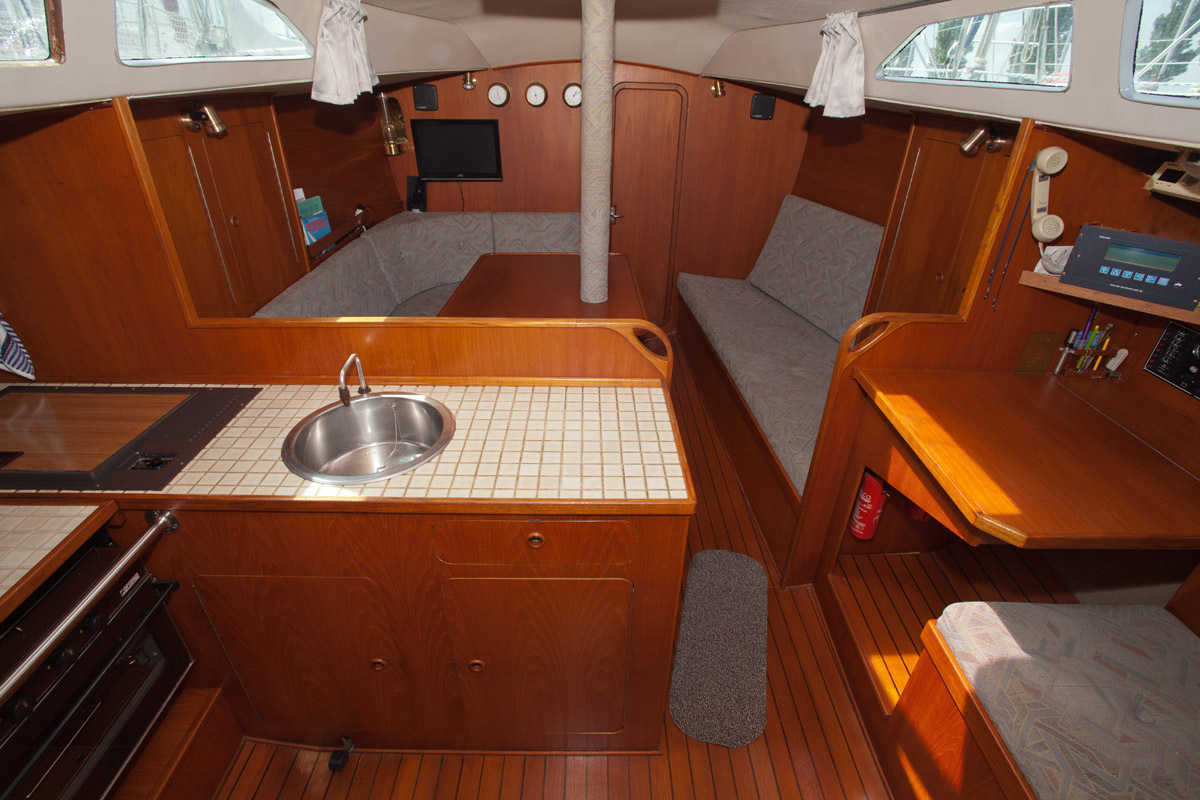 De salon is ruim van opzet met U-vormige bank links en langs bank rechts. Aan bakboord is de kombuis en de gesloten achterhut. Aan stuurboord is de navigatie hoek en het toilet met hangkast voor zeilkleding. In de boeg is de tweede hut met een groot dubbel bed.