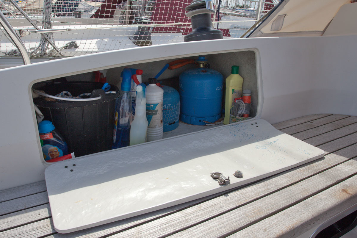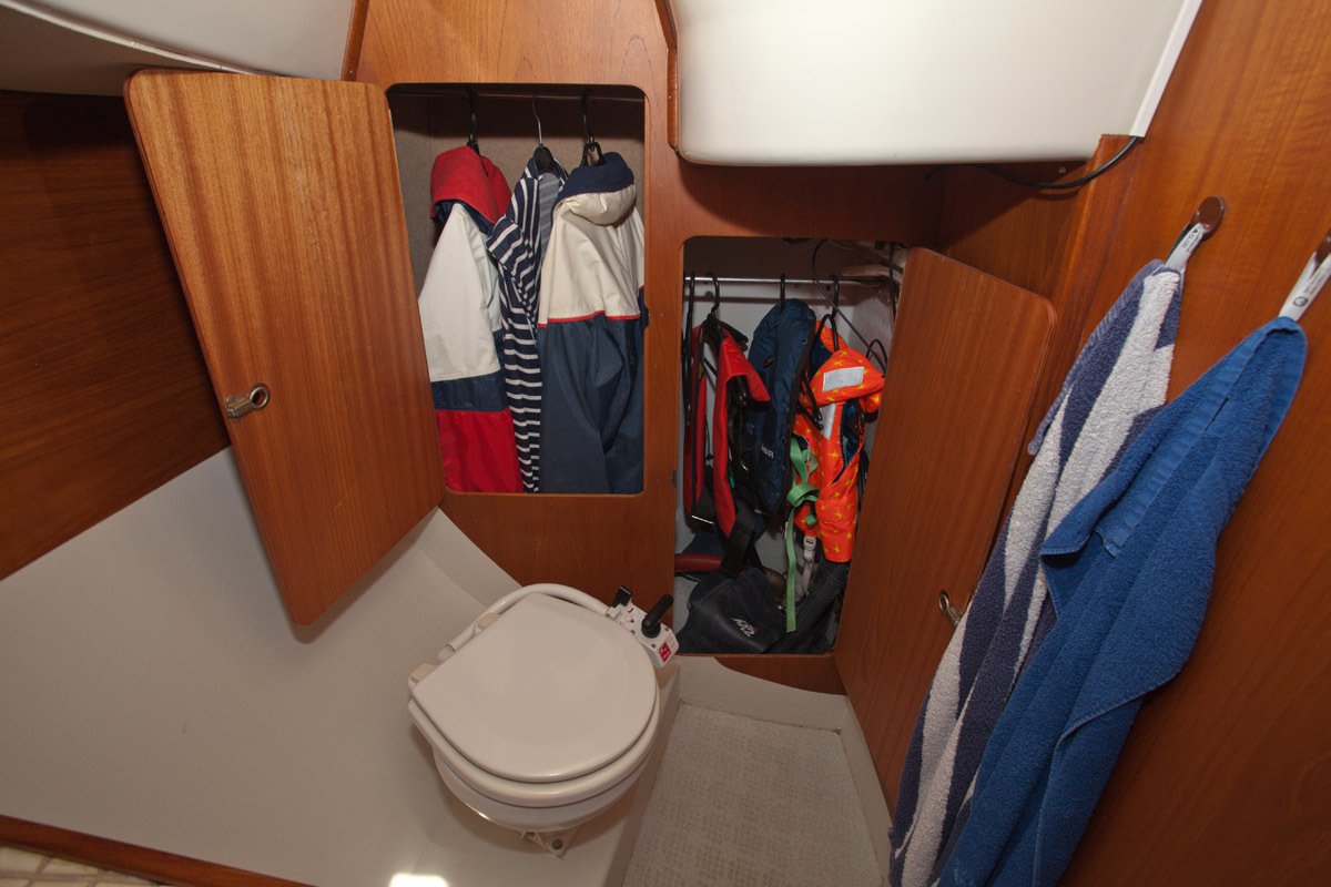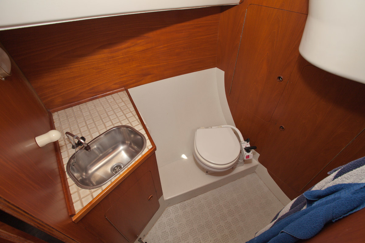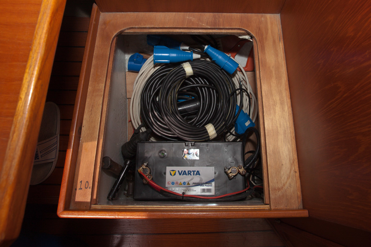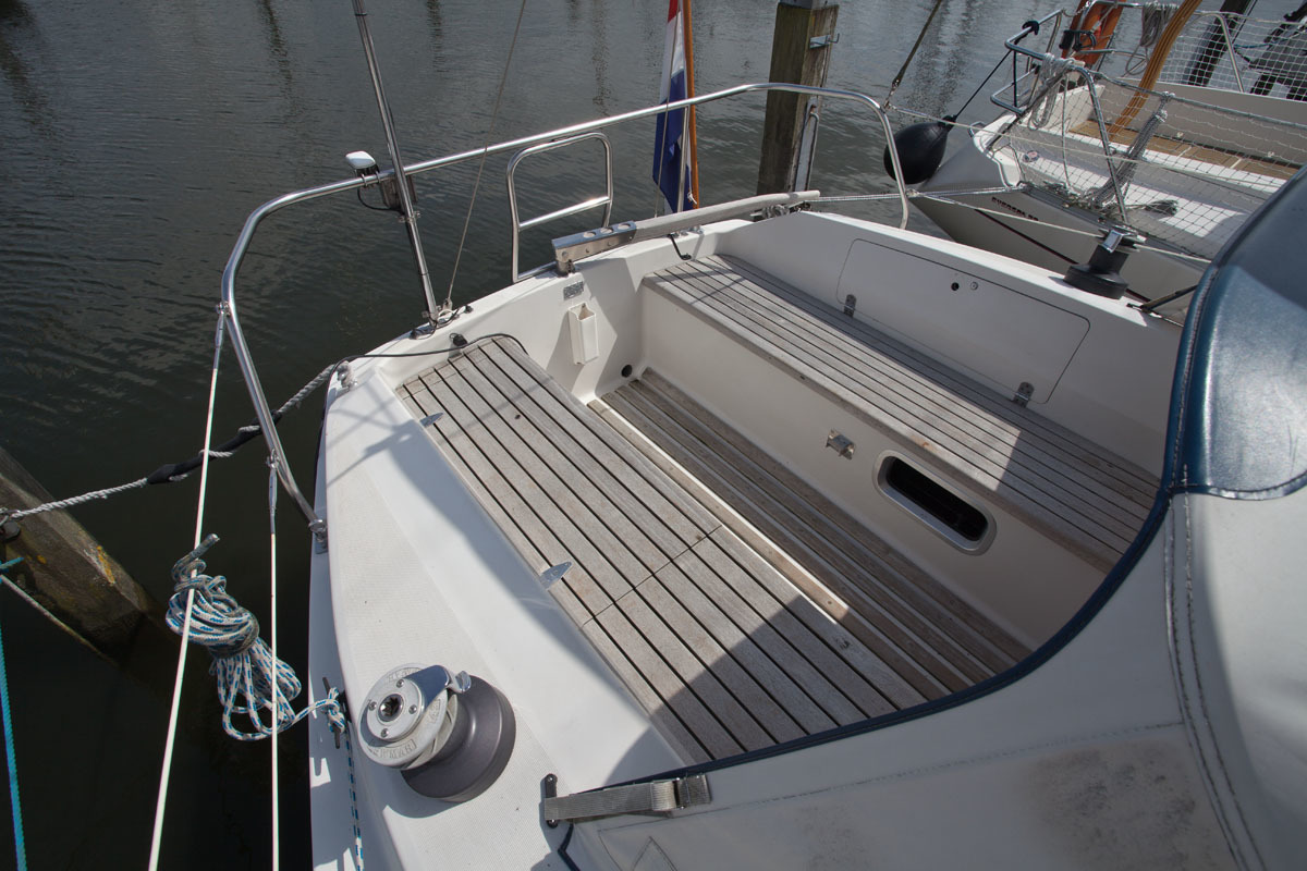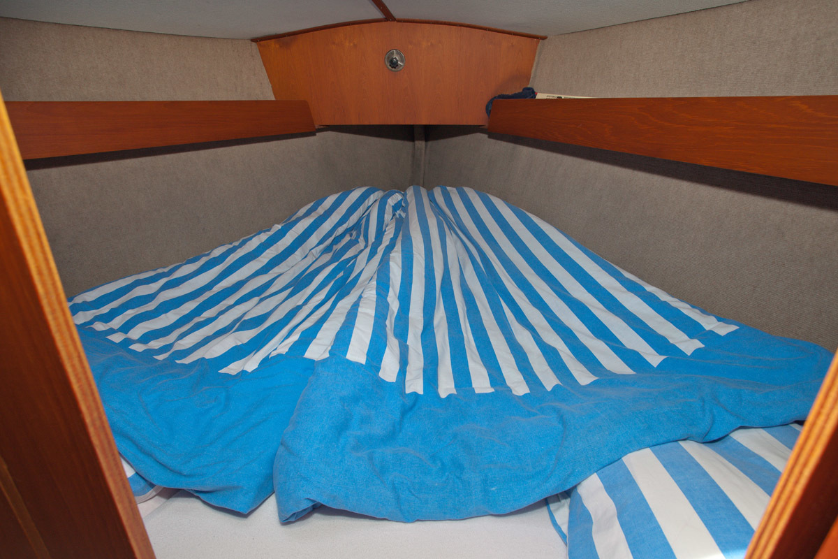 De salon is ruim van opzet met U-vormige bank links en langs bank rechts. Aan bakboord is de kombuis en de gesloten achterhut. Aan stuurboord is de navigatie hoek en het toilet met hangkast voor zeilkleding. In de boeg is de tweede hut met een groot dubbel bed.
