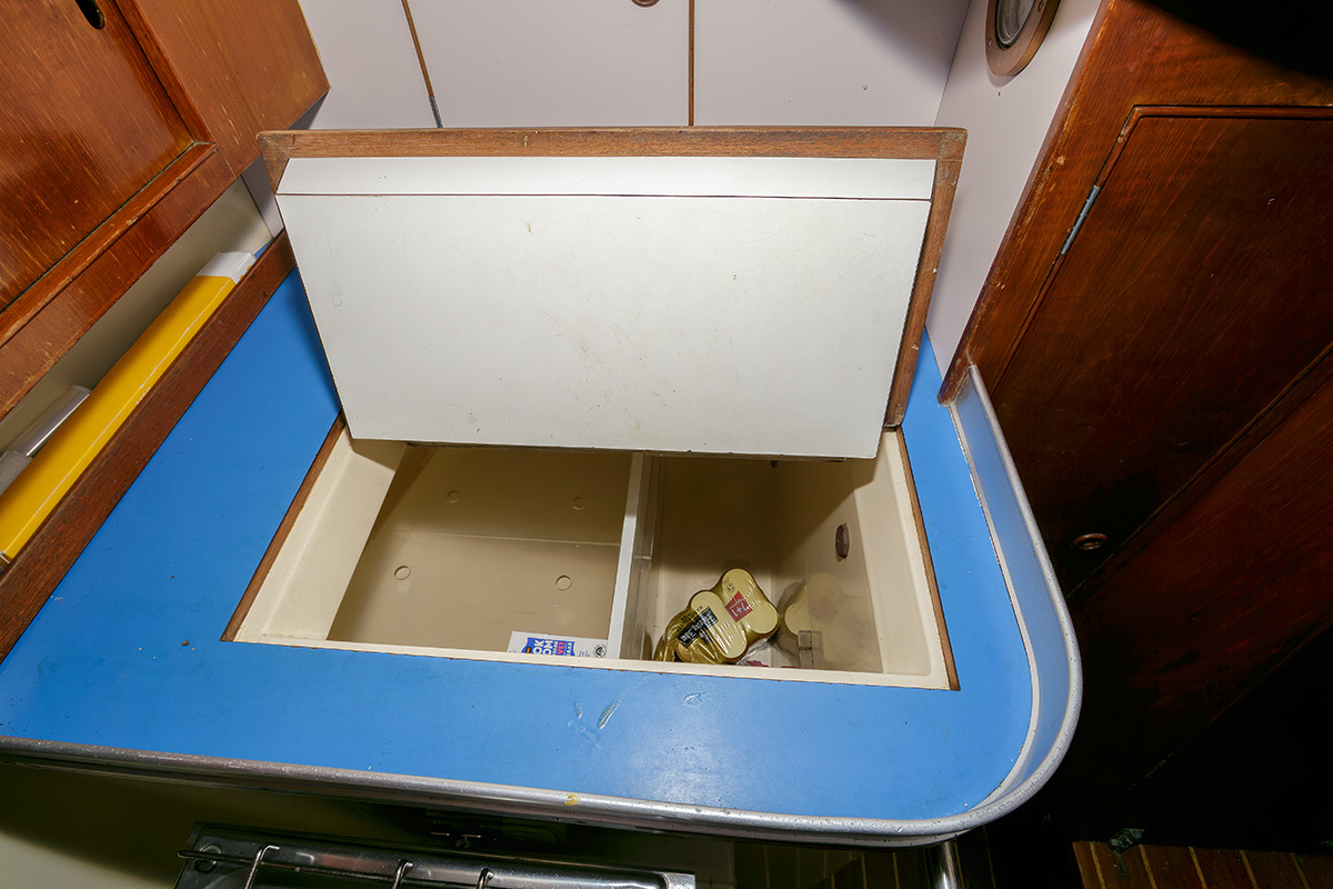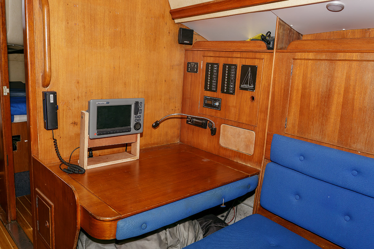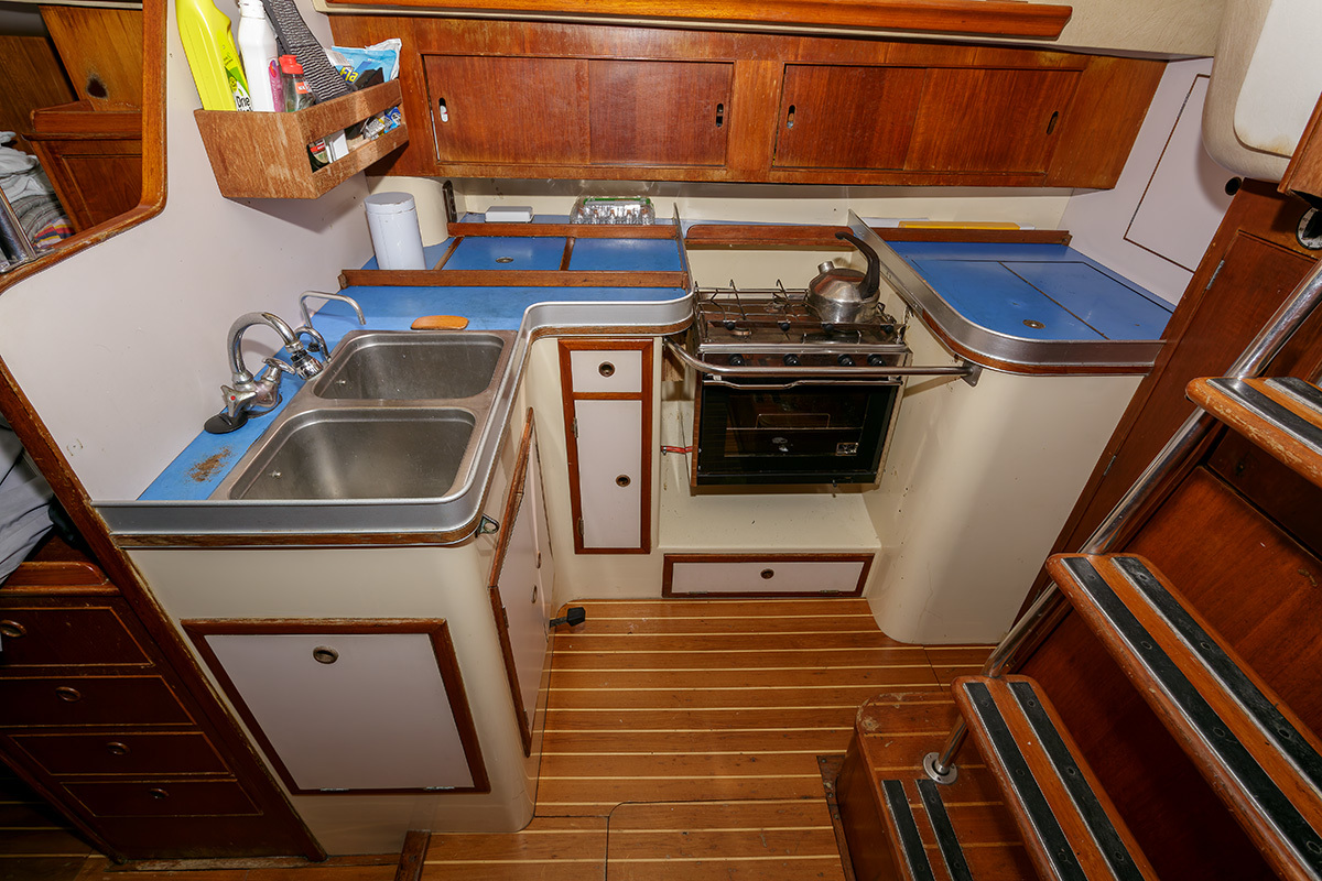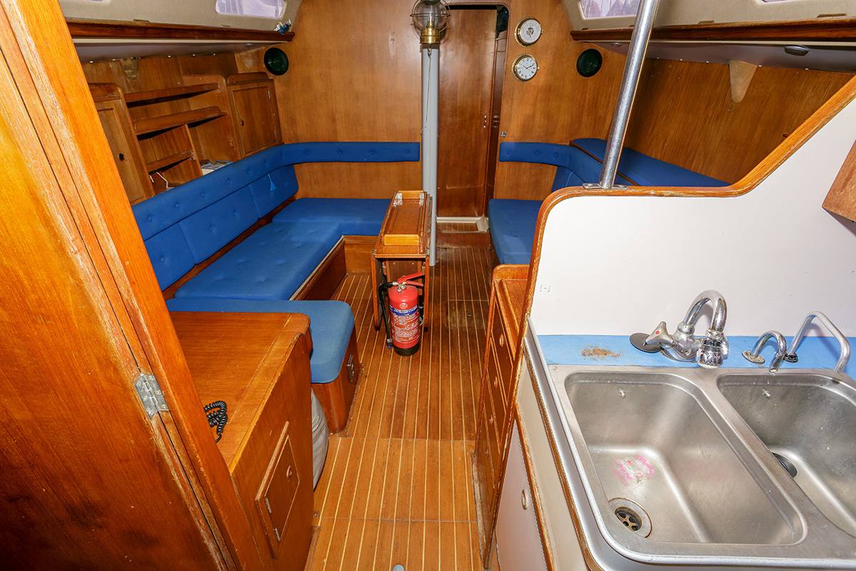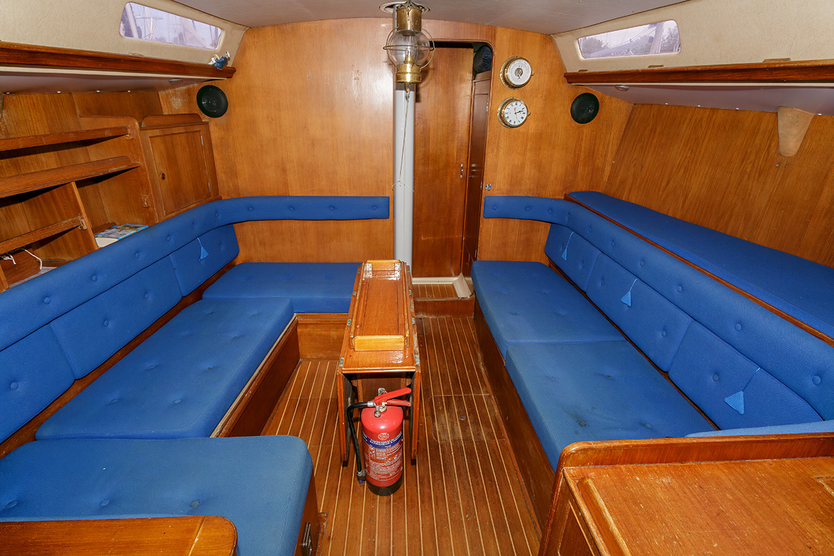 Bij binnenkomst is aan stuurboord de kombuis met koeling, 3 pits fornuis en aanrecht met spoelbak. Verder naar voren is midscheeps de zithoek die tevens dienst kan doen als slaapbank. Ook in de buik van het schip is een slaapplek. Voor de doorgestoken mast is de natte cel met apart toilet en wastafel. Geheel in de boeg is een dubbele kooi met V-bed  De "Raffles" staat 's winters op de wal gestald. Voor wie een fraai jacht met klassieke lijnen zoekt, dan is de Camper & Nicholson's  AC 40 een geschikte keuze. De boot is vaarklaar voor de nieuwe eigenaar.