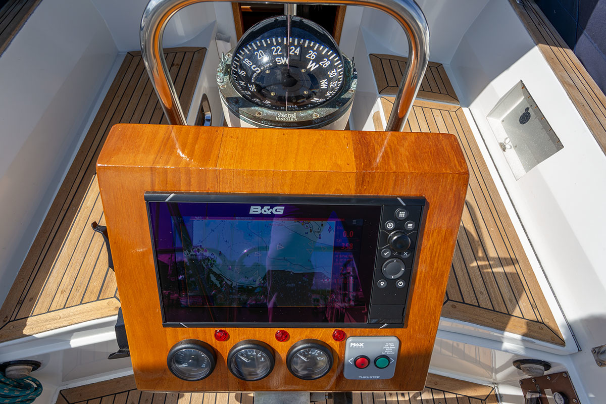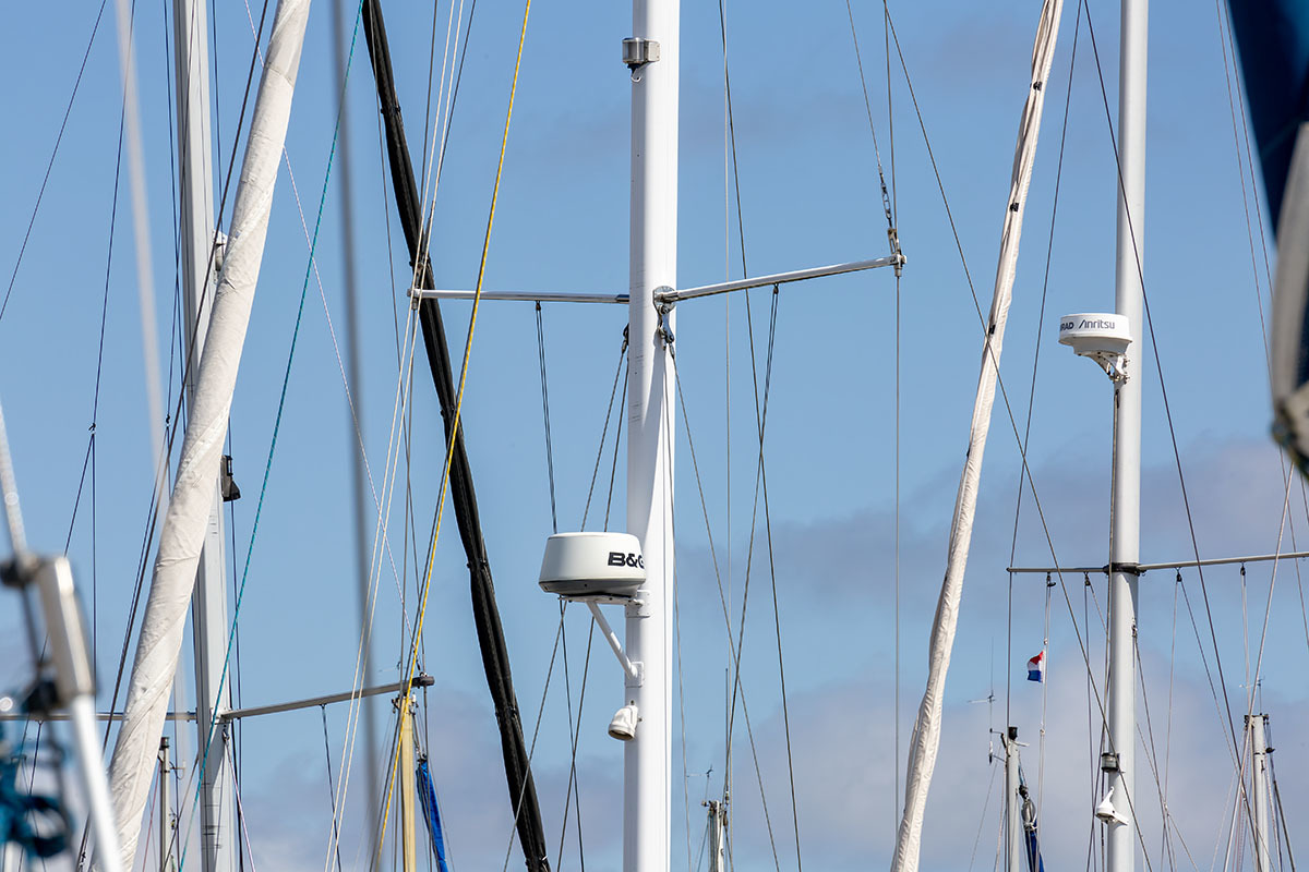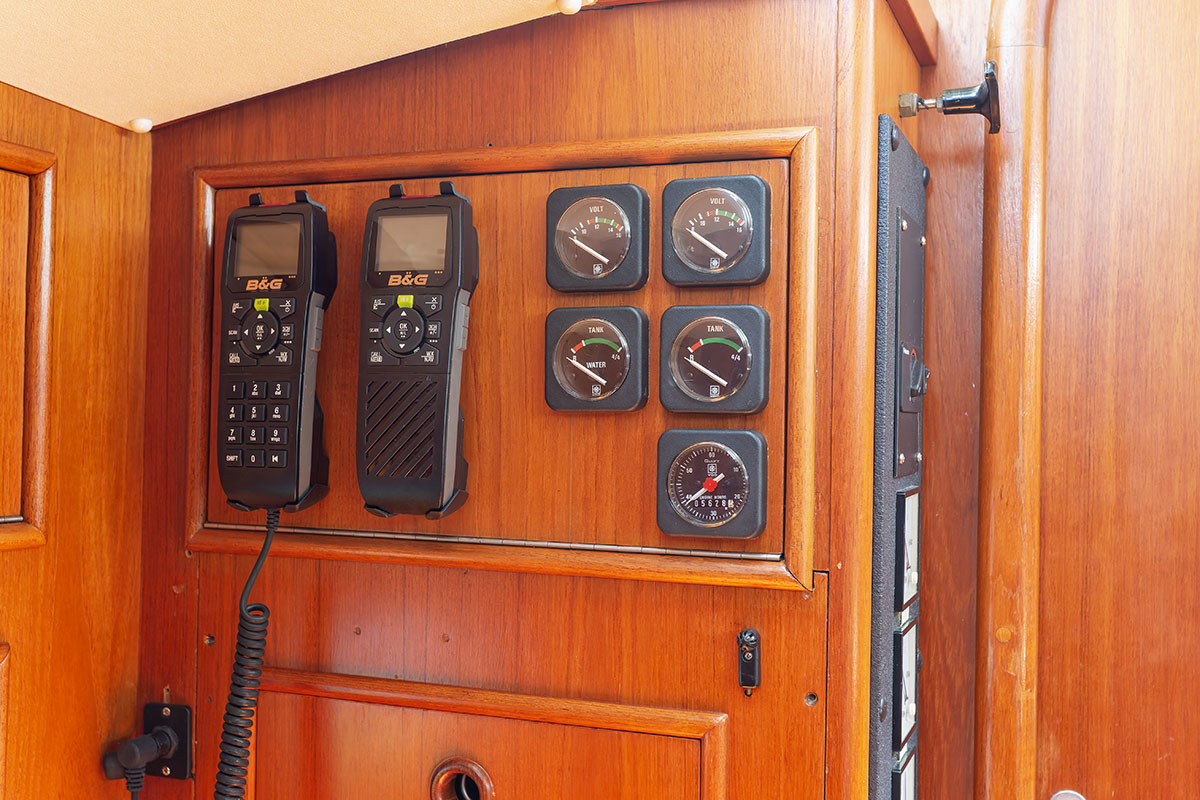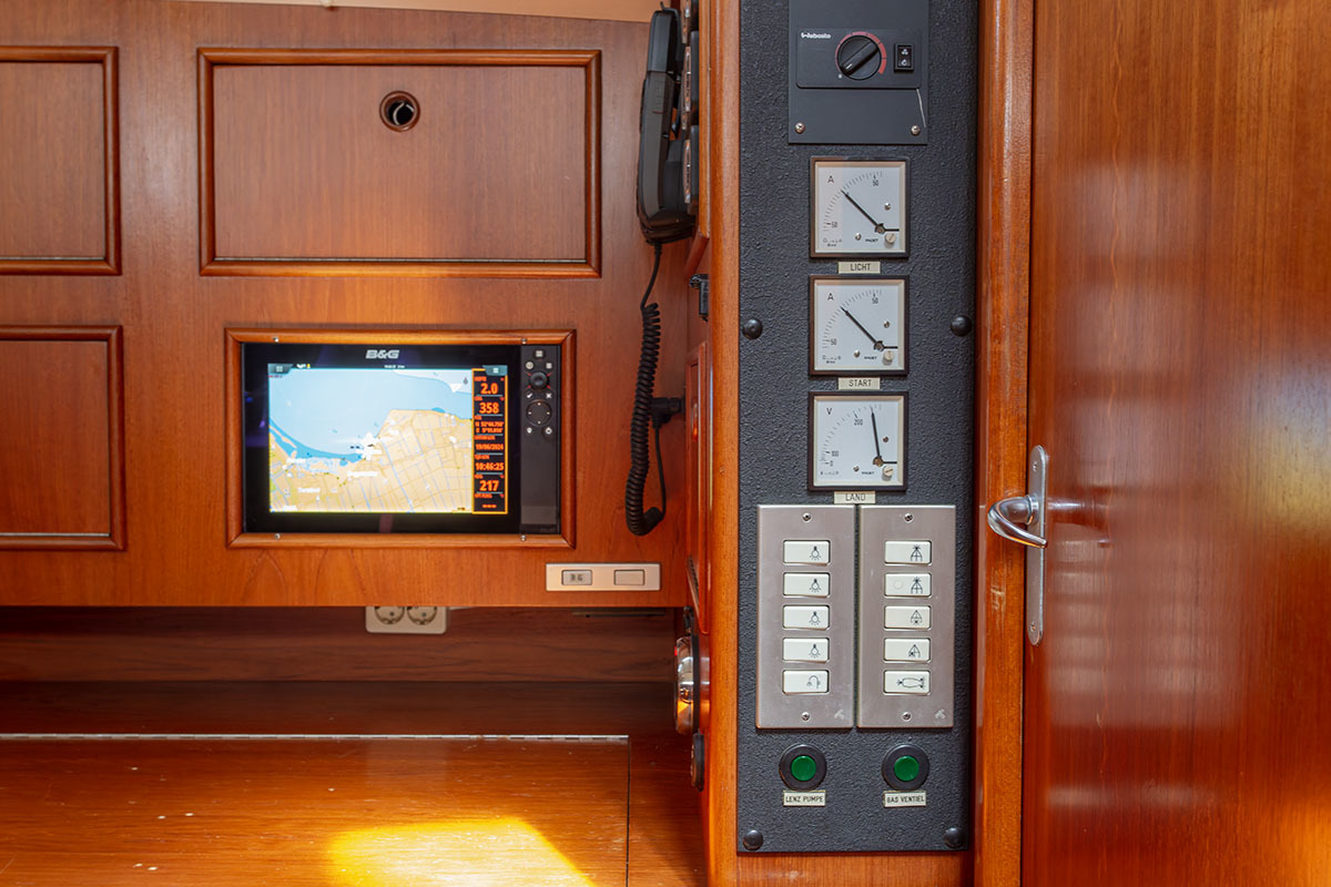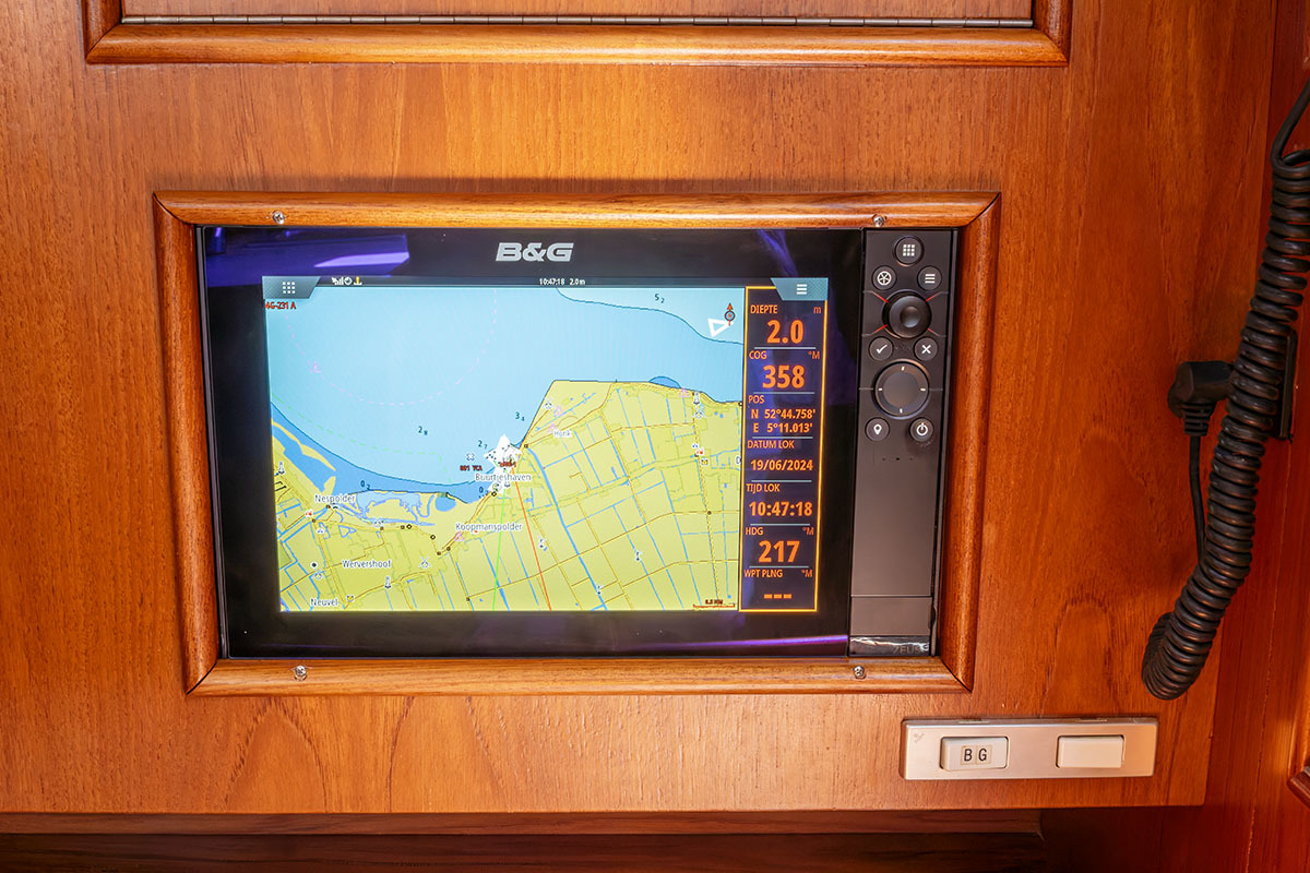 9 inch scherm op stuurstand en 12 inch scherm boven kaartentafel; SSB; V90 Black Box VHF AIS RX Systeem; korte golf radio: