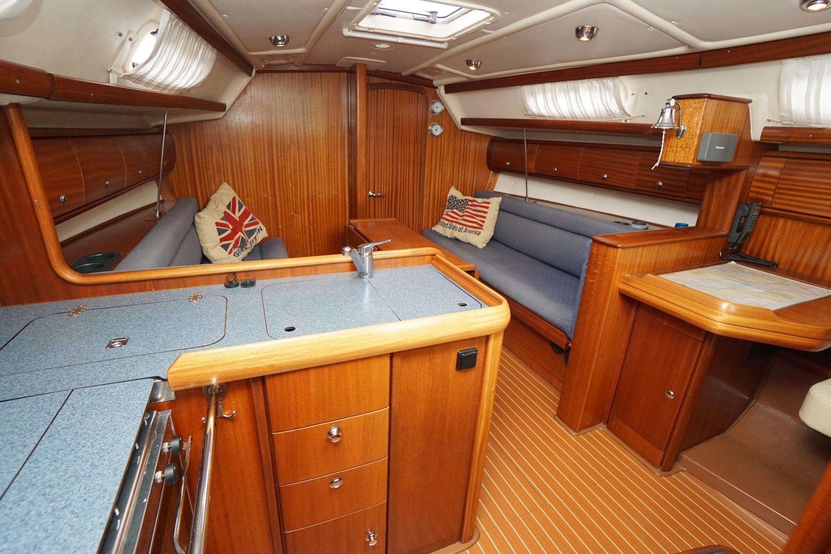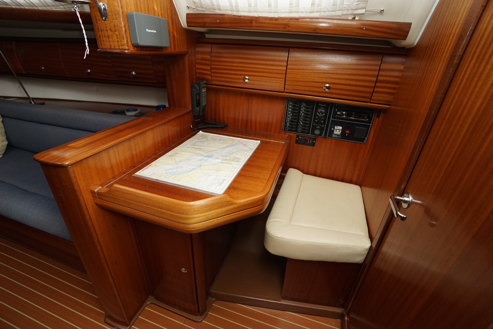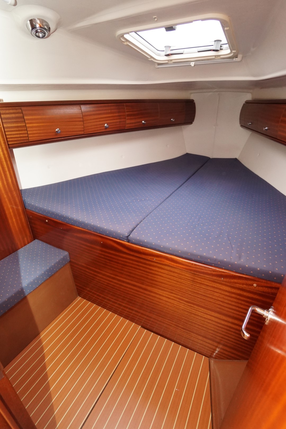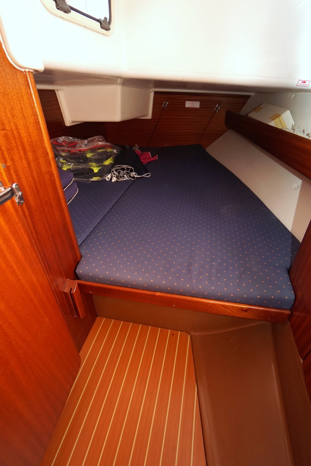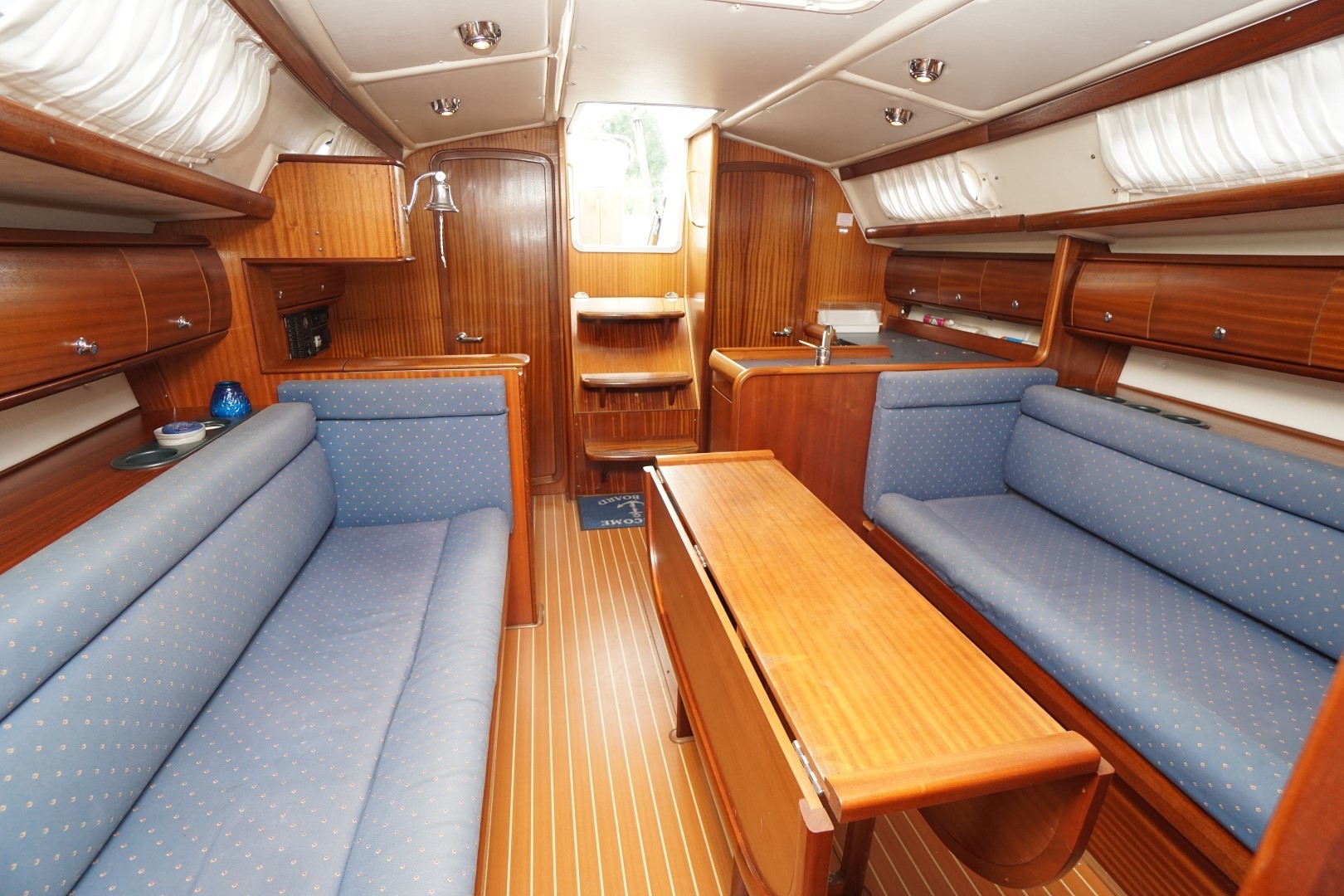 In het schip valt meteen de praktische indeling en nautisch sfeer op. Aan bakboord is een ruime kombuis, voorzien van 2-pits kooktoestel met oven, koelkast, warm en koud water en de nodige opbergruimte. Aan deze zelfde kant is ook de toegang tot de ruime achterhut. Aan stuurboord is de kaartentafel met GPS, marifoon en het schakelpaneel voor alle elektrische systemen. Bij de kaartentafel is ook de de toegang tot de zeer ruime natte cel. Deze Bavaria 36-2 heeft in deze twee hutten uitvoering een ruime natte cel en een riante bakskist. In de voorpiek is de eigenaarshut. Deze Bavaria 36-2 is de laatste jaren nauwelijks gebruikt en moet weer eens goed schoongemaakt worden maar ze is verder compleet uitgerust en vaarklaar voor een nieuwe eigenaar.  We nodigen u dan ook van harte uit om eens een afspraak voor een bezichtiging te maken. Wij zijn te breiken via 031 168 820 208 of email naar info@wwy.nl.