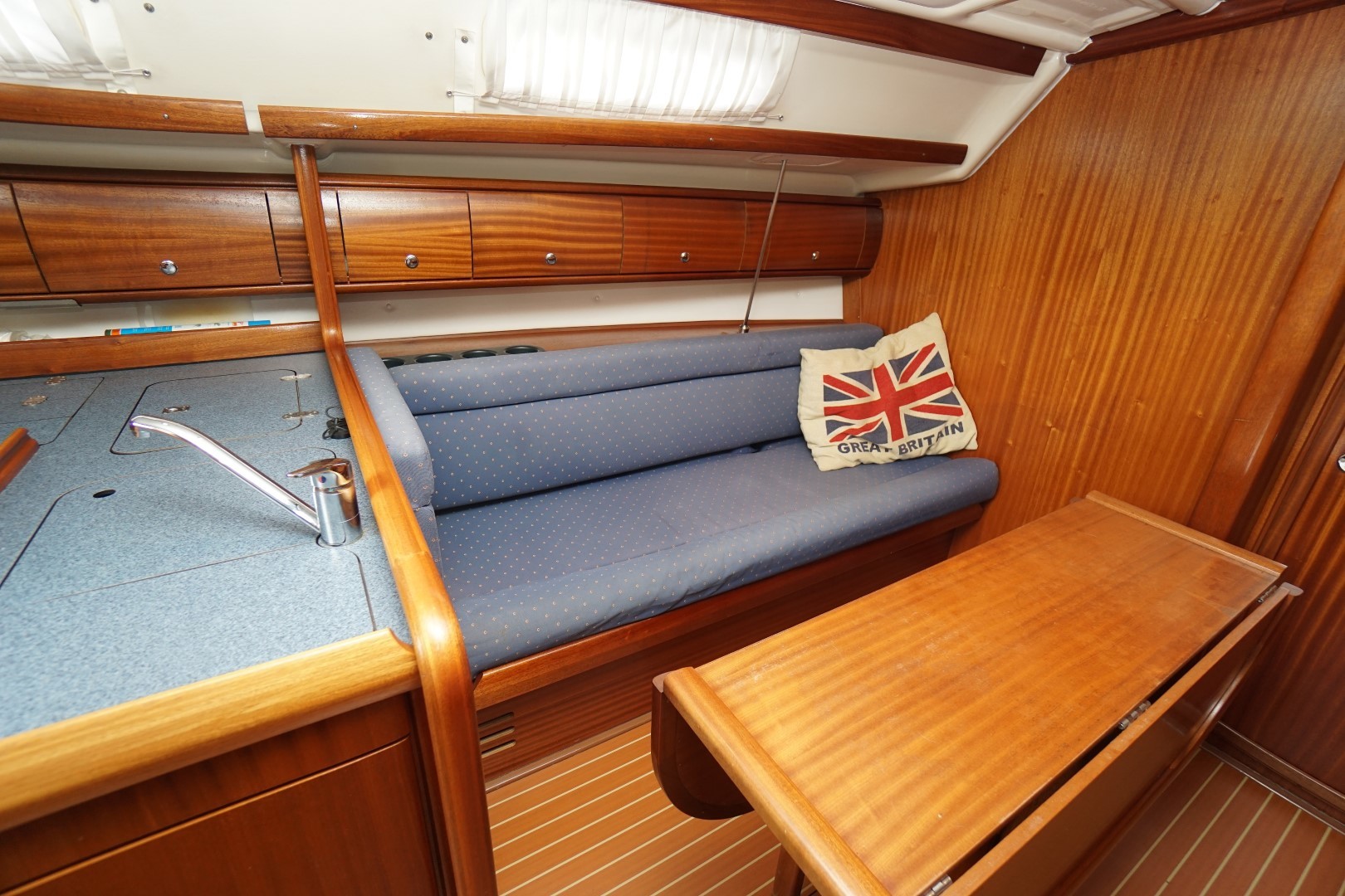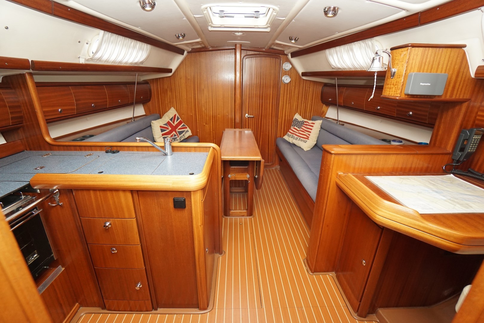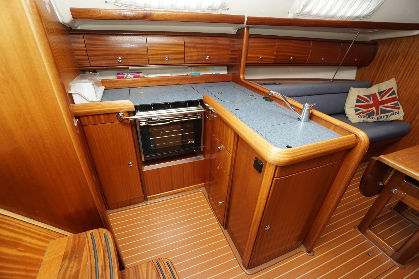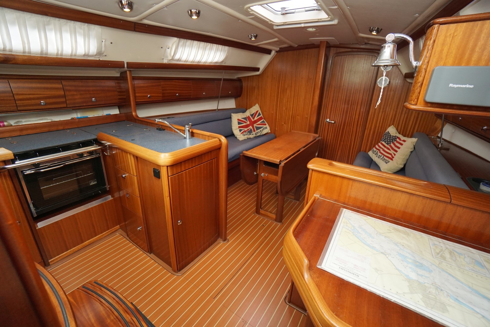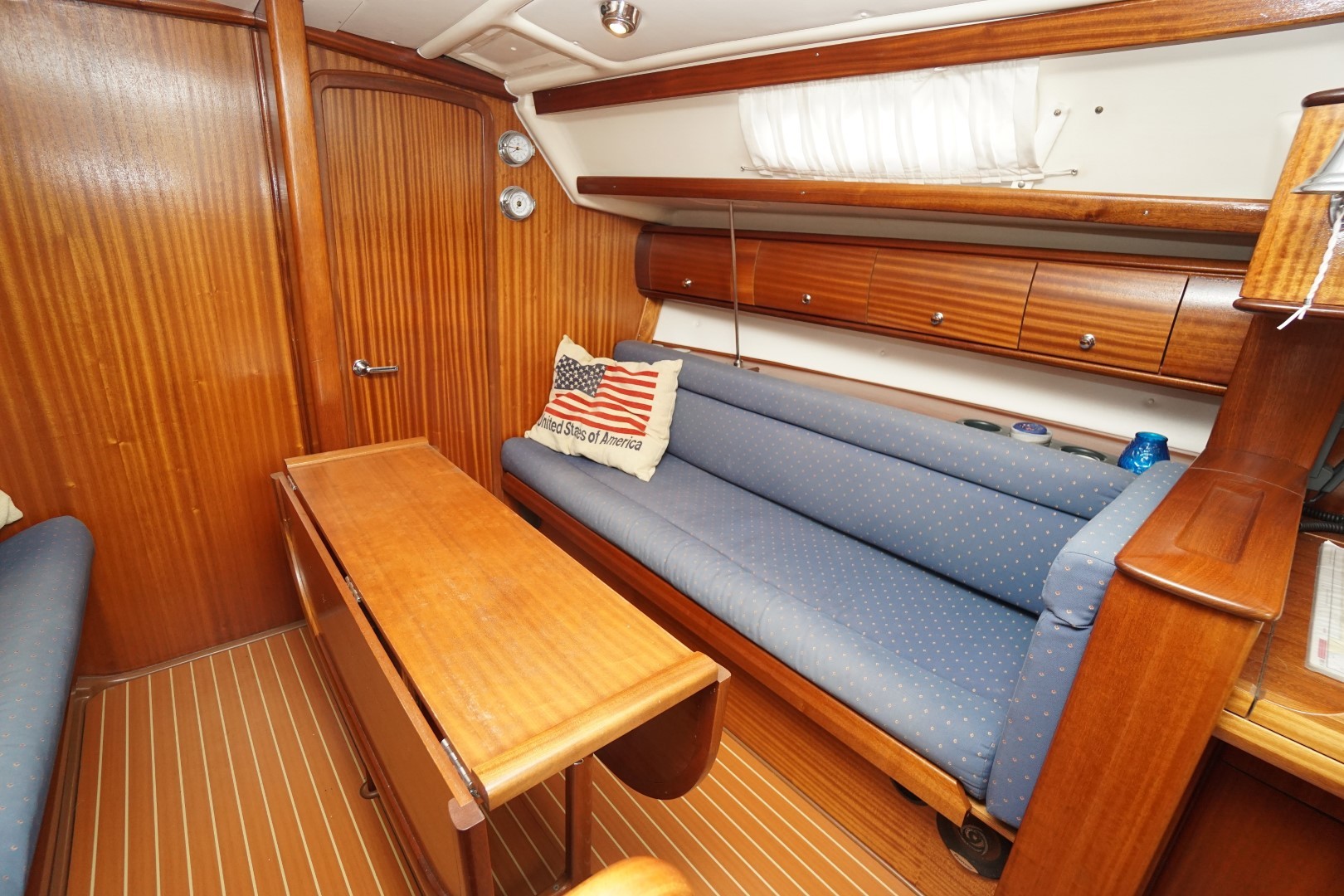 In het schip valt meteen de praktische indeling en nautisch sfeer op. Aan bakboord is een ruime kombuis, voorzien van 2-pits kooktoestel met oven, koelkast, warm en koud water en de nodige opbergruimte. Aan deze zelfde kant is ook de toegang tot de ruime achterhut. Aan stuurboord is de kaartentafel met GPS, marifoon en het schakelpaneel voor alle elektrische systemen. Bij de kaartentafel is ook de de toegang tot de zeer ruime natte cel. Deze Bavaria 36-2 heeft in deze twee hutten uitvoering een ruime natte cel en een riante bakskist. In de voorpiek is de eigenaarshut. Deze Bavaria 36-2 is de laatste jaren nauwelijks gebruikt en moet weer eens goed schoongemaakt worden maar ze is verder compleet uitgerust en vaarklaar voor een nieuwe eigenaar.  We nodigen u dan ook van harte uit om eens een afspraak voor een bezichtiging te maken. Wij zijn te breiken via 031 168 820 208 of email naar info@wwy.nl.