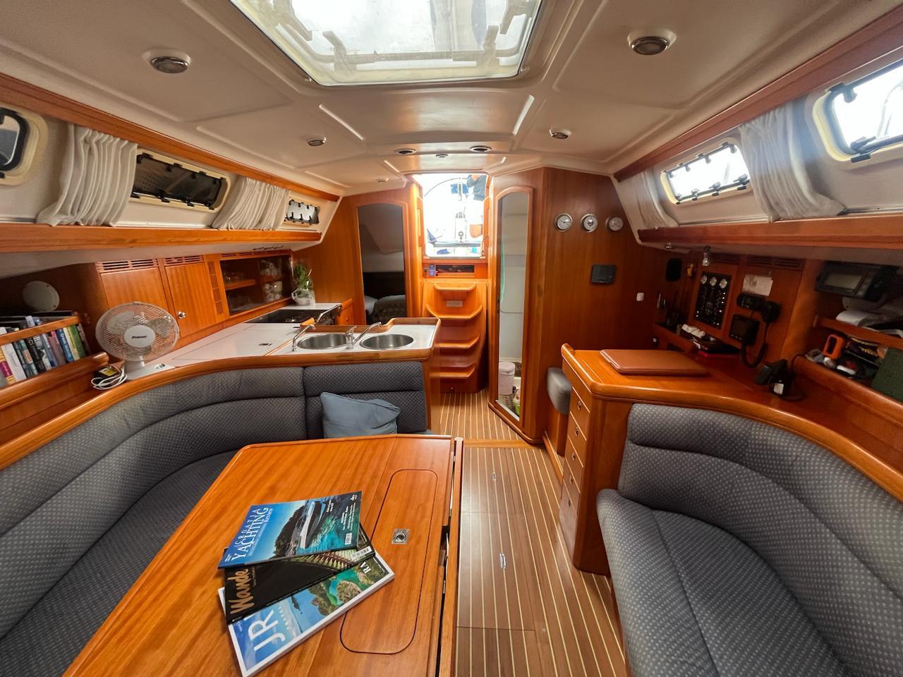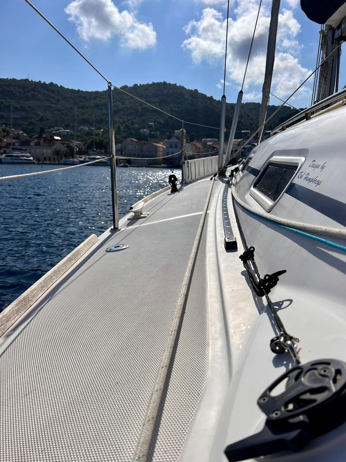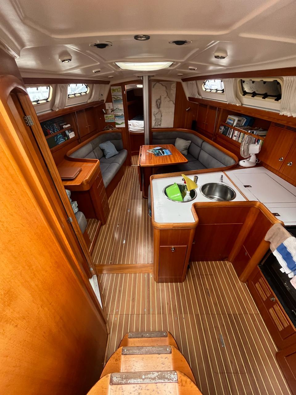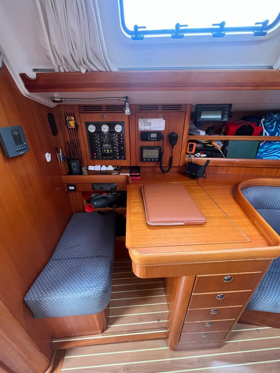She is powered by a Volvo Penta MD 2040 40hp engine and a folding propeller. She features a Selden Performance Rig, with mainsail replaced in 2021. and a full rigging check performed in 2022., and an extensive range of navigational equipment to support navigation in any sea.