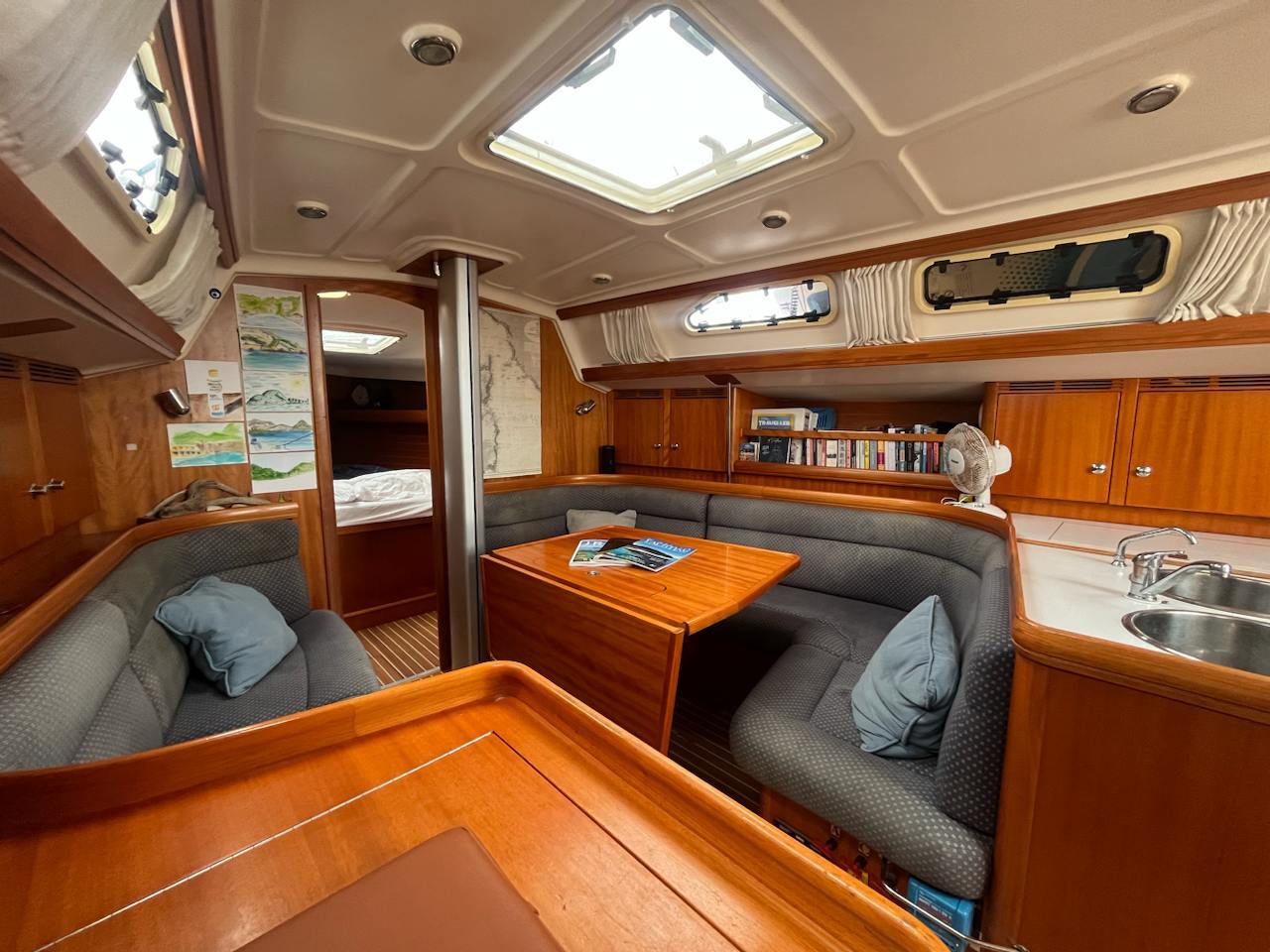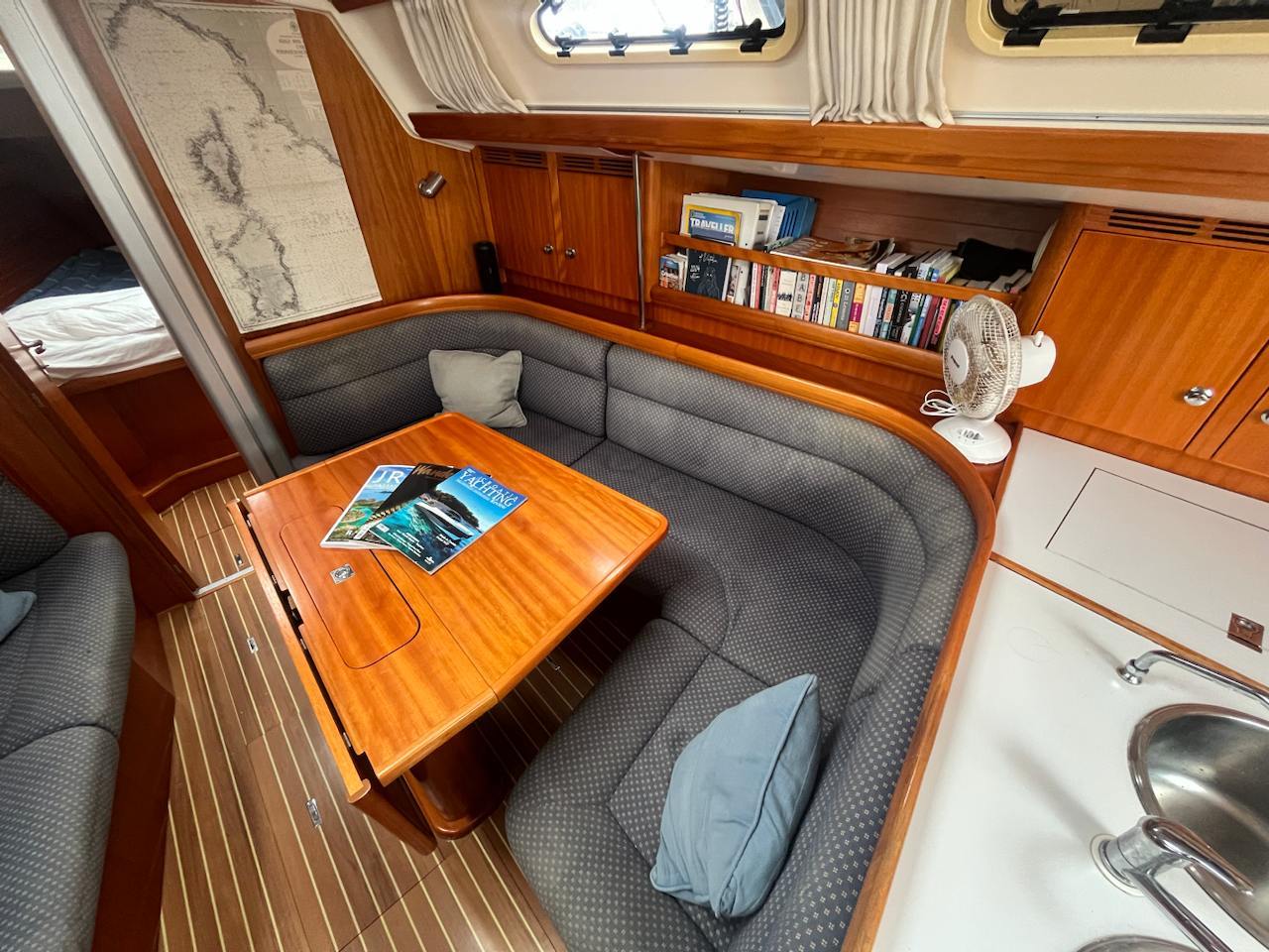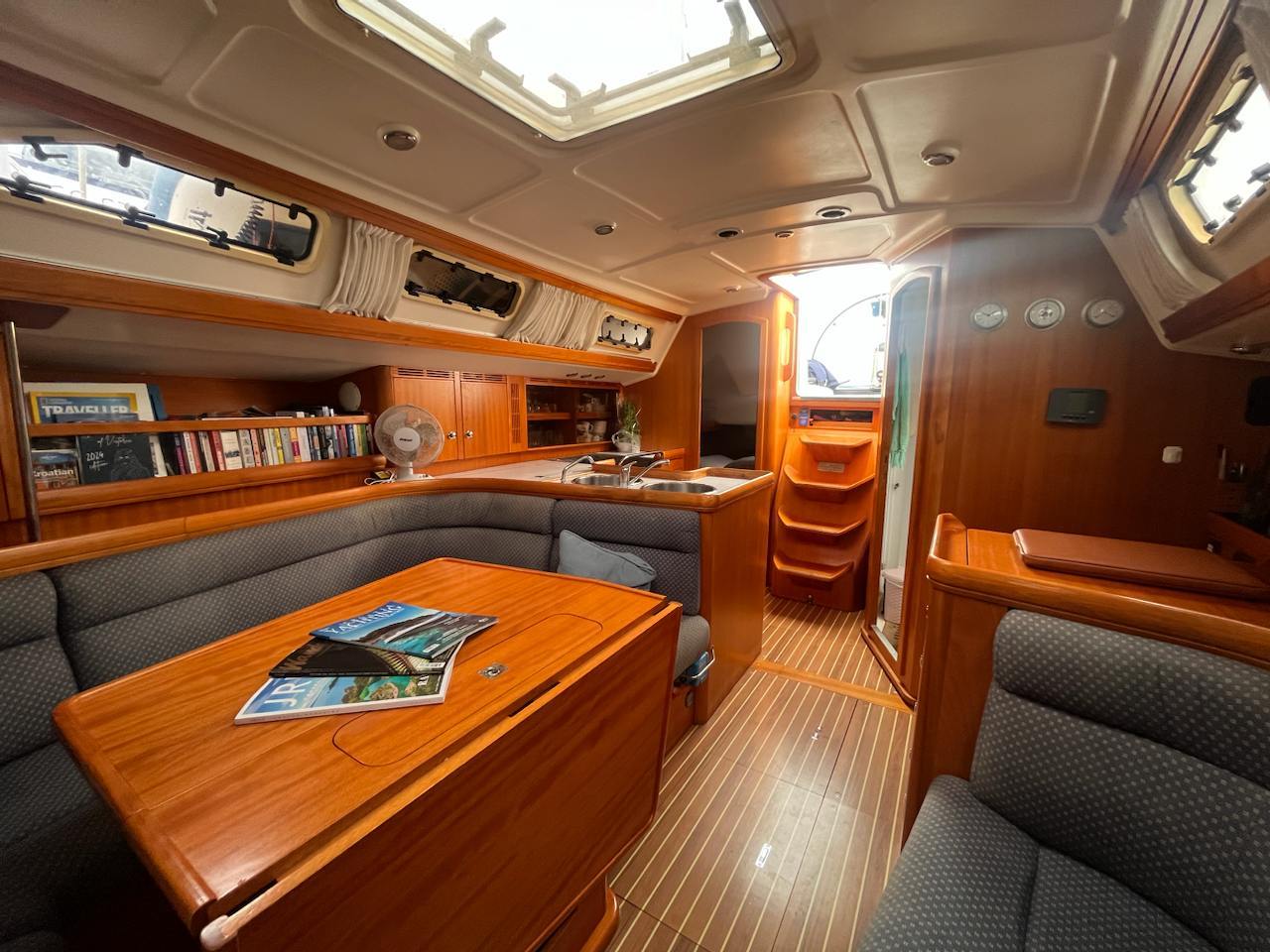Elan 40 designed by Rob Humphreys is recognized by many as a safe and reliable sporty family cruiser. She is built with the beautiful, classic mahogany interior design of two cabins and one very spacious head. Having the head instead of a third cabin layout provides a lot of extra storage in cockpit lockers.