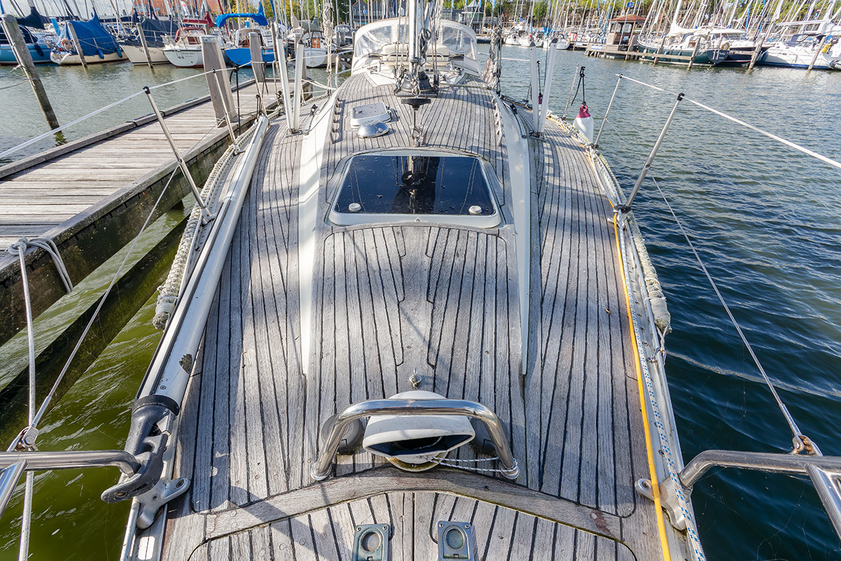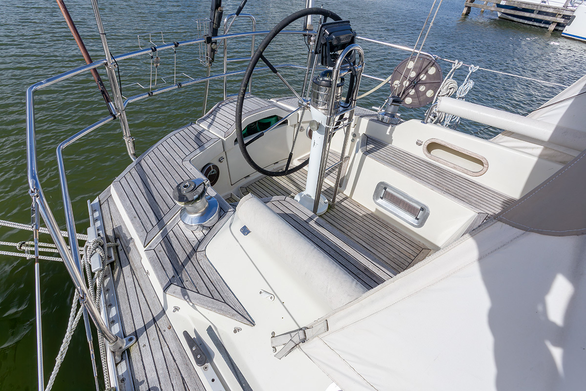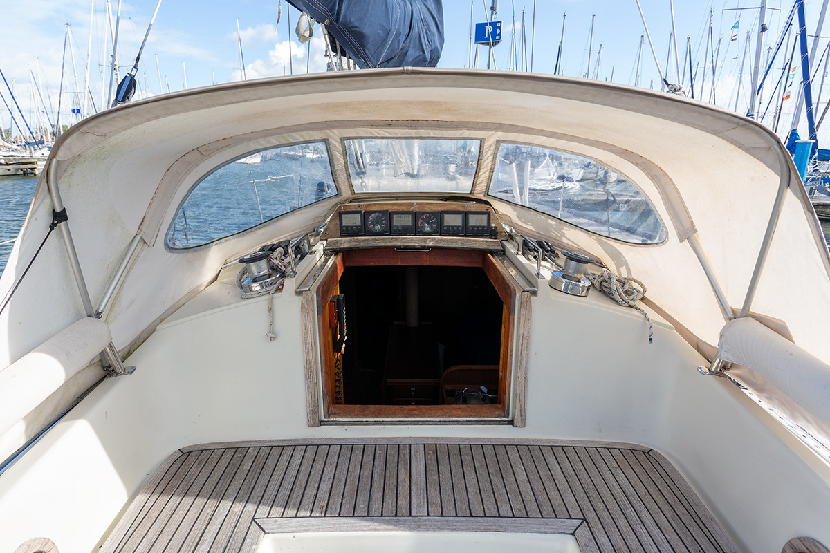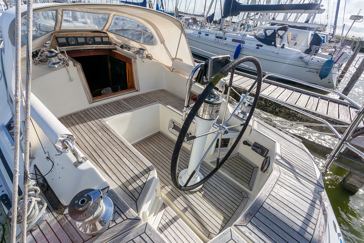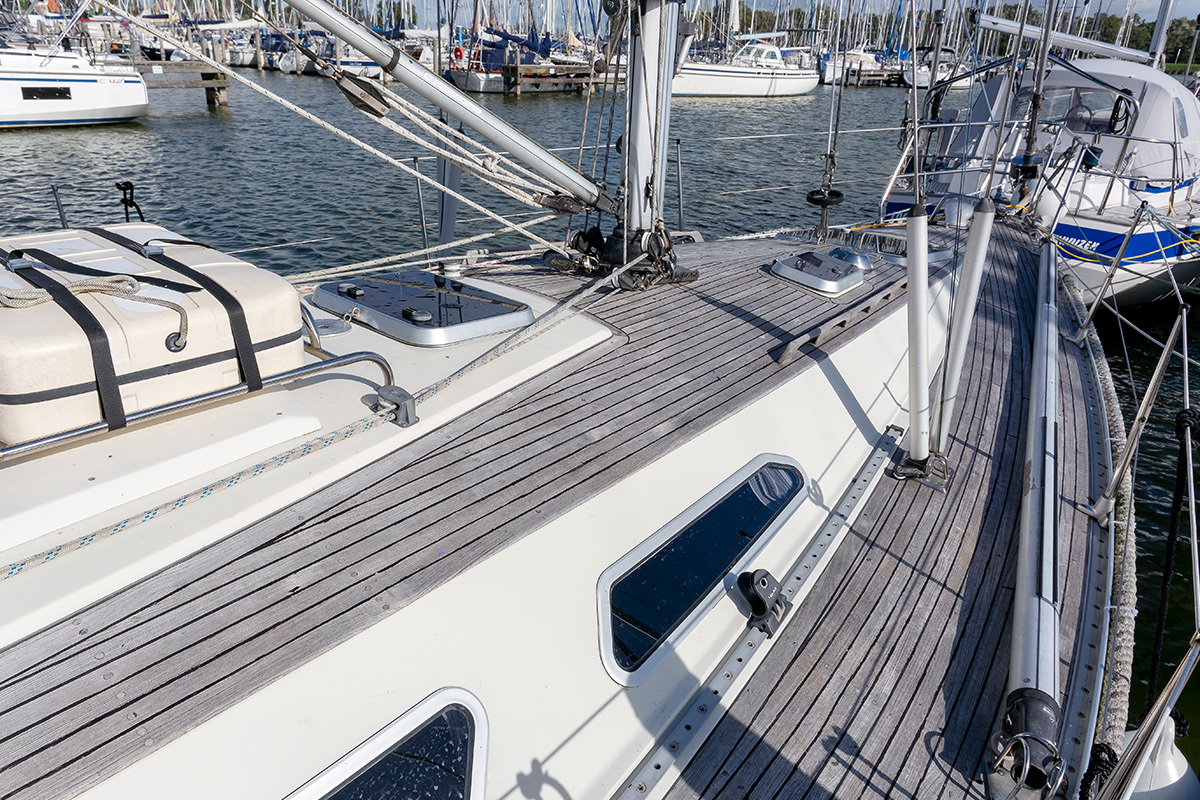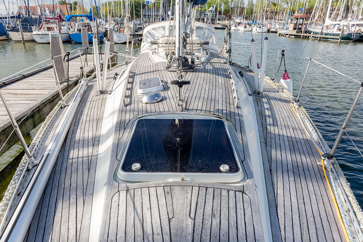 De Sweden Yachts werf heeft vele jaren kwalitatief hoogwaardige jachten gebouwd en zijn bij kenners vermaard om hun prestaties en zeewaardigheid. De Sweden 340 van het ontwerpduo Norlin-Ostman heeft fraaie klassieke lijnen en een stoere uitstraling. In de kuip zit men goed beschermd achter de buiskap, en is de boot goed te bedienen. Er zijn weervaste kussens voor de bemanning en de kuiprand voor een aangename zit op lange rakken. Het teak dek is nog origineel en behoeft wat werk zoals afdoppen van parkers en repareren van kitnaden. De eigenaar onderhoudt het dek regelmatig en het ligt deugdelijk vast en is lekvrij.